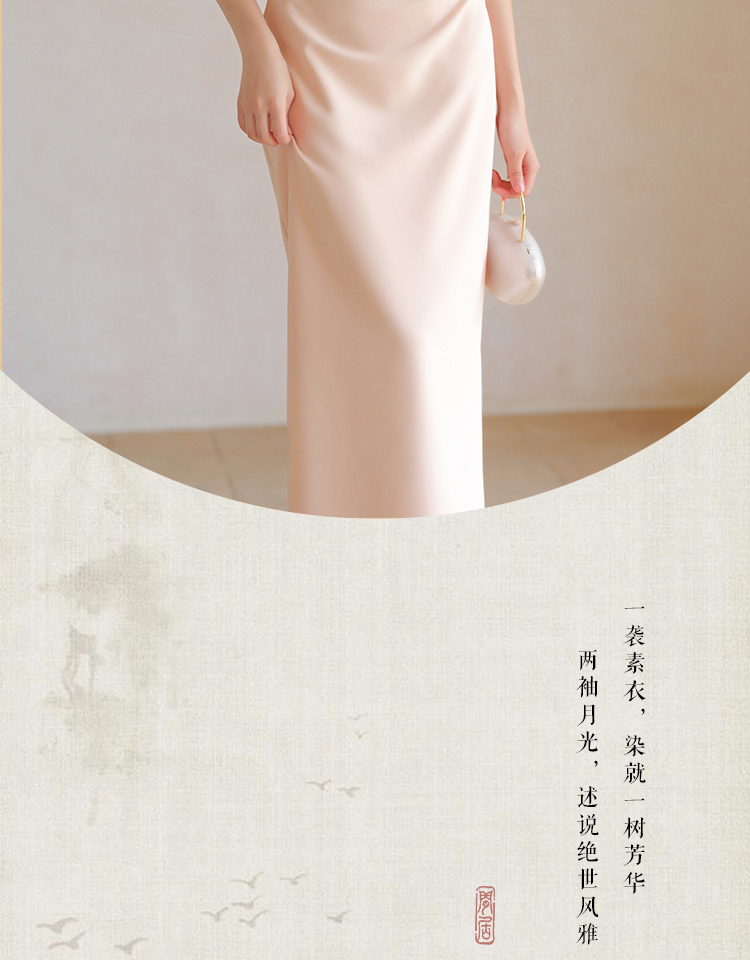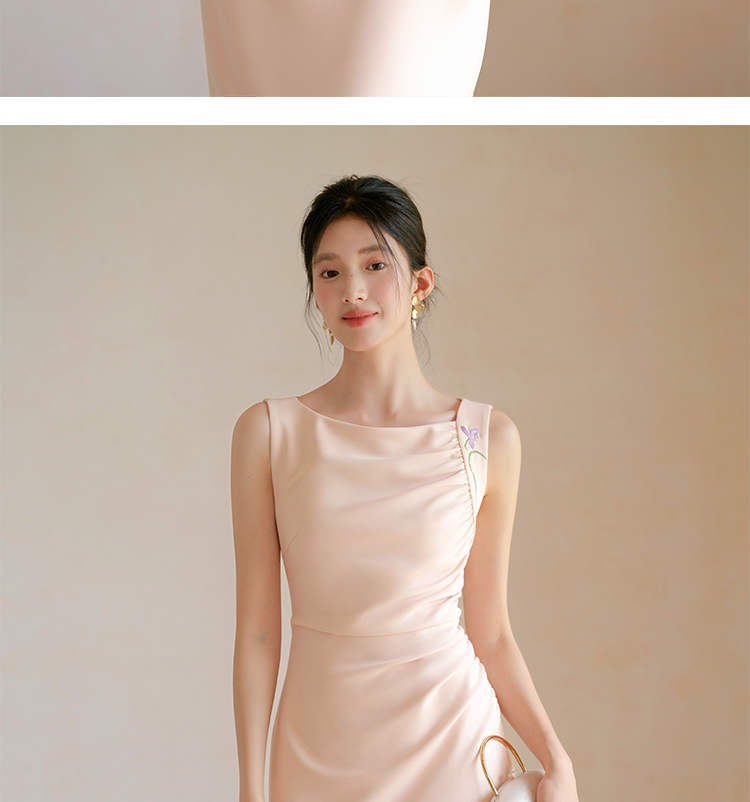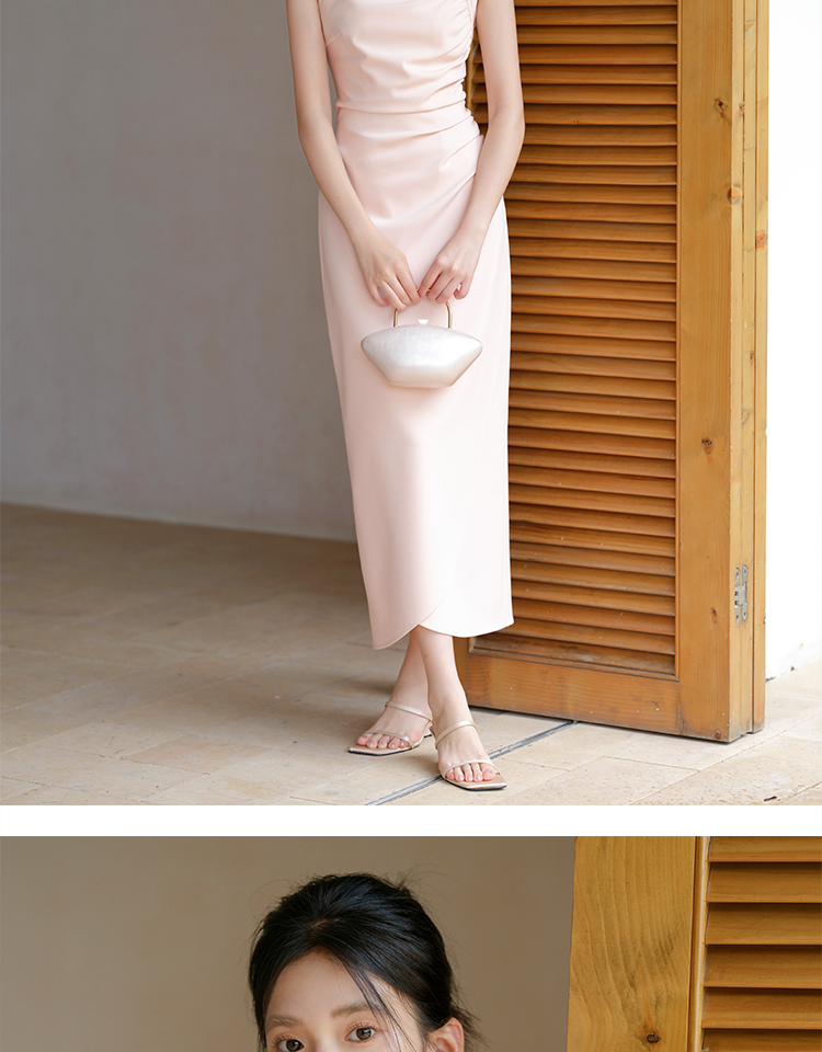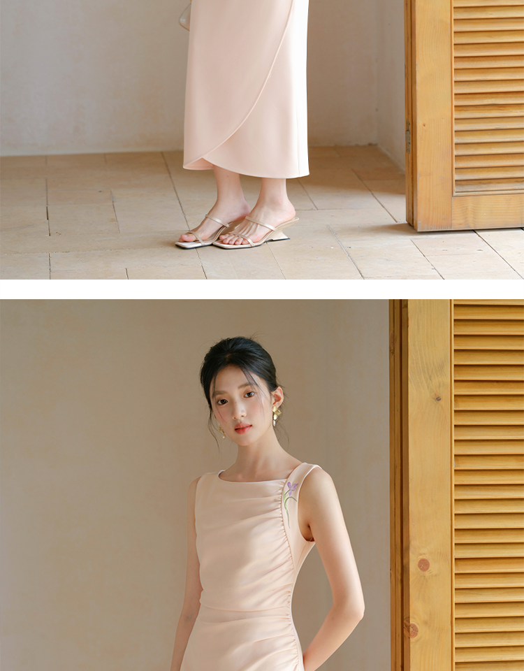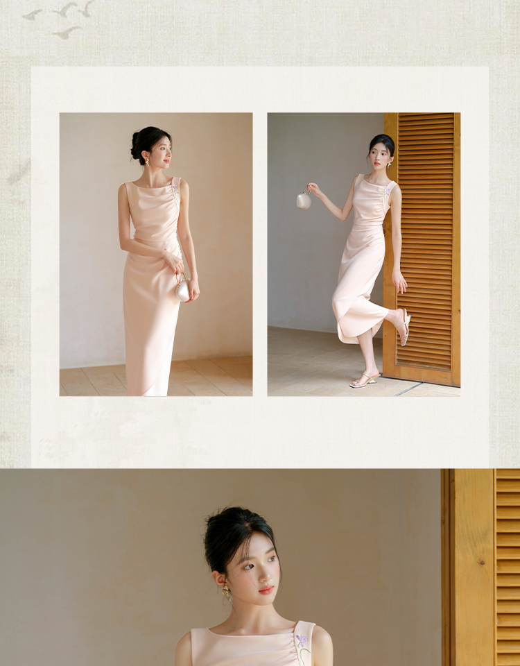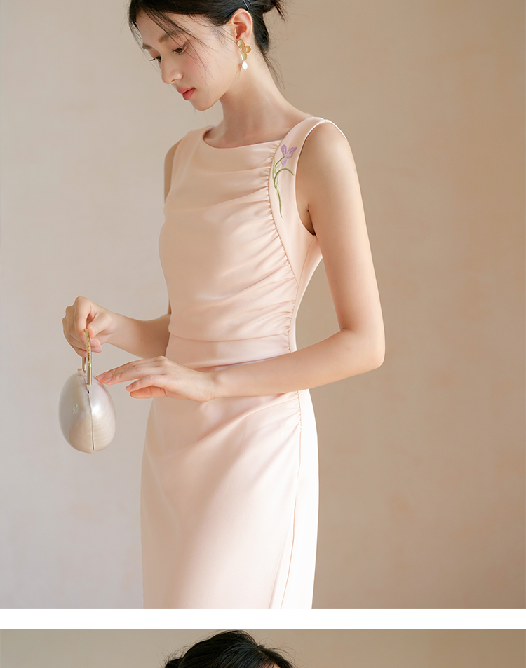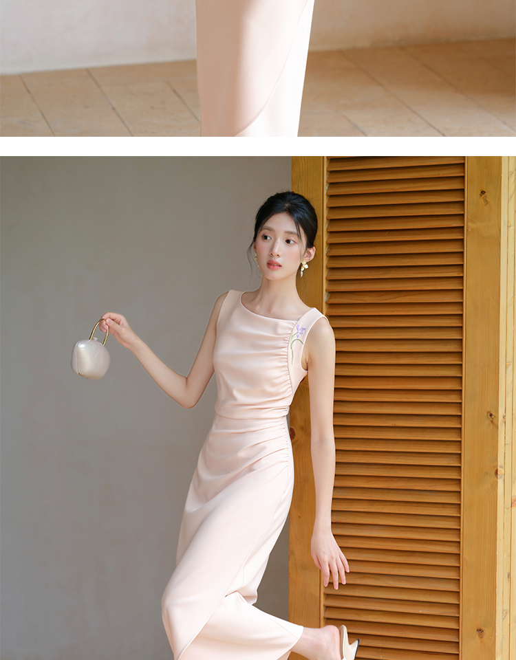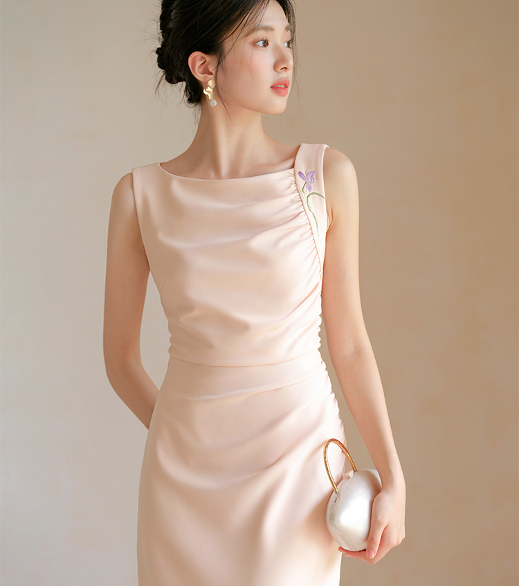 Chic and Elegant Champagne Pink Dress for Women, Summer 2025, High-End, Graceful, Waist-Cinching, Pleated, Light Formal Long Dress