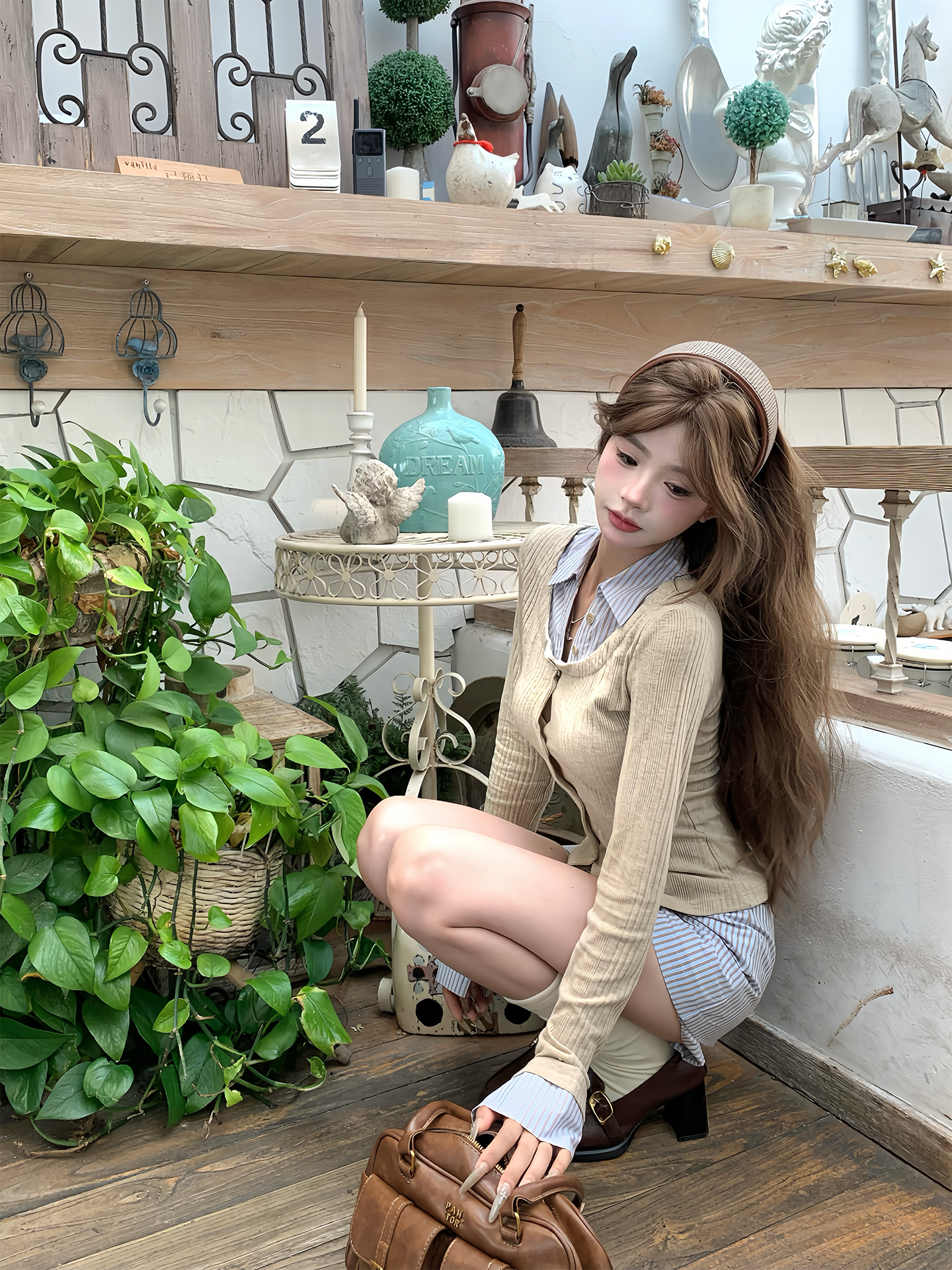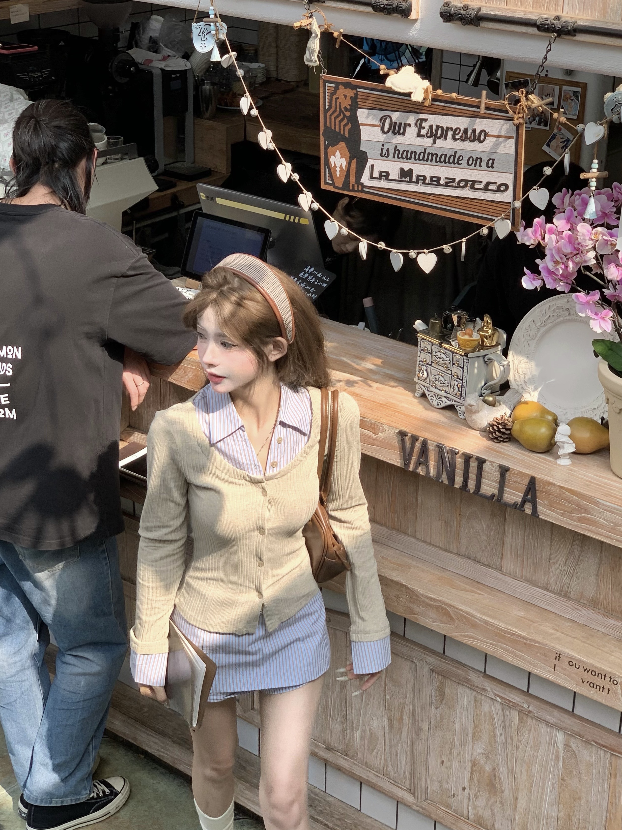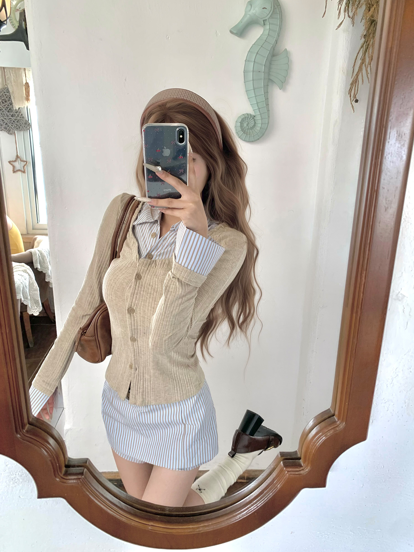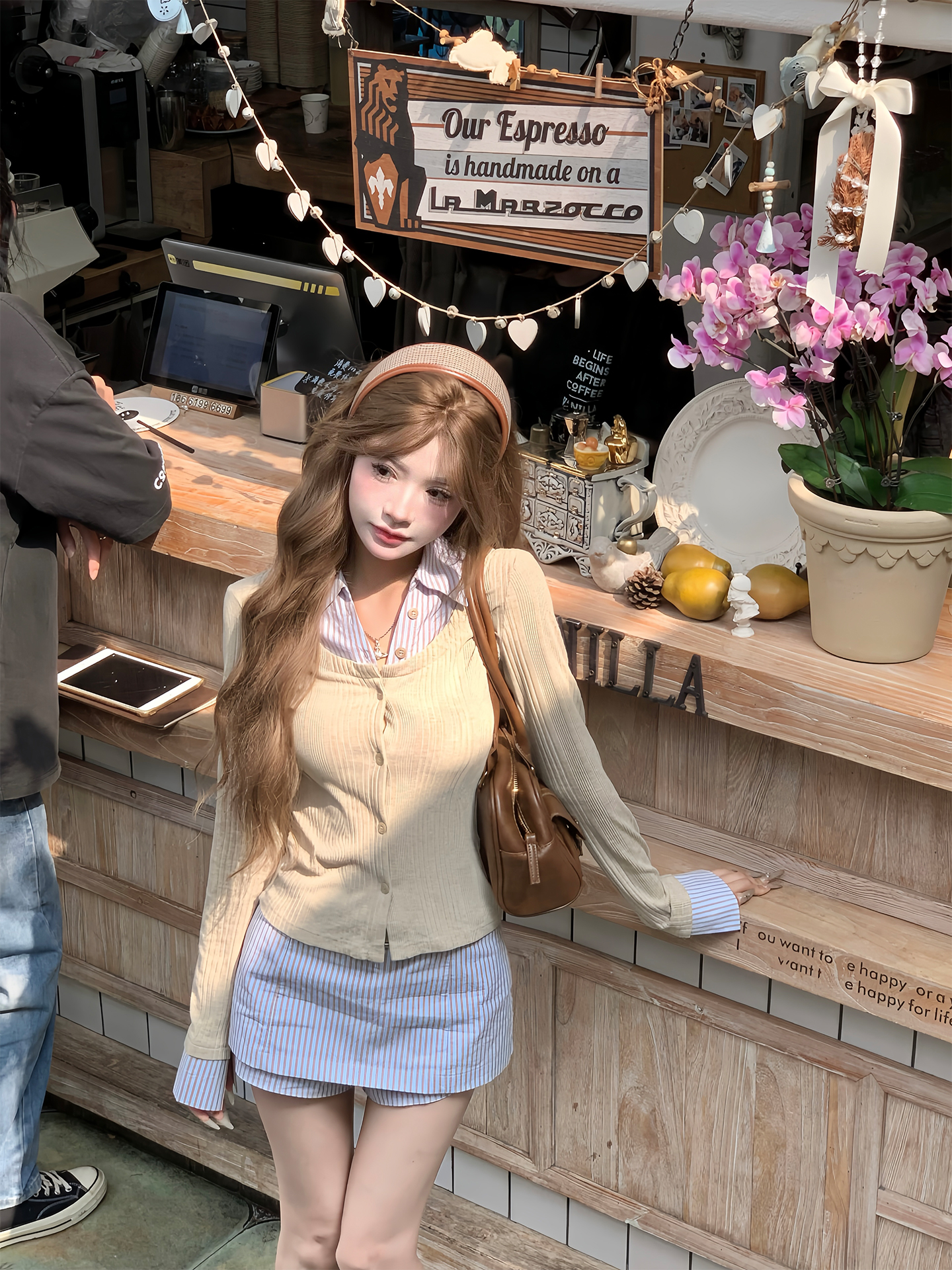 Seven-Piece Shrimp Paste Faux Two-Piece Shirt for Women, 2025 New Autumn Top, Paired with a Complete Korean-Style Outfit Set and Skirt