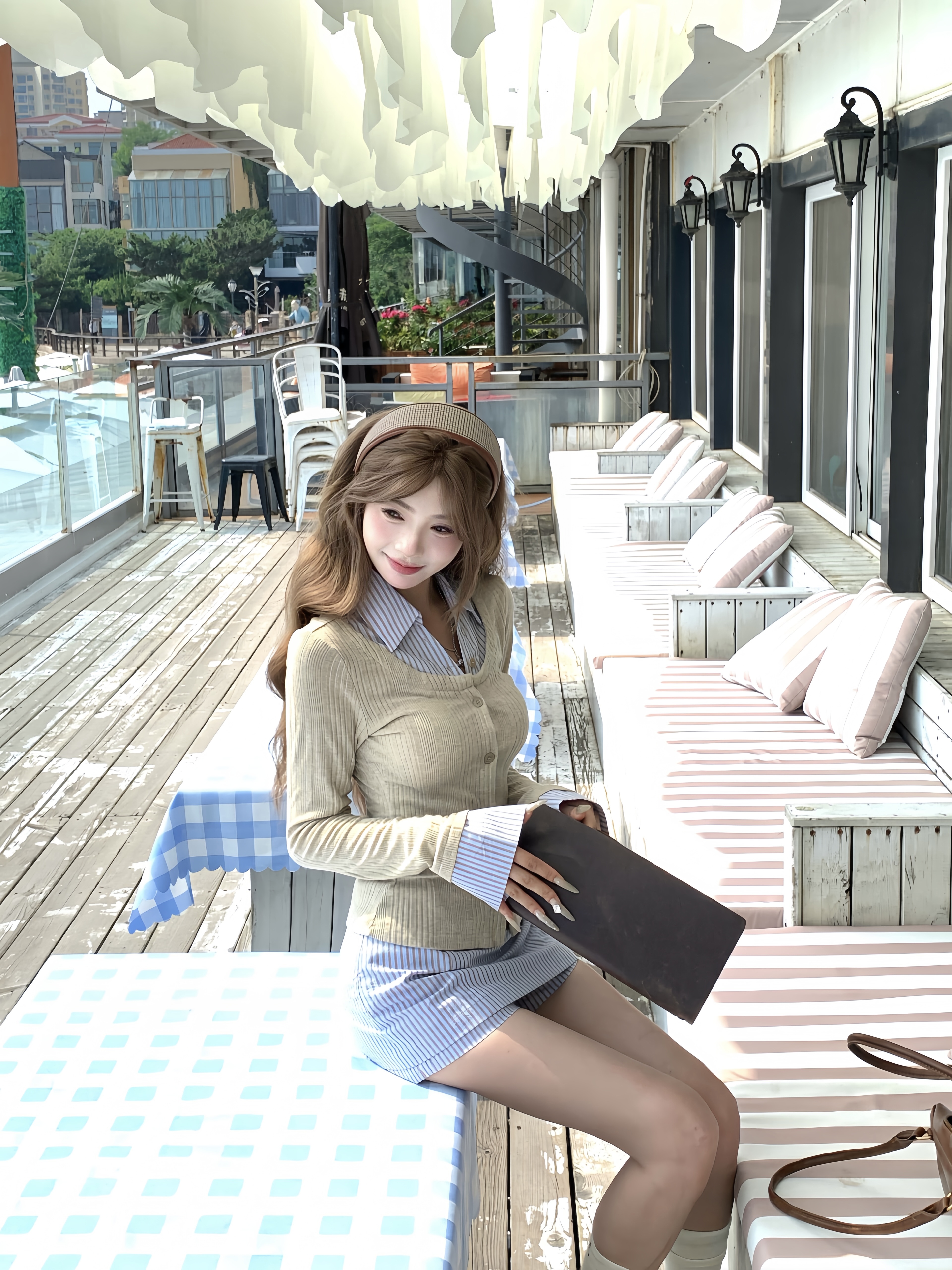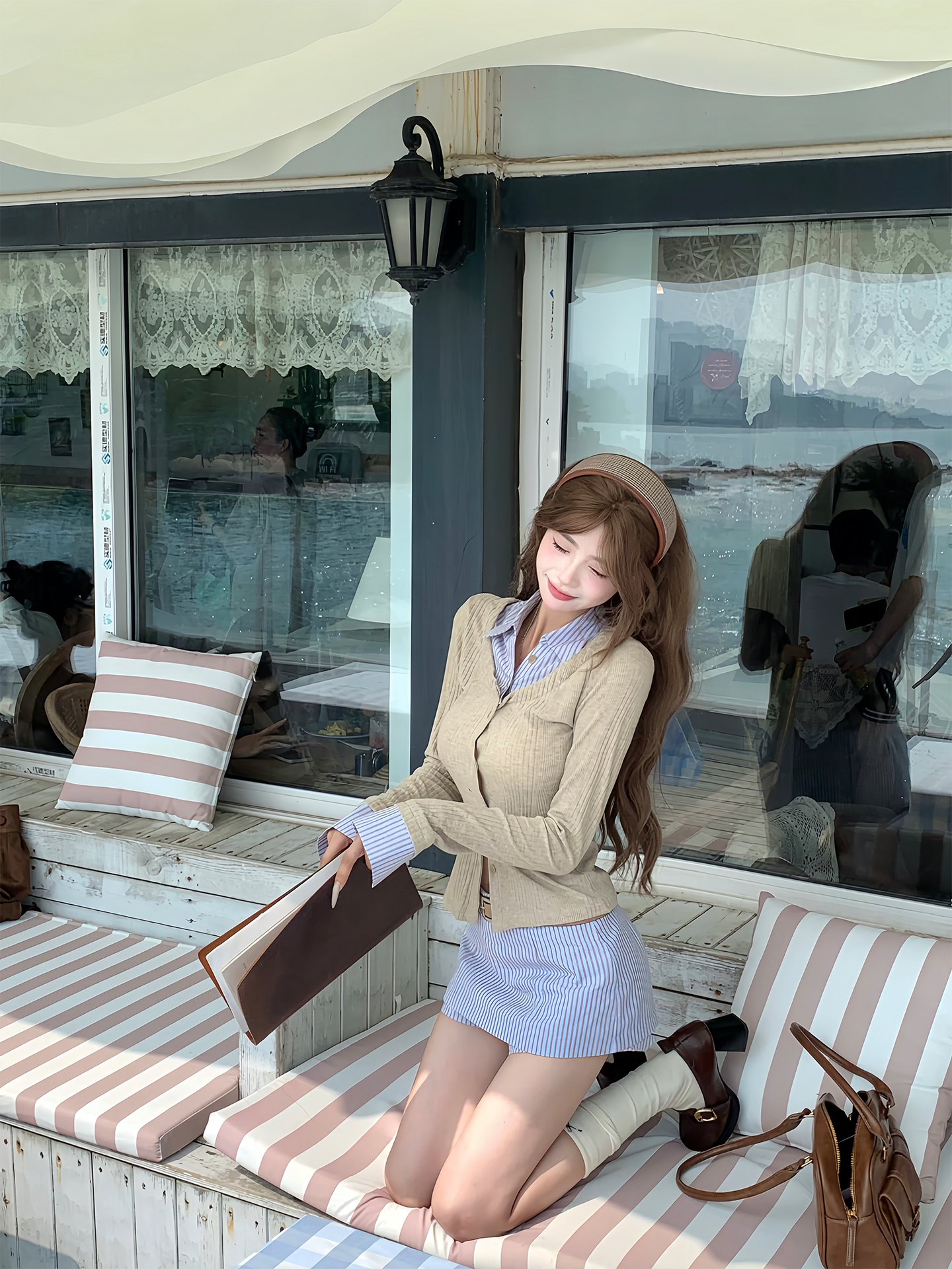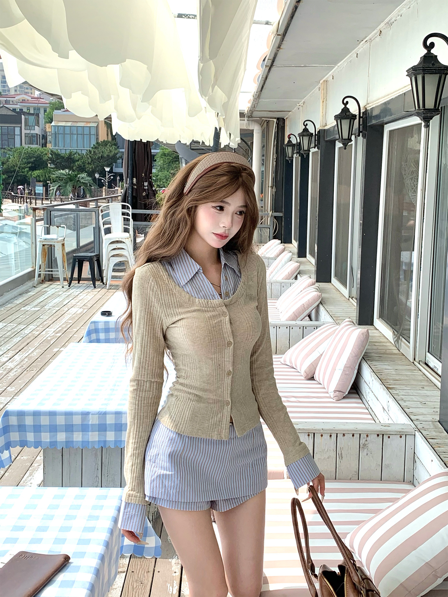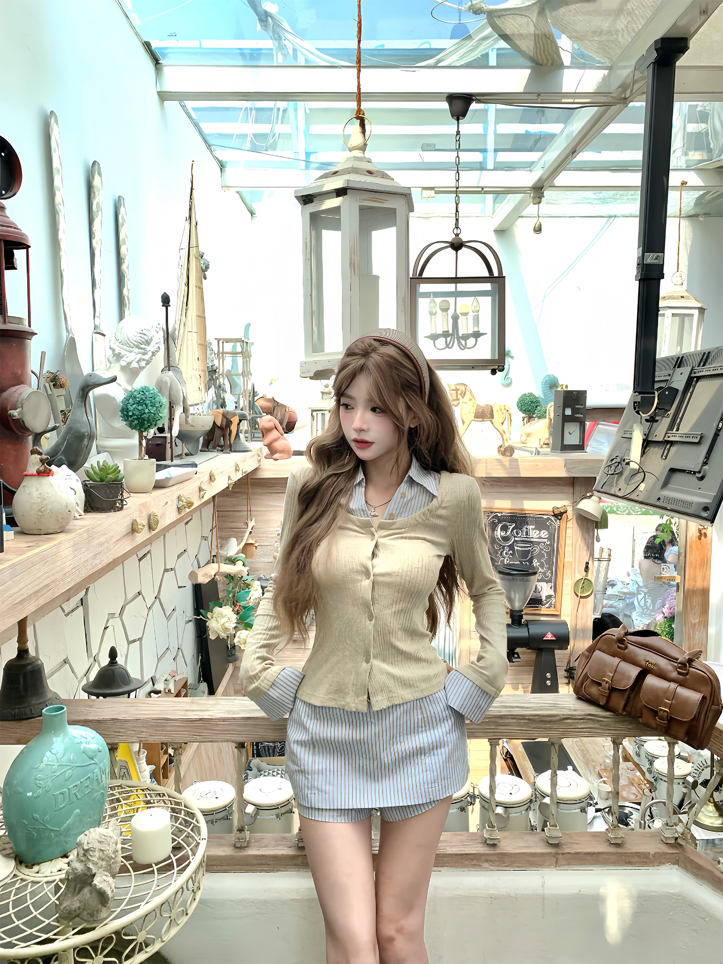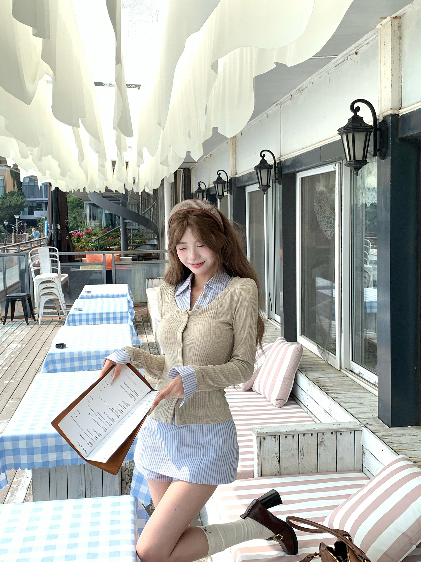 Seven-Piece Shrimp Paste Faux Two-Piece Shirt for Women, 2025 New Autumn Top, Paired with a Complete Korean-Style Outfit Set and Skirt