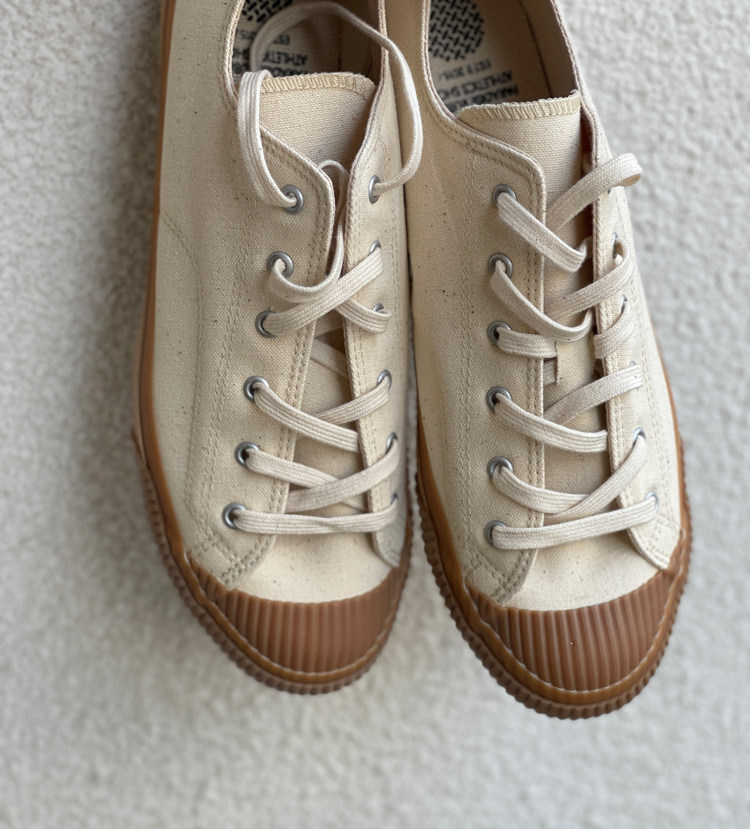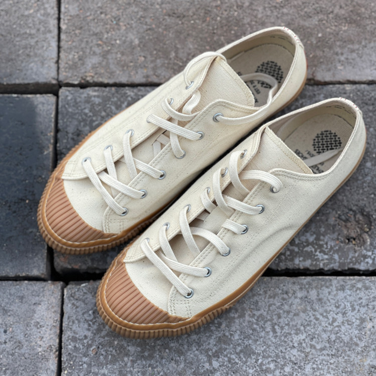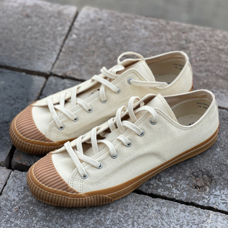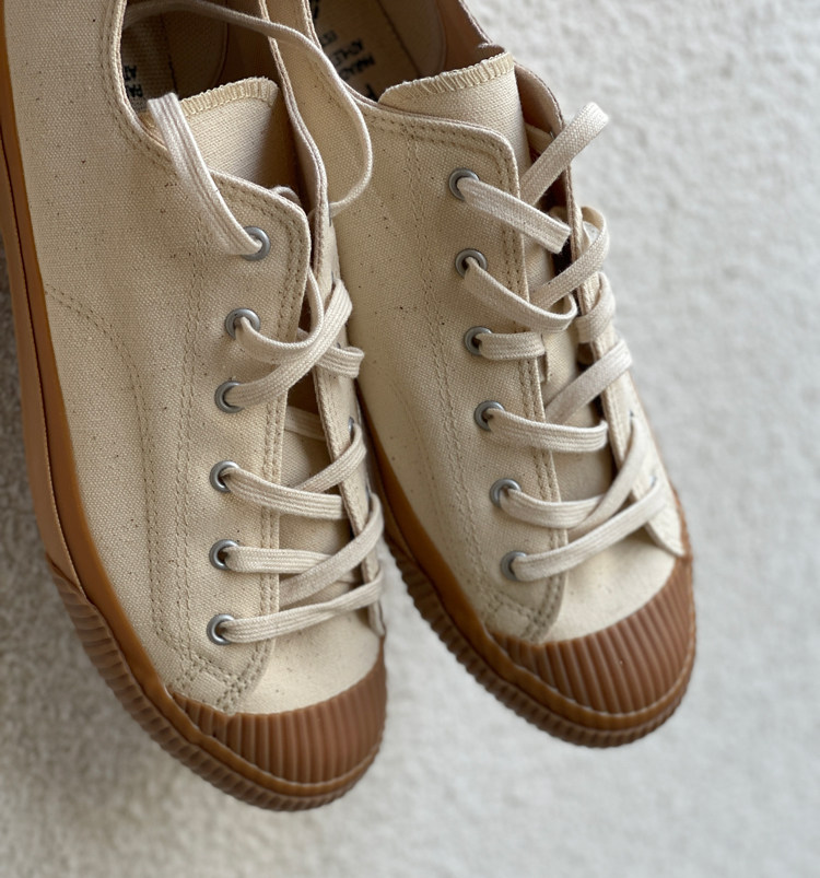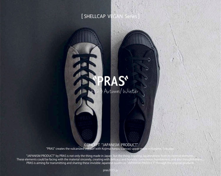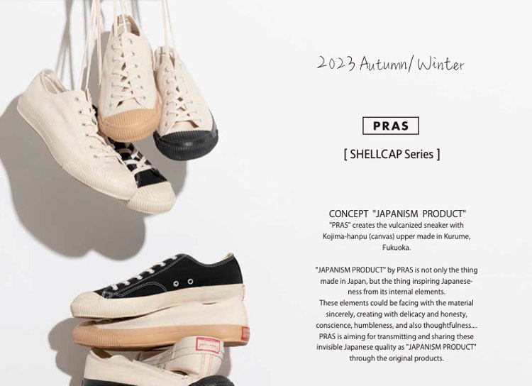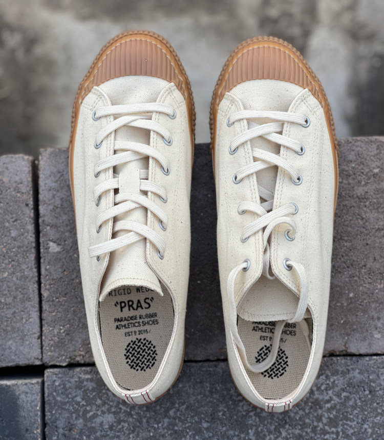 PRAS 日本帆布鞋品牌,产品使用特制 Kojima 日本帆布,厚度适宜,产品呈现十分复古的棉质纹理感,鞋子都交给 Moon Star 来做代工,MS 有名的久留米工艺加持下,这个品牌的帆布鞋经久耐穿,且舒适自然,鞋子楦型灵感源于1940年代美军室内训练鞋
