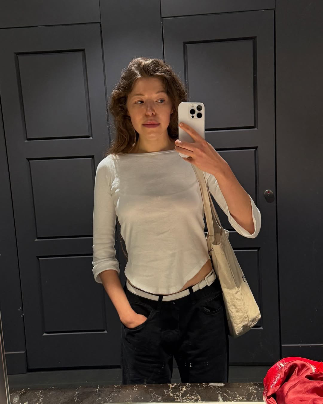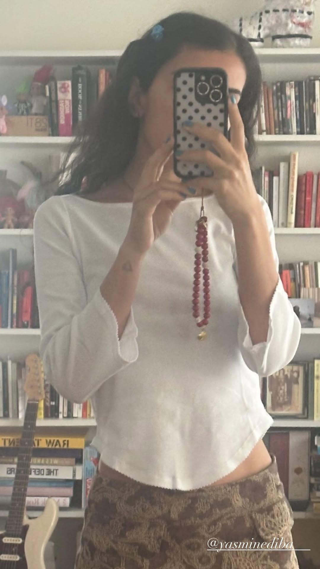 Coucou White Three-Quarter Sleeve Top, One-Shoulder Boat Neck Short Style with Lace Design, Black Vintage Bell Sleeves
