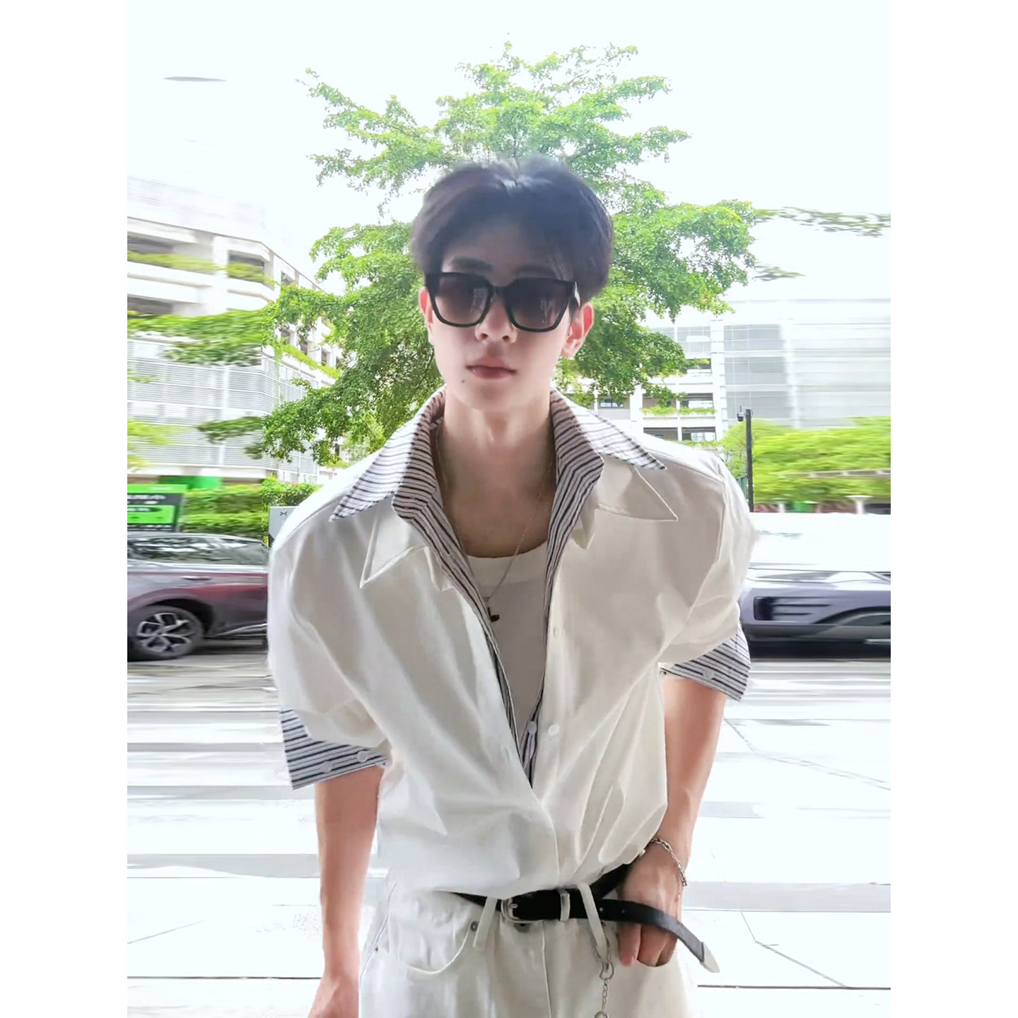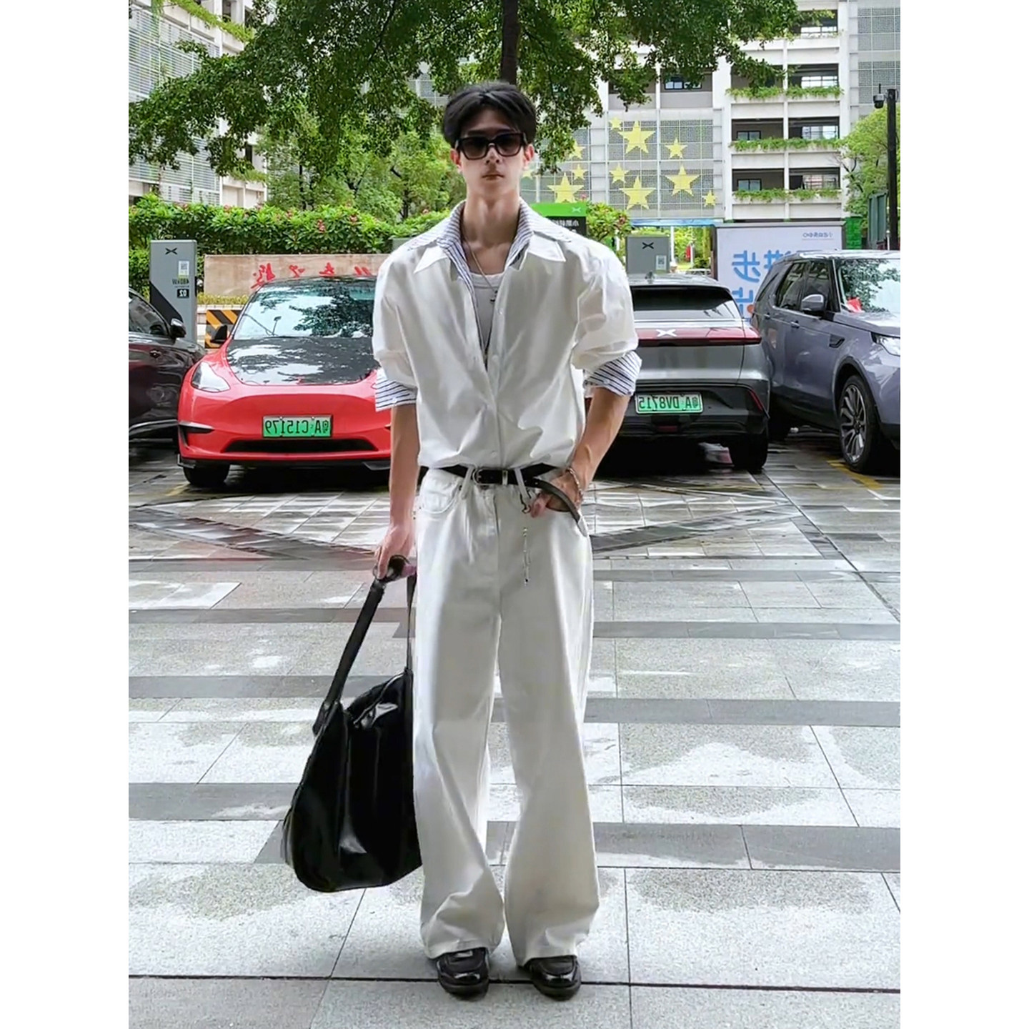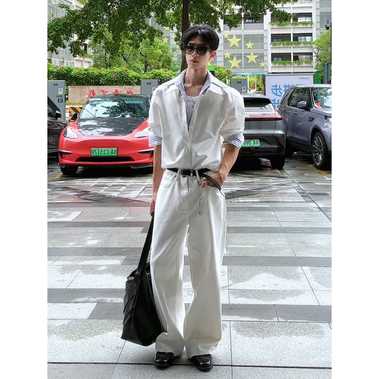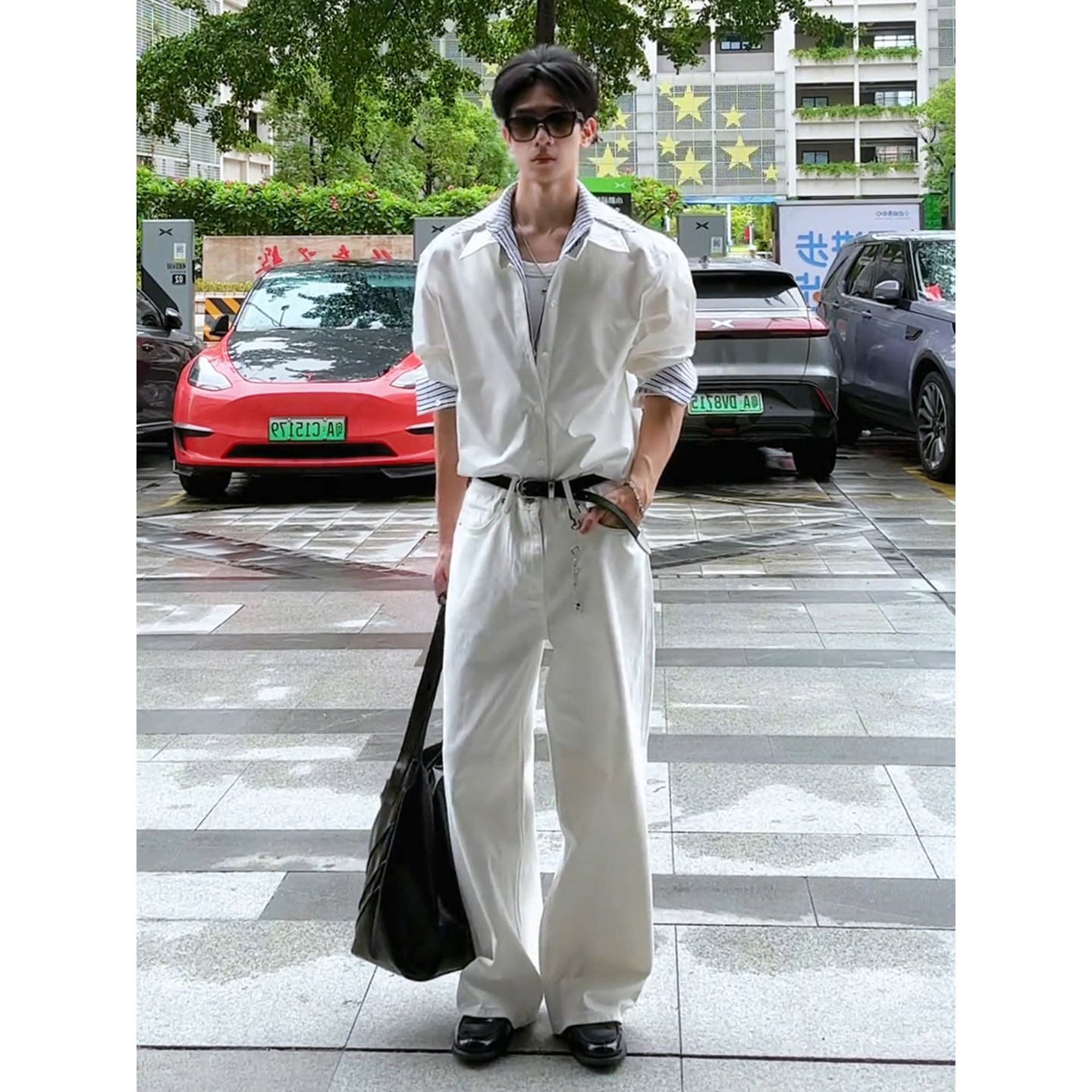 Cool and Stylish Men's Outfit Set for Spring and Autumn, American-Style Faux Two-Piece Striped Long-Sleeve Shirt with a Unique Design and Scimitar Jeans