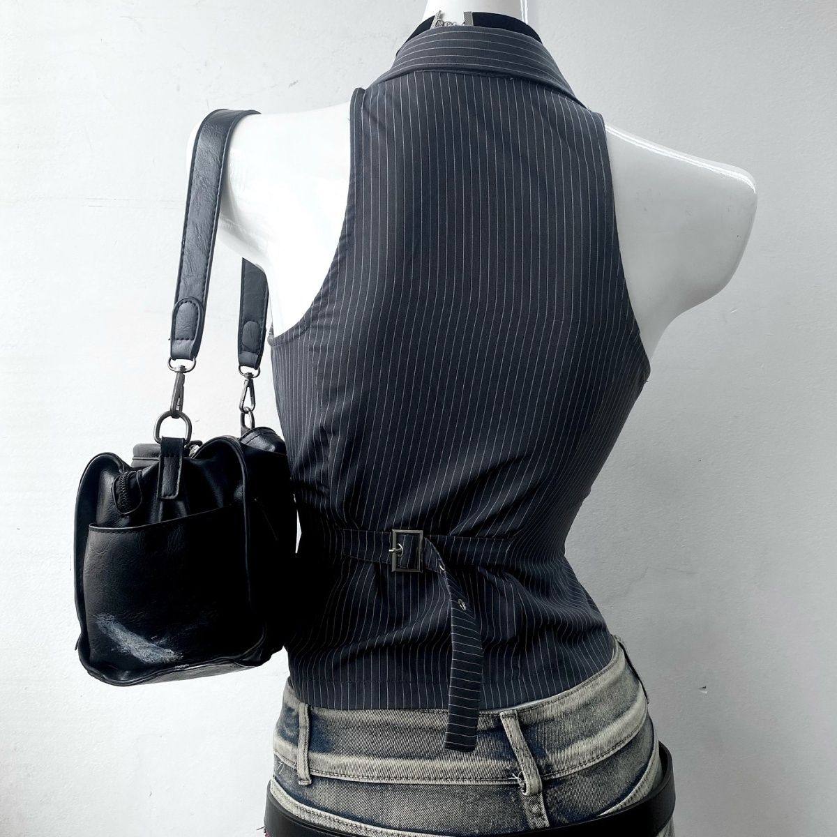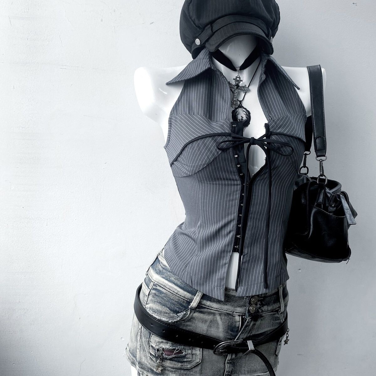 American Retro Vintage Style Striped Stand-Up Collar Sleeveless Shirt Top with Waist-Cinching Design, Vintage Millennium Hot Girl Y2K Style