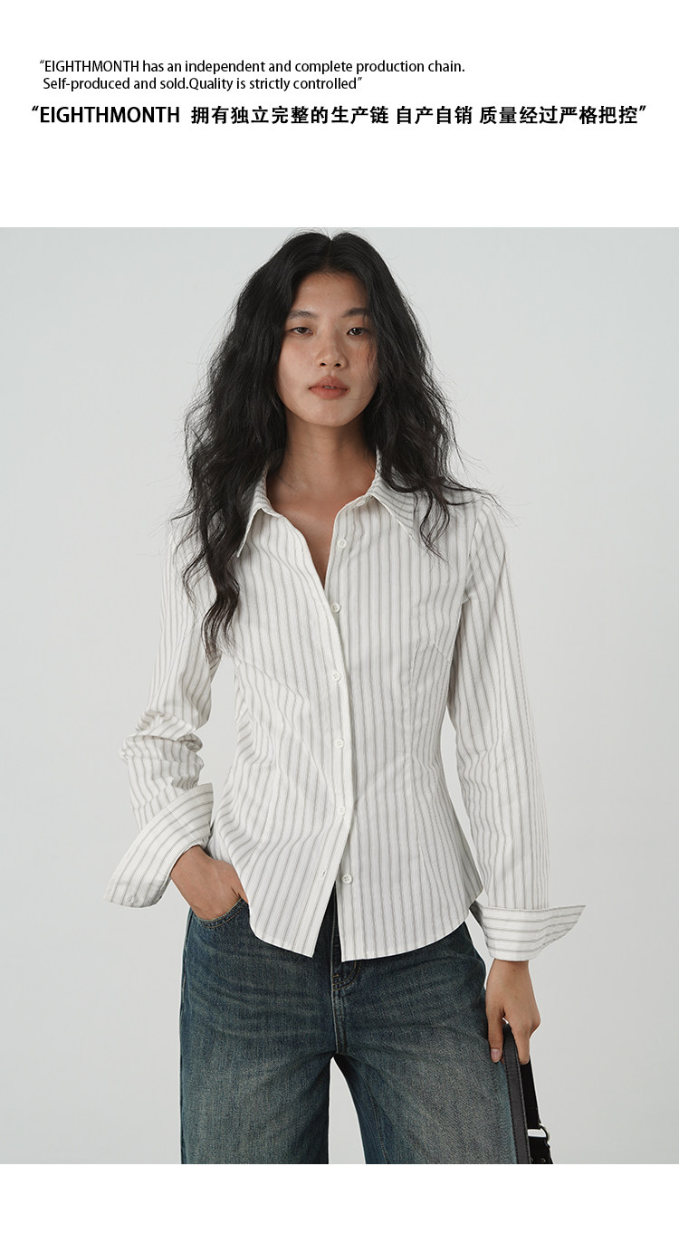 Eighthmonth French Retro Vertical Striped Shirt, Autumn Waist-Cinching Slim-Fit Collared Long-Sleeve Commuter Shirt