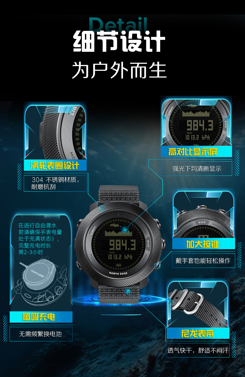 North Edge Diving Watch Men's Waterproof Multi-Function Freediving Watch Chronograph Compass Barometric Altimeter