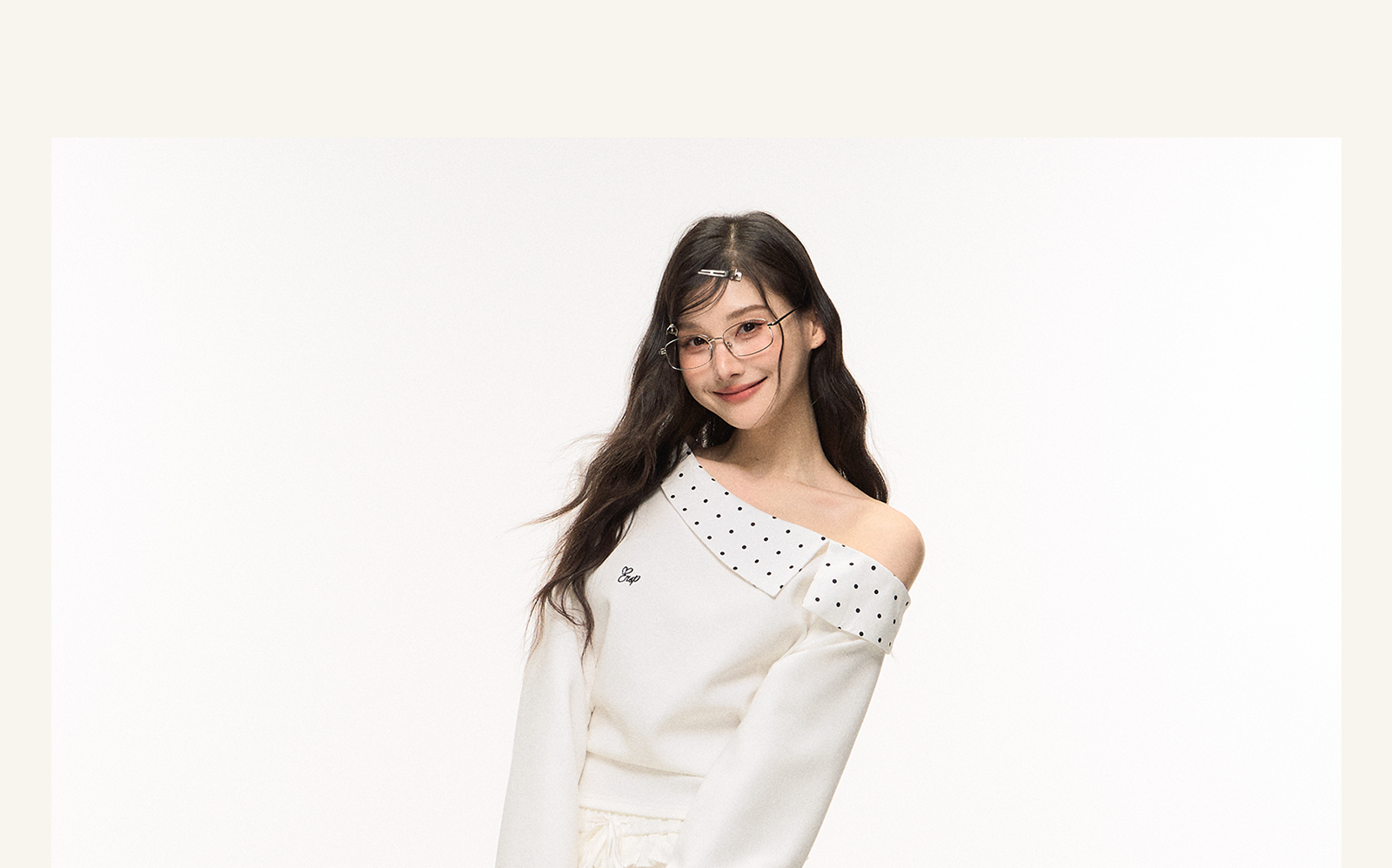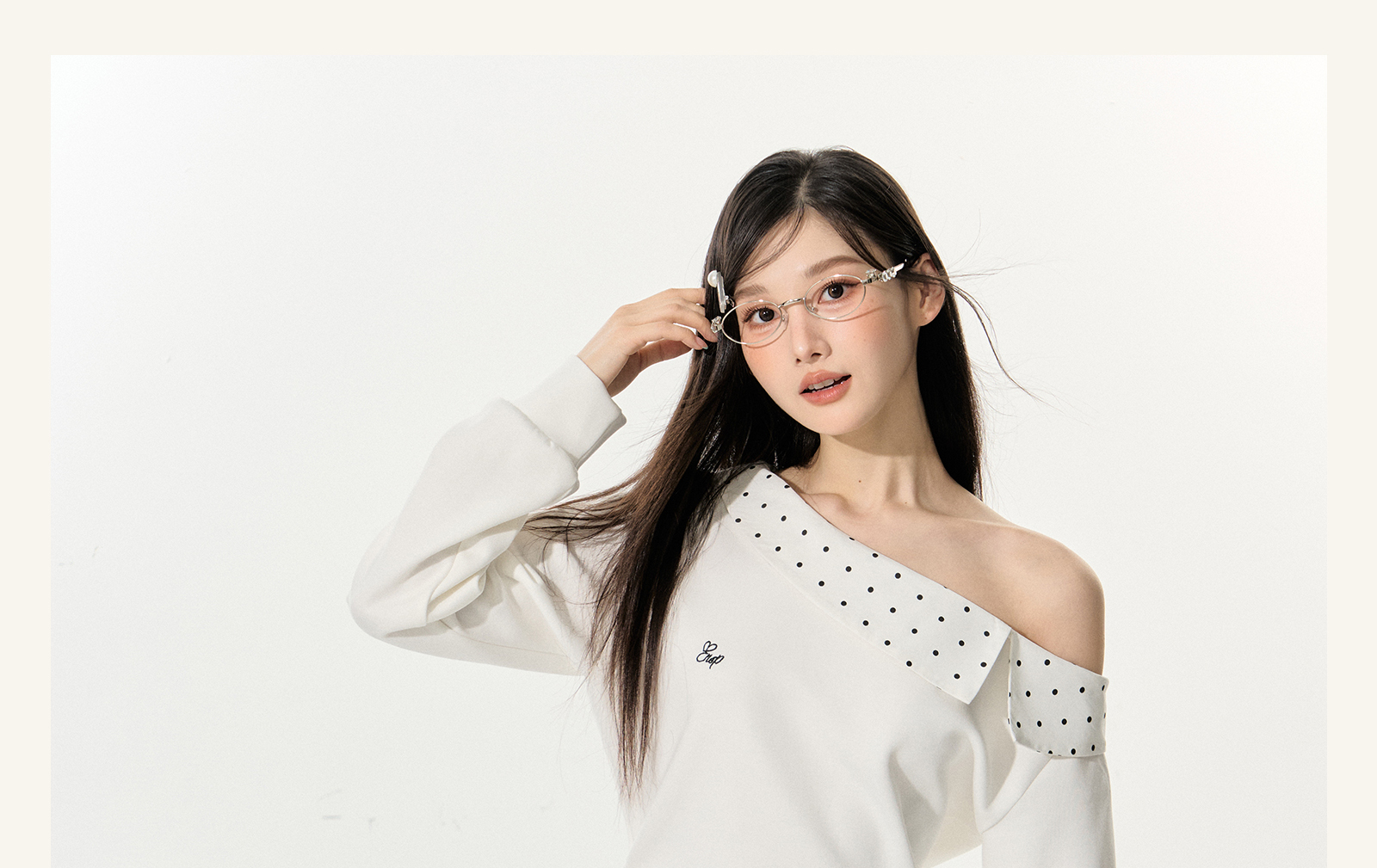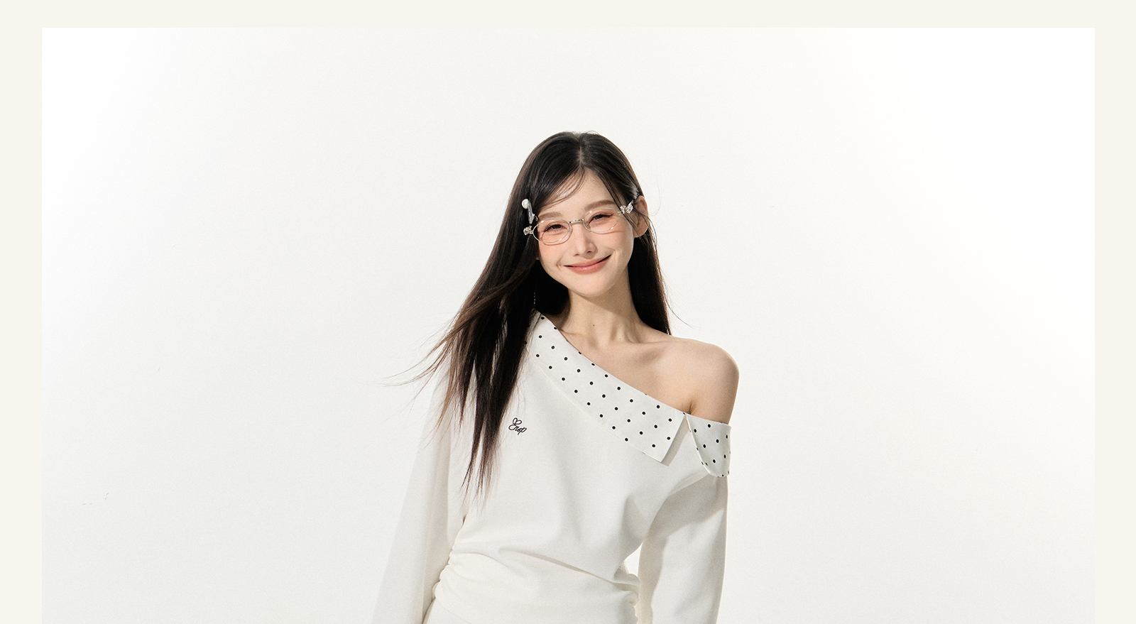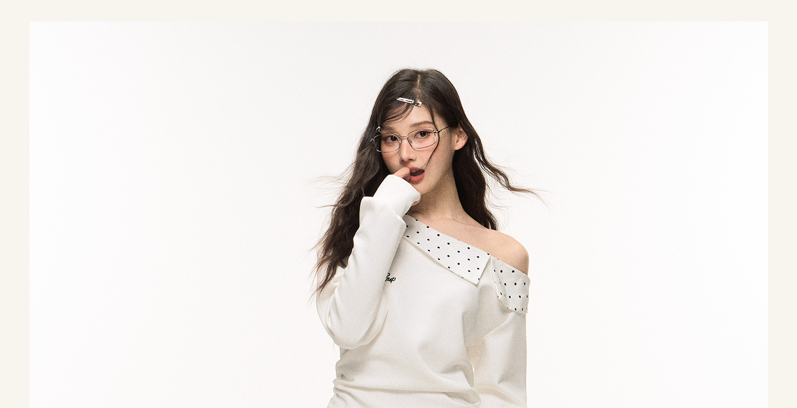 Eleven Sleep Autumn Asymmetrical Long Sleeve T-Shirt for Women with Polka Dot Patchwork Design, Off-Shoulder Gentle Korean Style Top