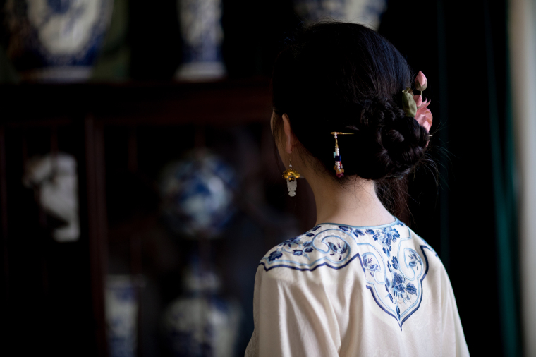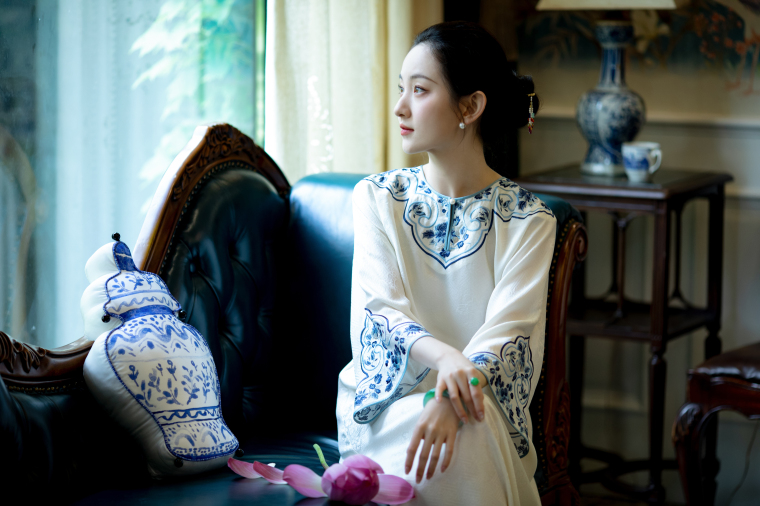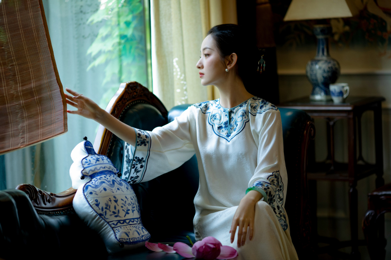 Qiong Ling Fu Yun | 2025 Summer New Collection | Silk Perforated Cheongsam with Three Blue Embroidered Cloud Shoulders, New Chinese Style Dress