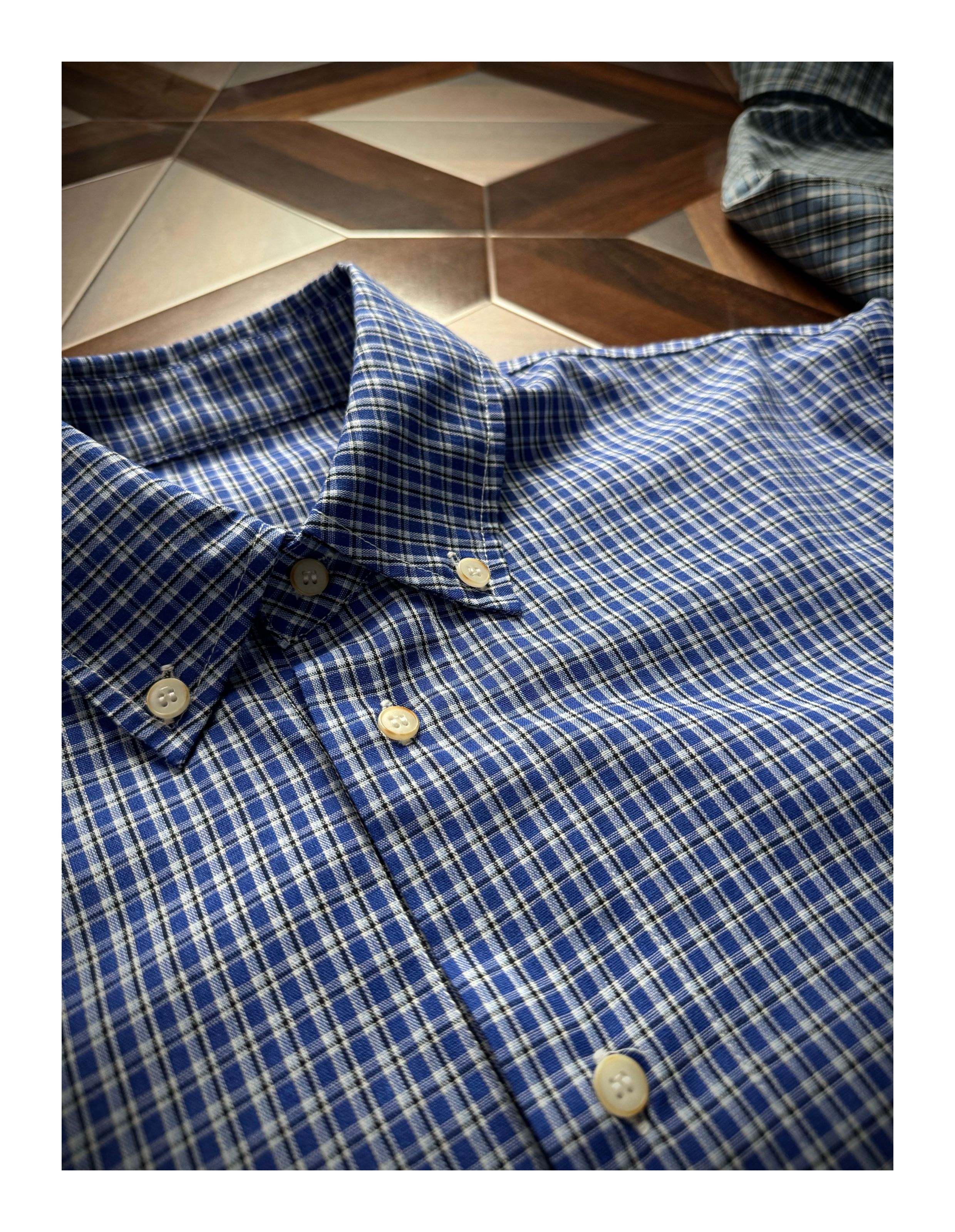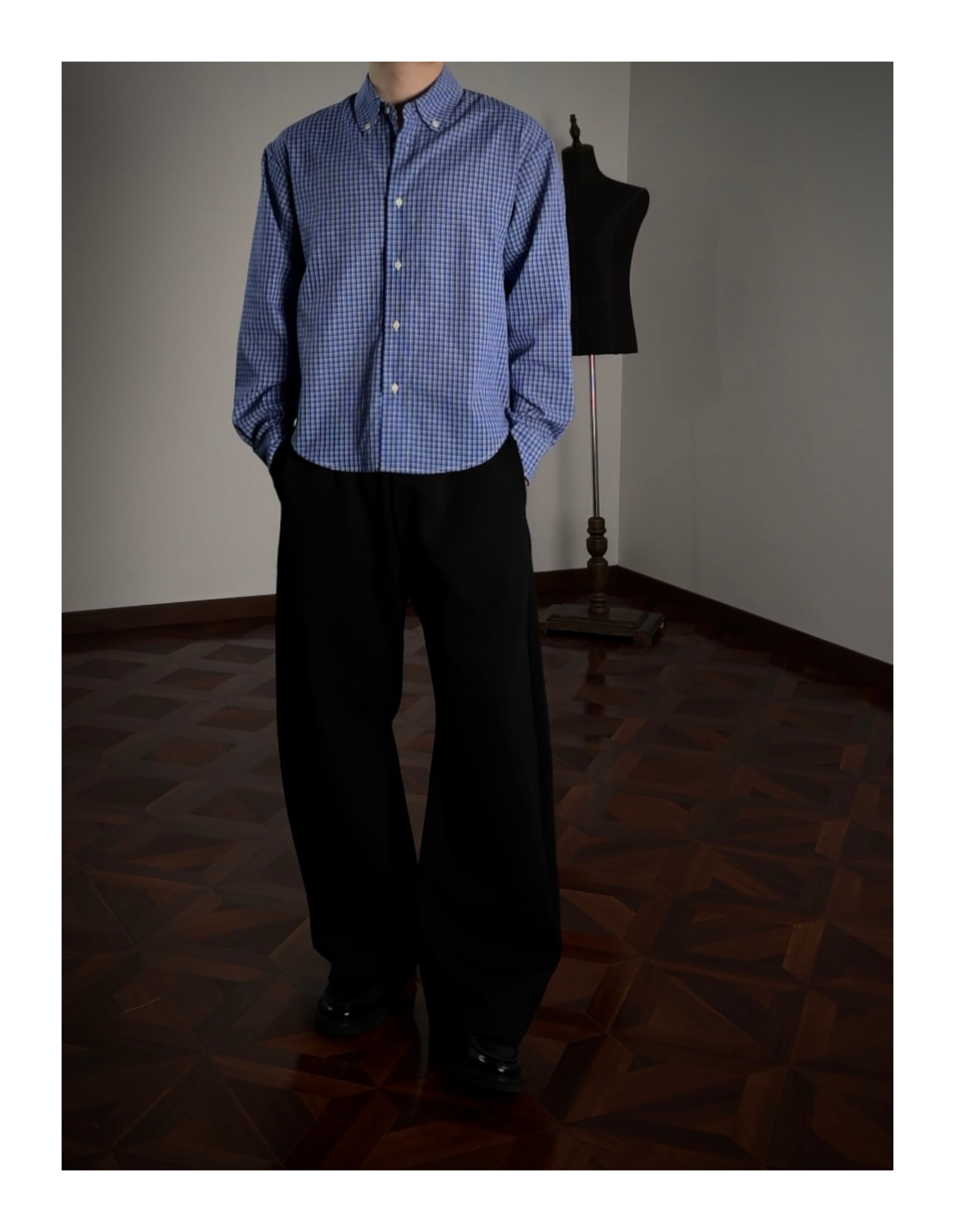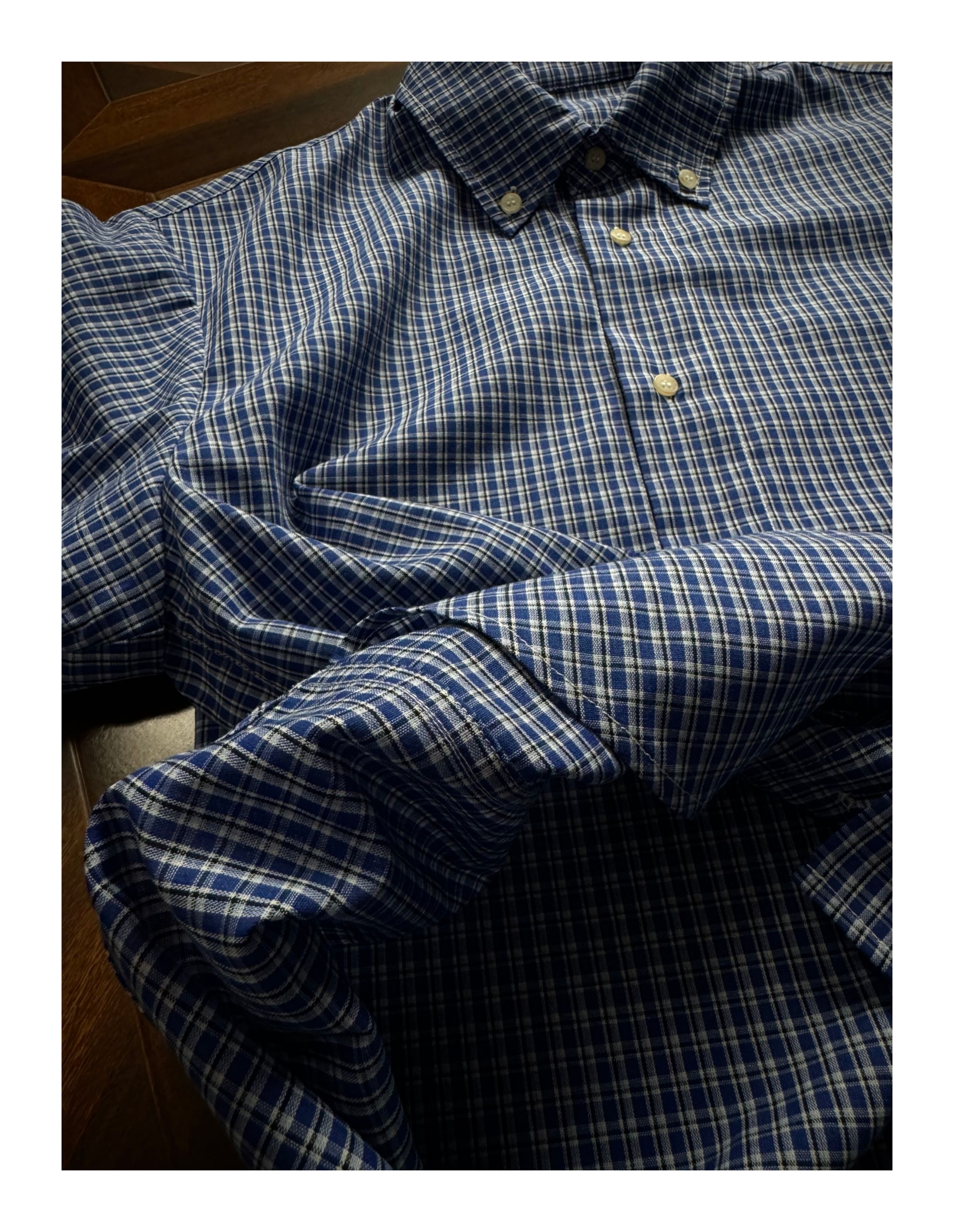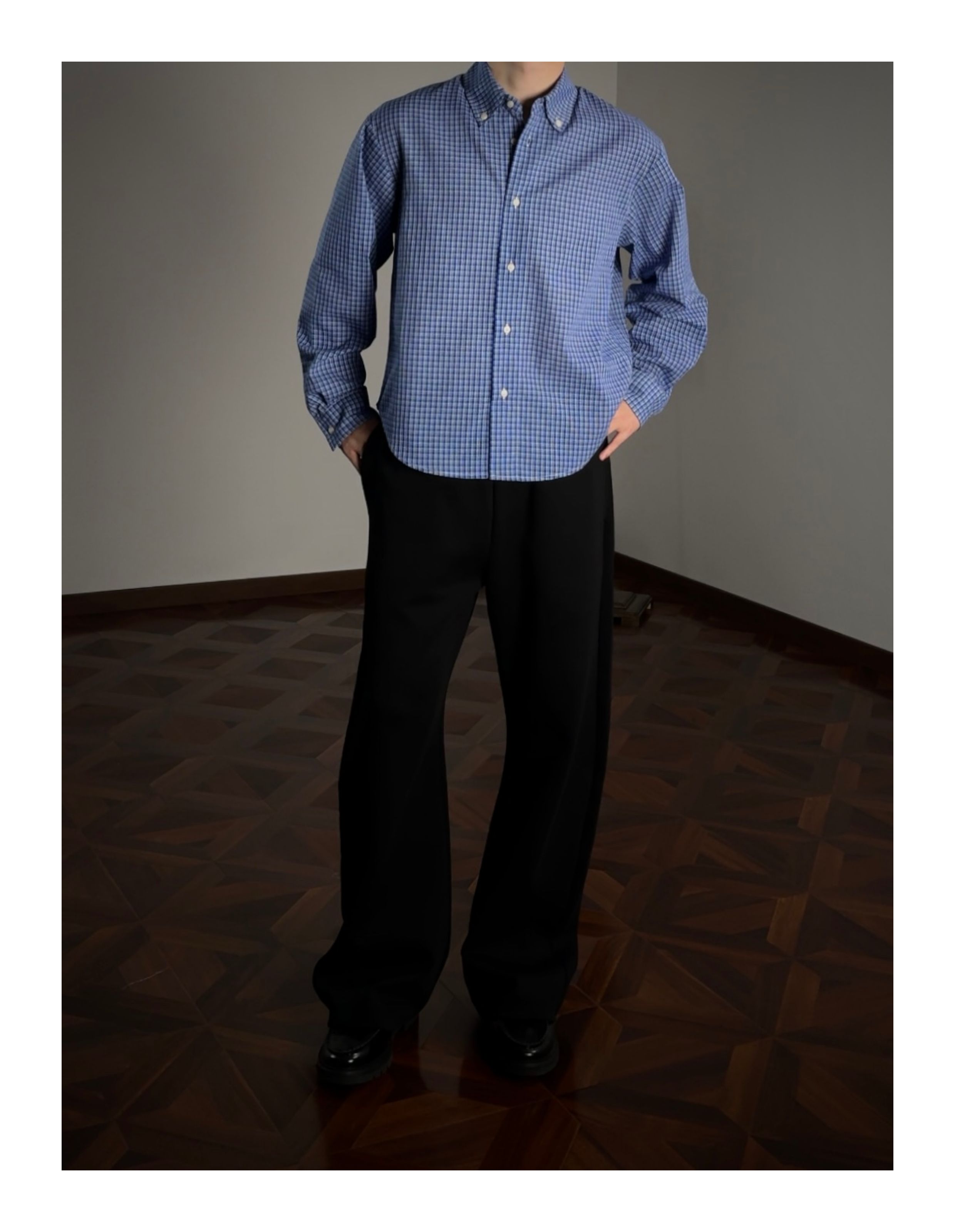 Oclin Dark Blue Plaid Miu-Style Basic Shirt, Slightly Oversized Short Wide Fit, Suitable for Layering or Wearing Alone, Commuter Style, with Button Closure