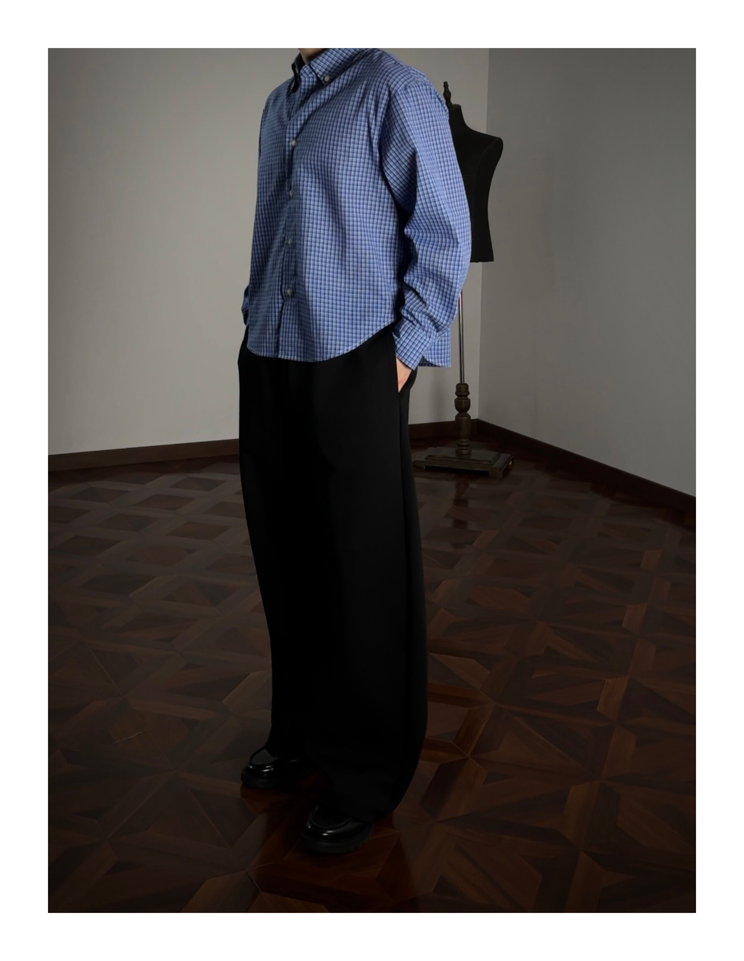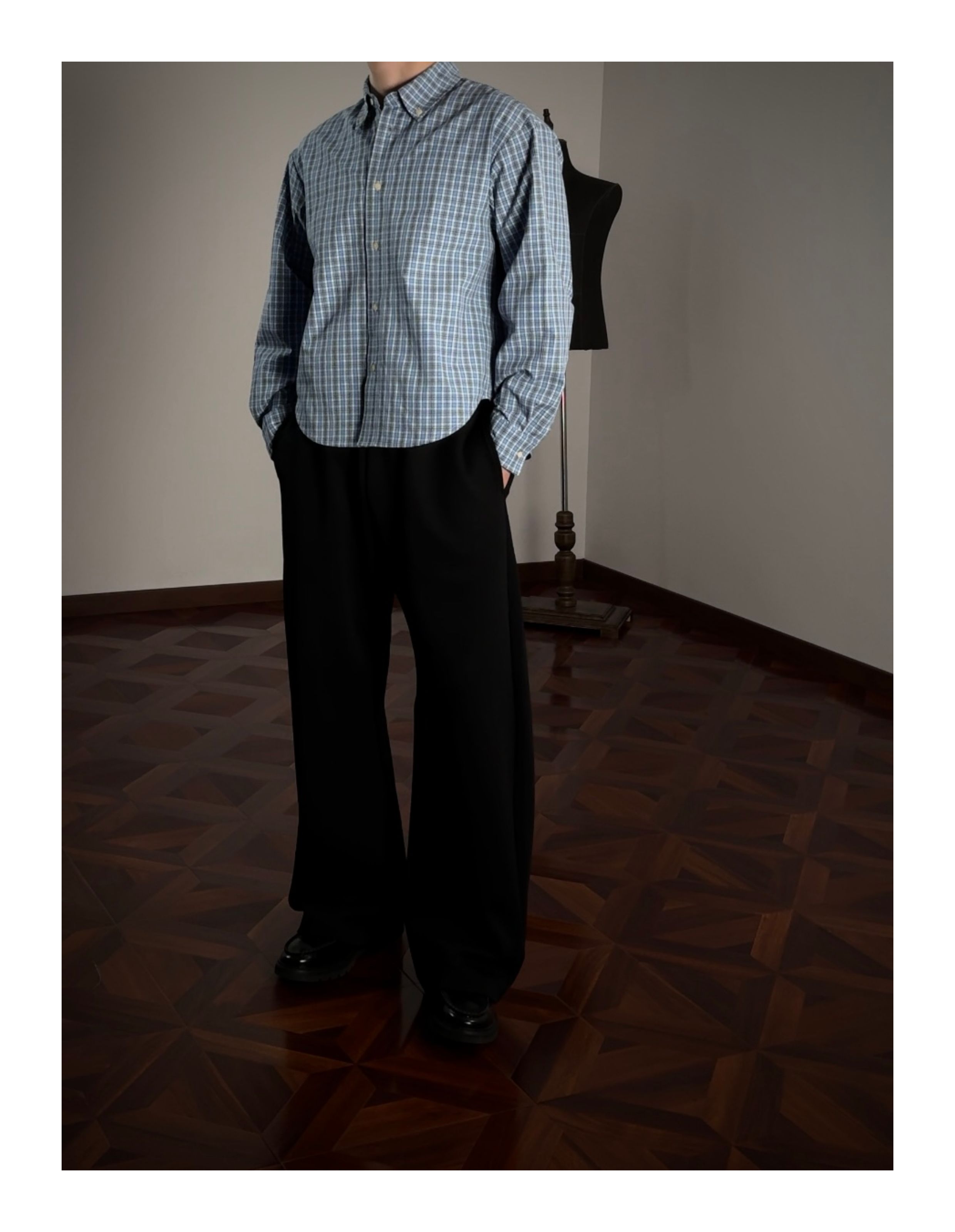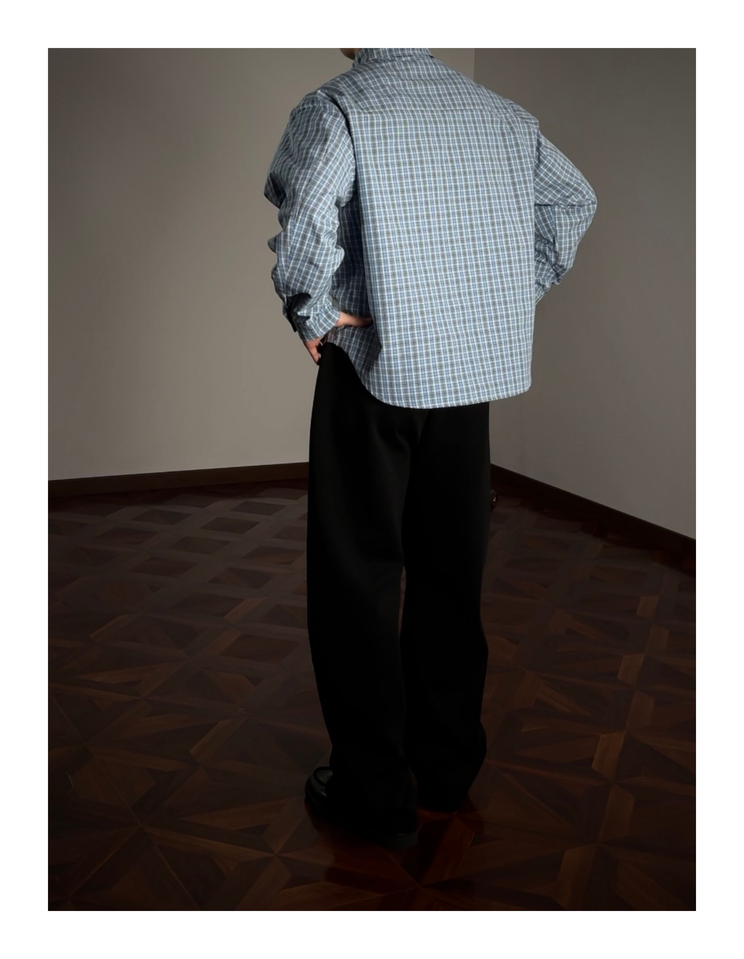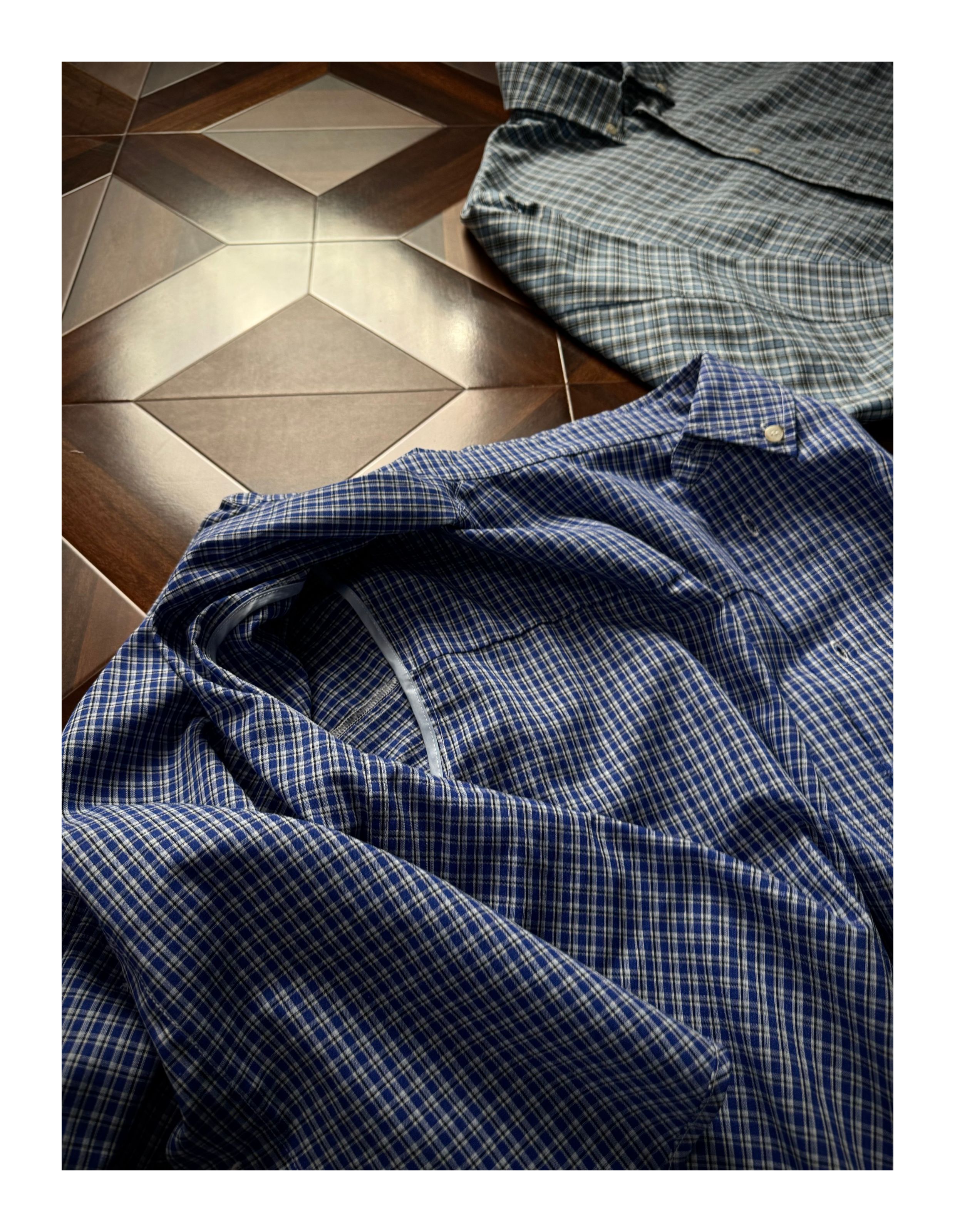 Oclin Dark Blue Plaid Miu-Style Basic Shirt, Slightly Oversized Short Wide Fit, Suitable for Layering or Wearing Alone, Commuter Style, with Button Closure