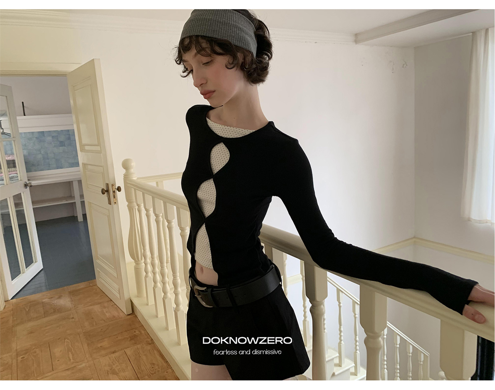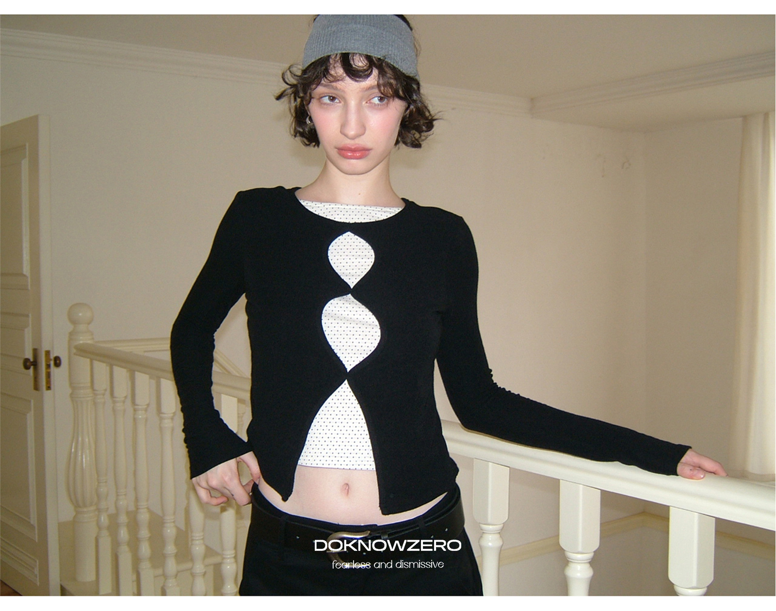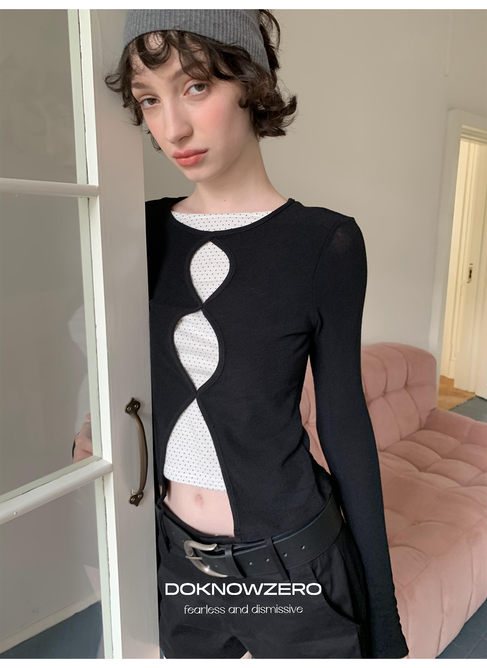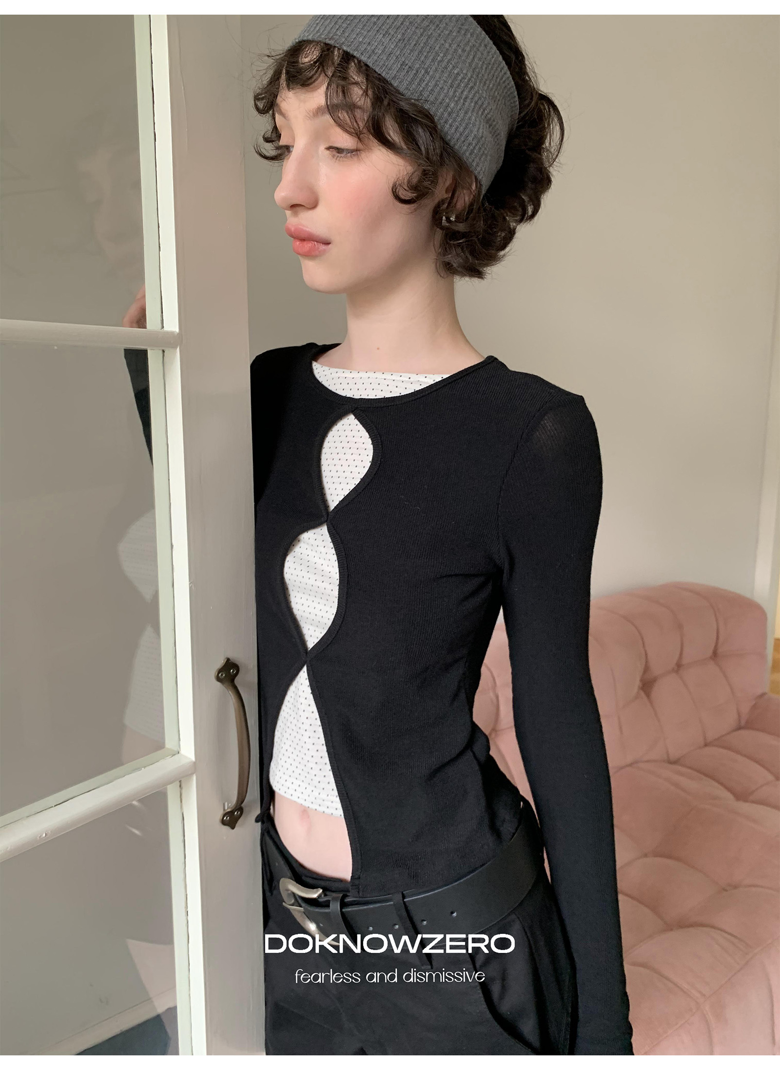 Dkz Fake Two-Piece Hollow-Out Polka Dot Long-Sleeve T-Shirt for Women, New Autumn Slim-Fit Knit Top
