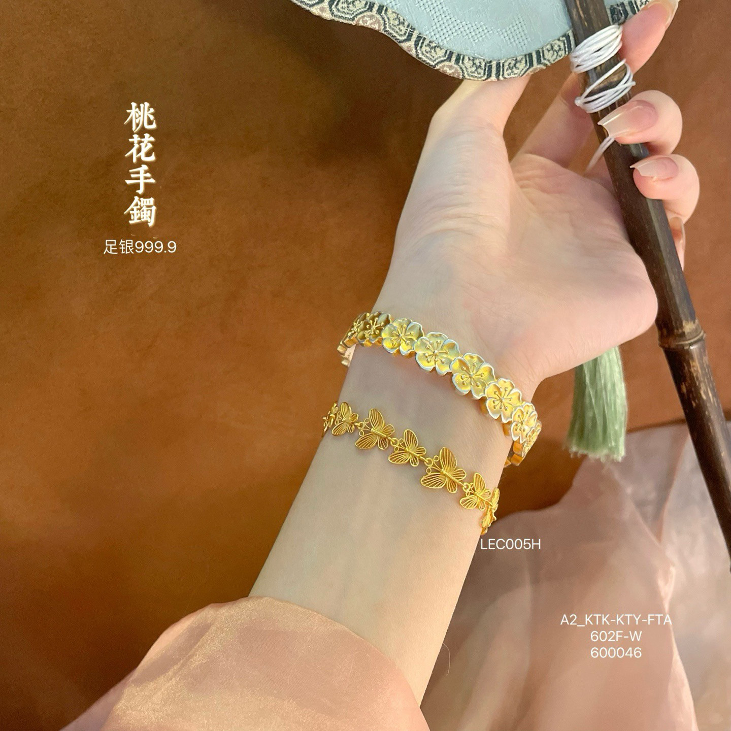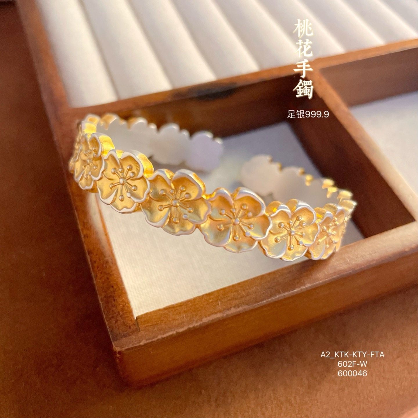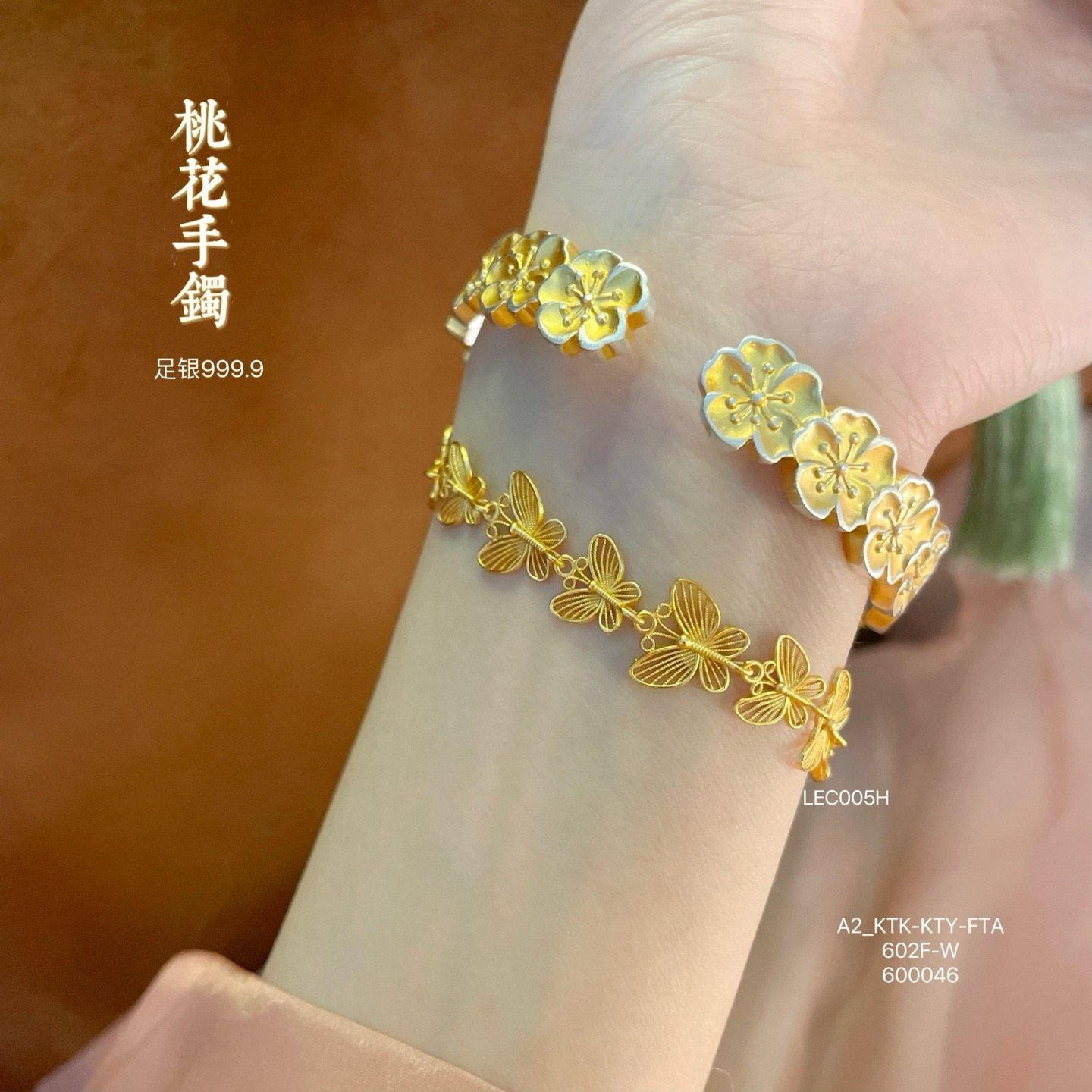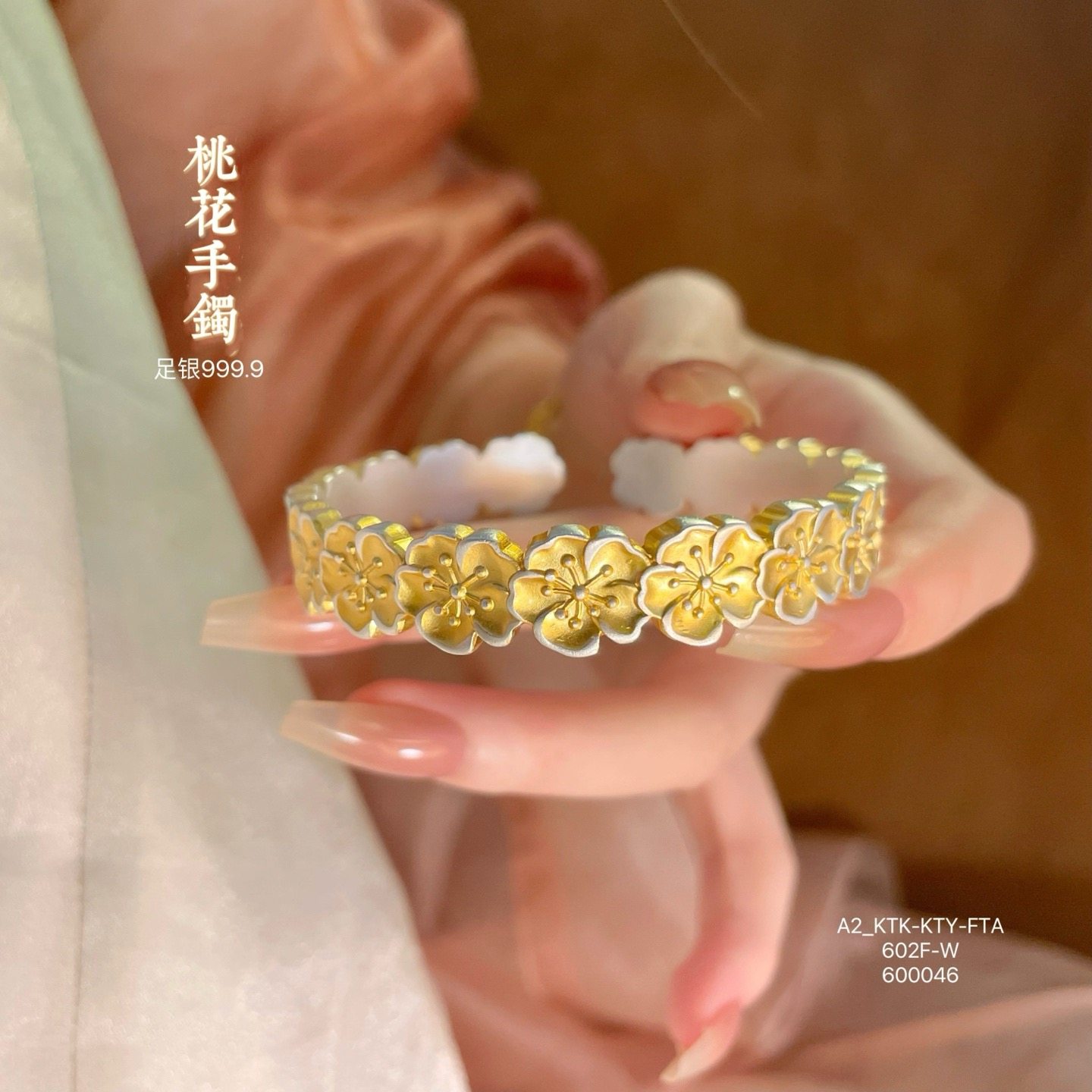 Colorful Peach Blossom Pure Silver 9999 Gold-Plated Open-Ended Sterling Silver Bracelet for Women, New Chinese Style, Versatile