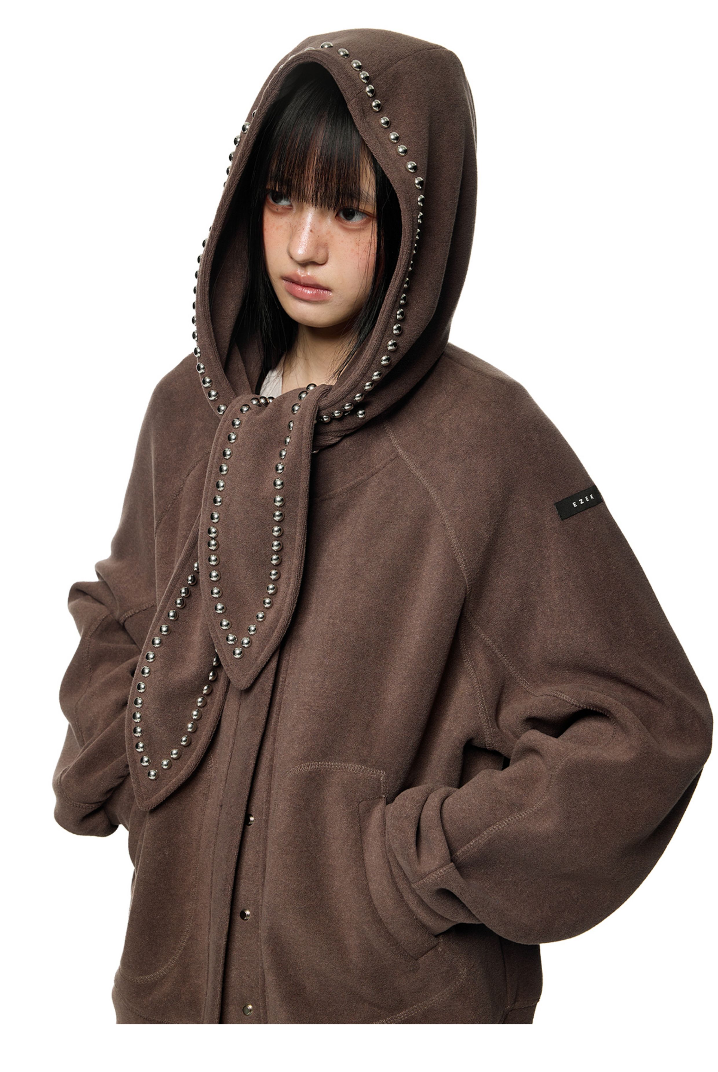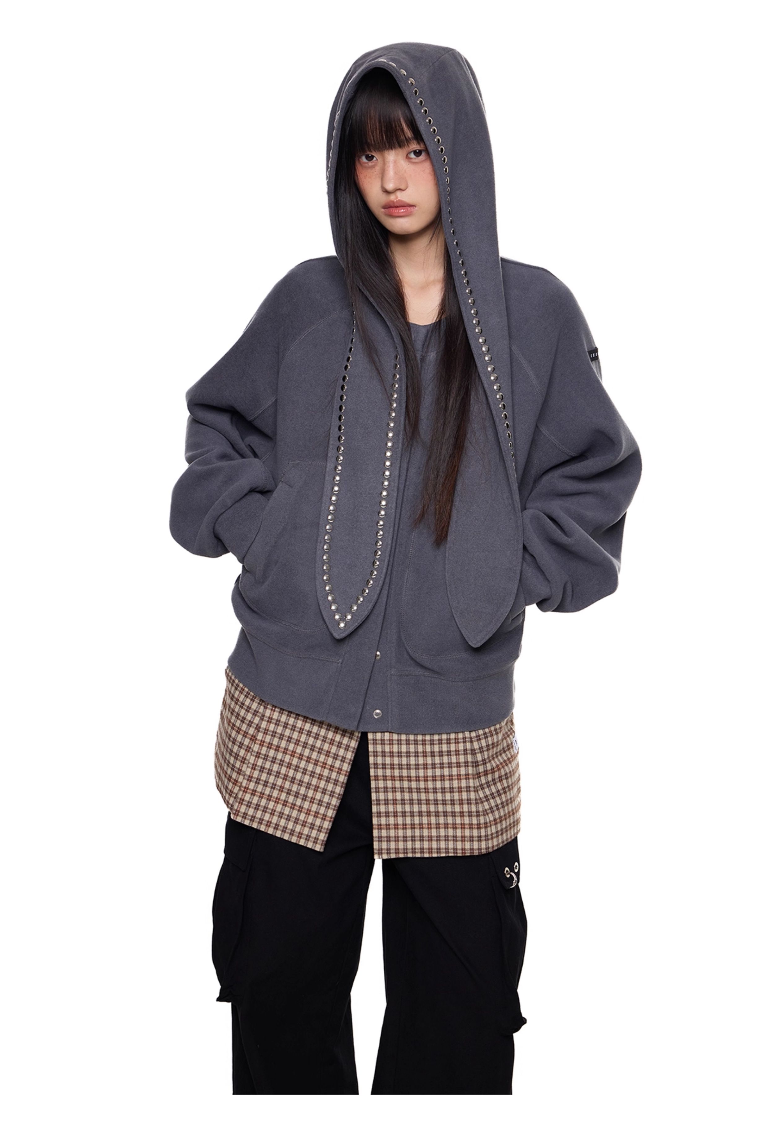 Ezek Rabbit Ear Rivet Hooded Sweatshirt Jacket for Women, New Autumn Casual Loose Design Hoodie Cardigan Top