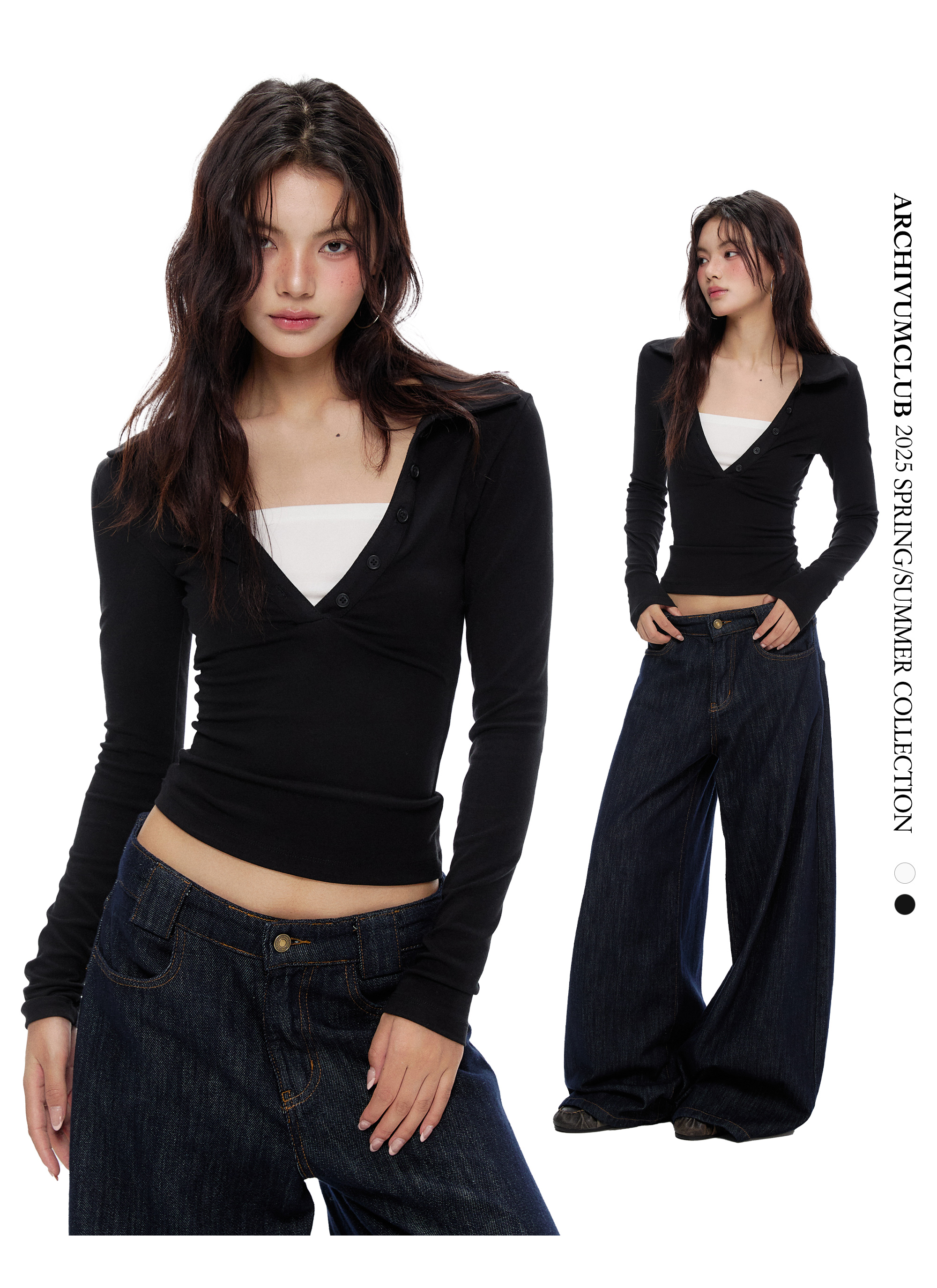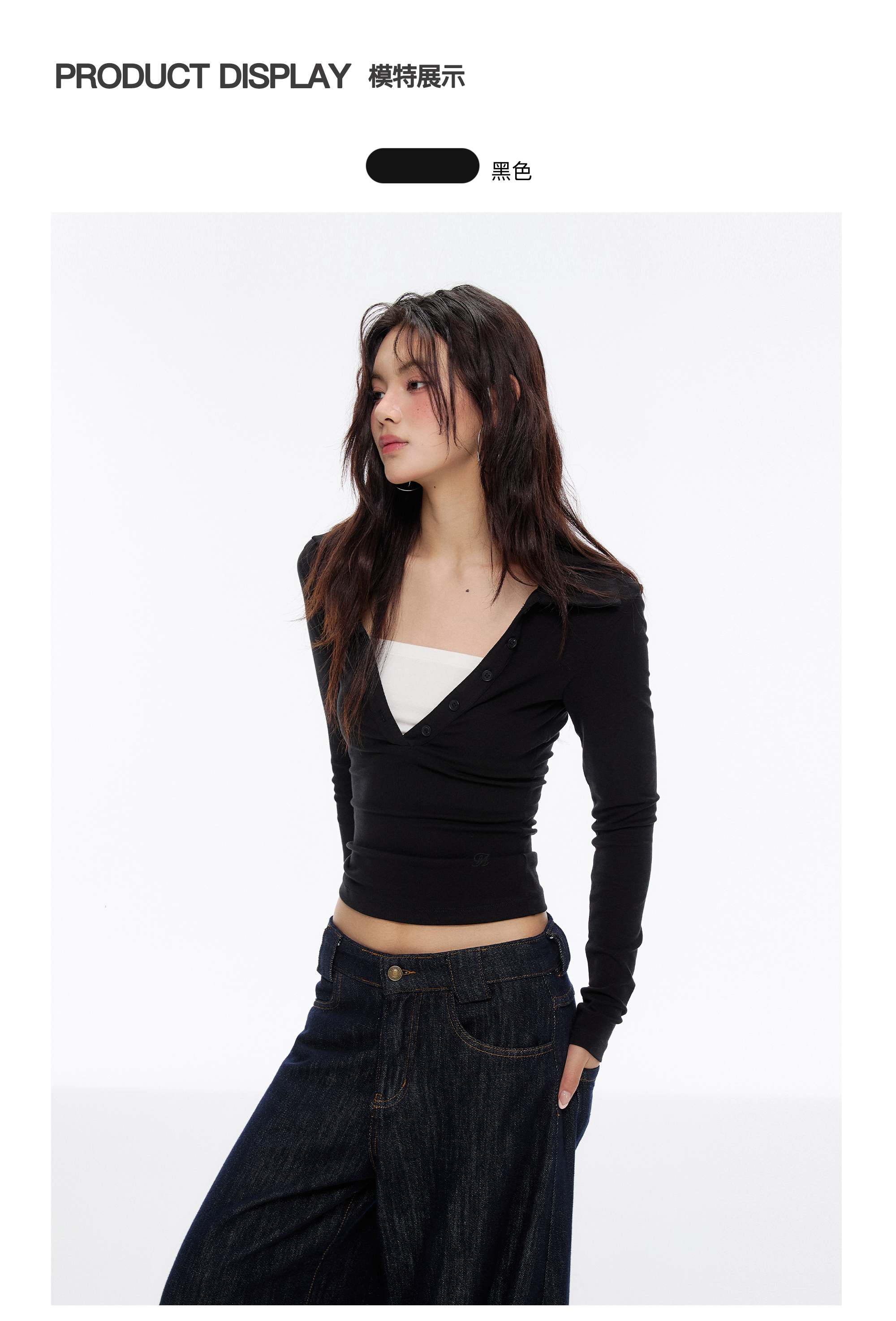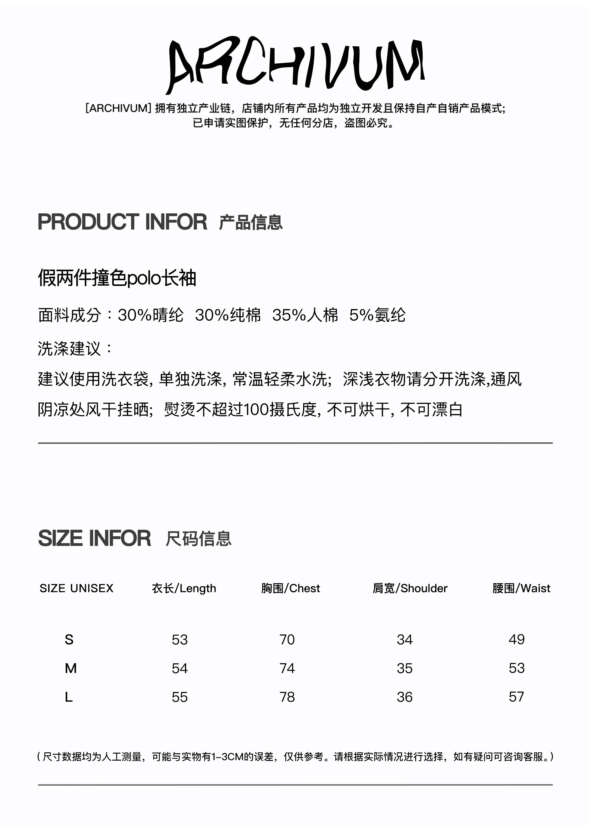 Archivum Fake Two-Piece Color-Block Polo Deep V-Neck Knitted Long-Sleeve Versatile Slim-Fit Commuter Top for a Trendy Look