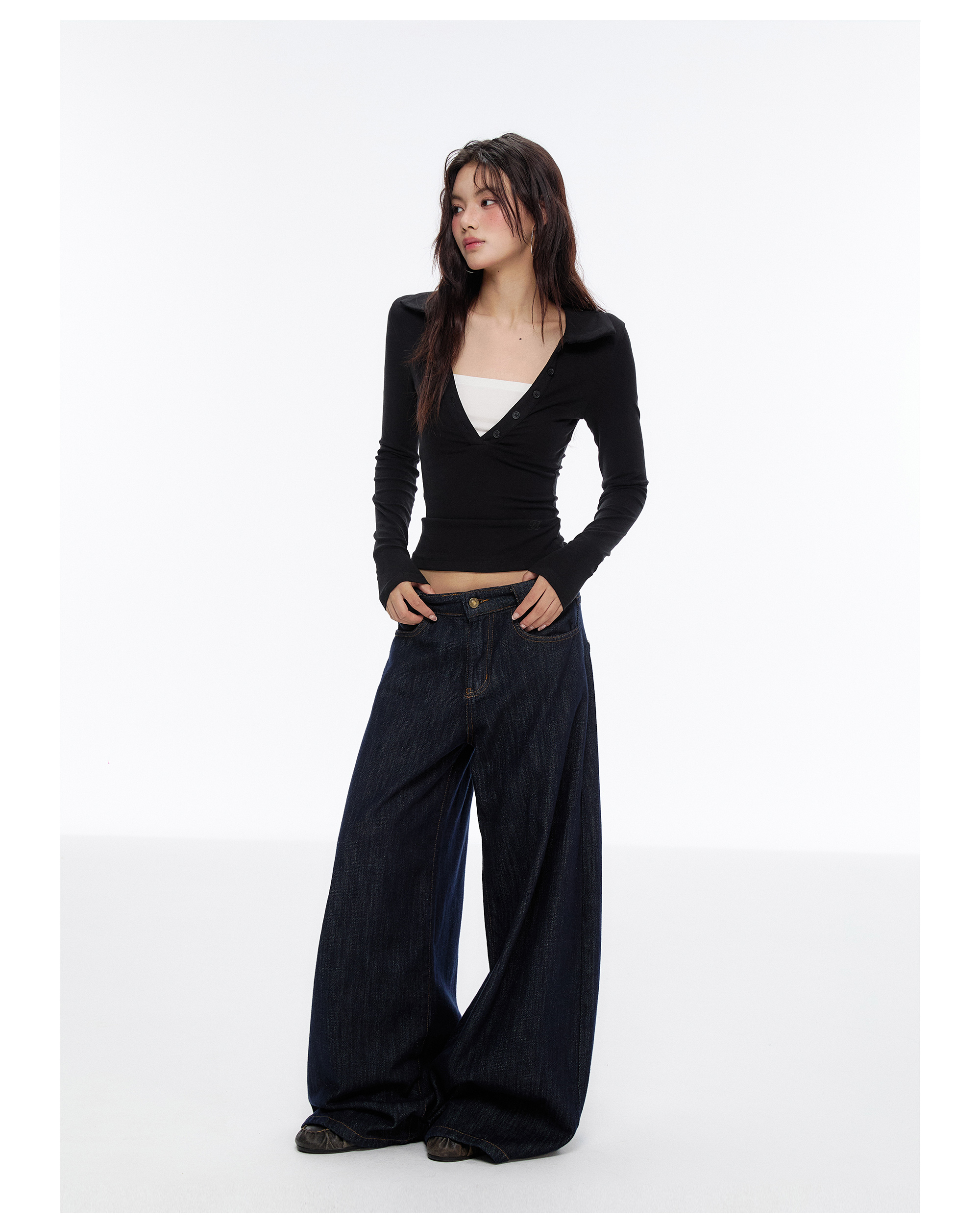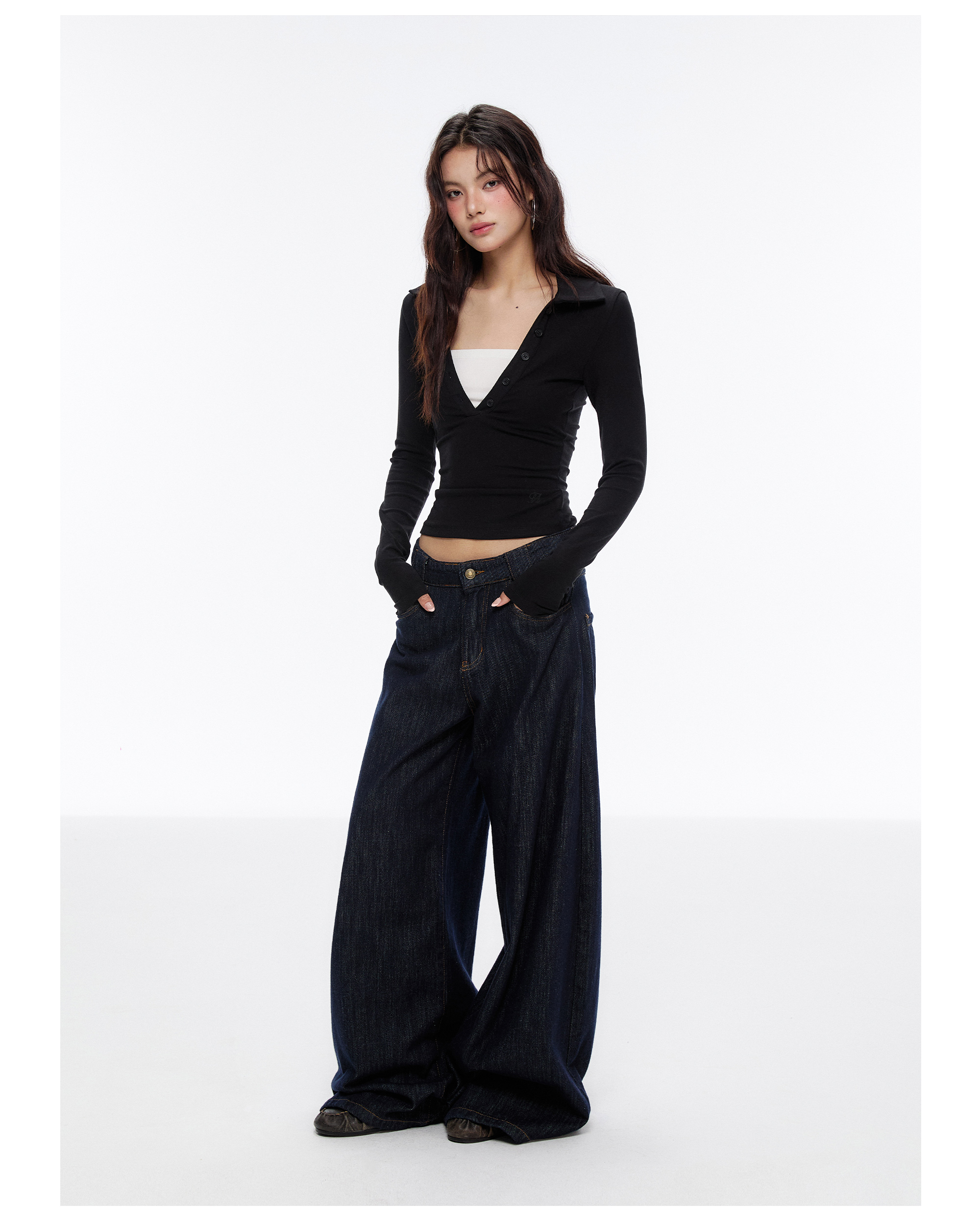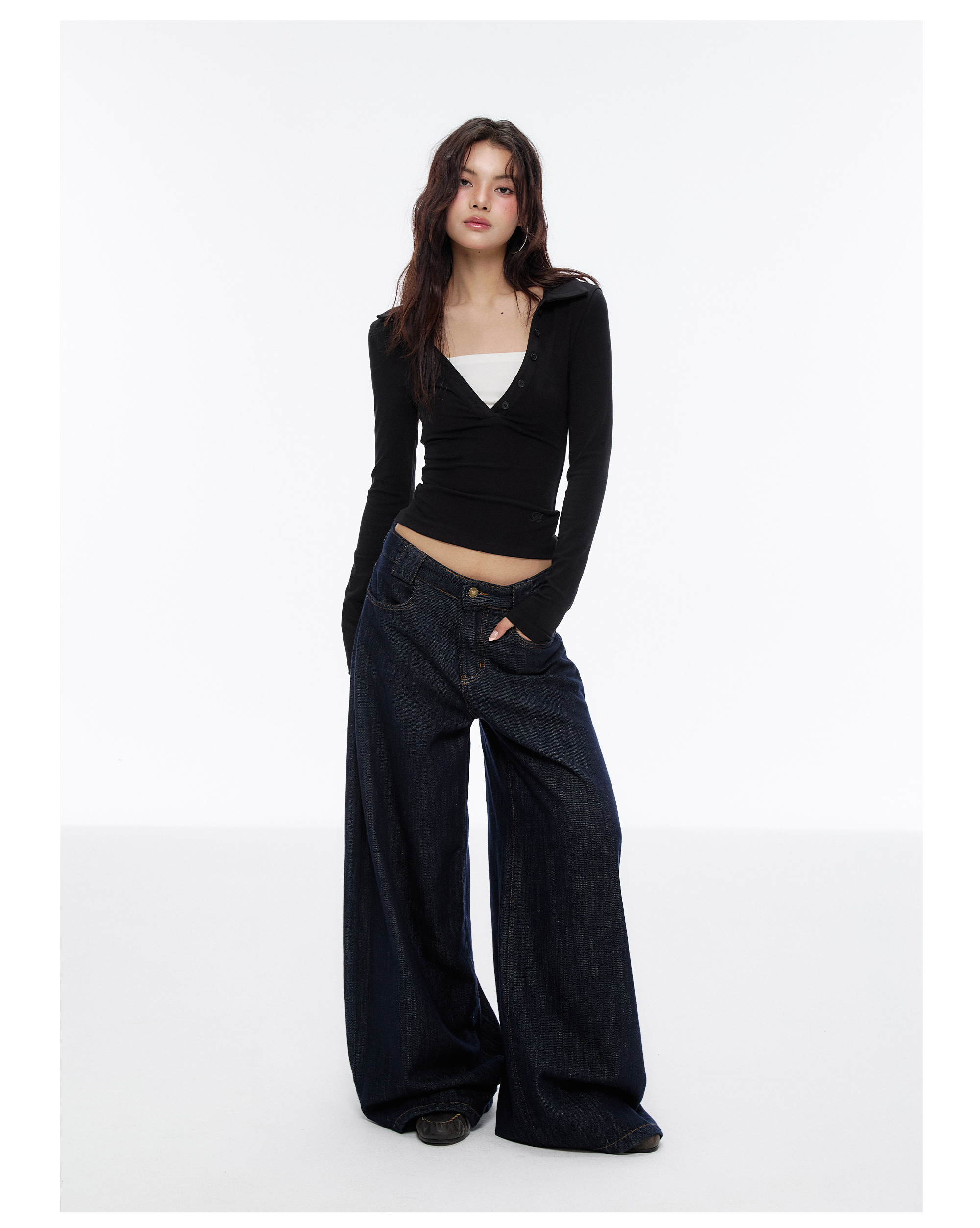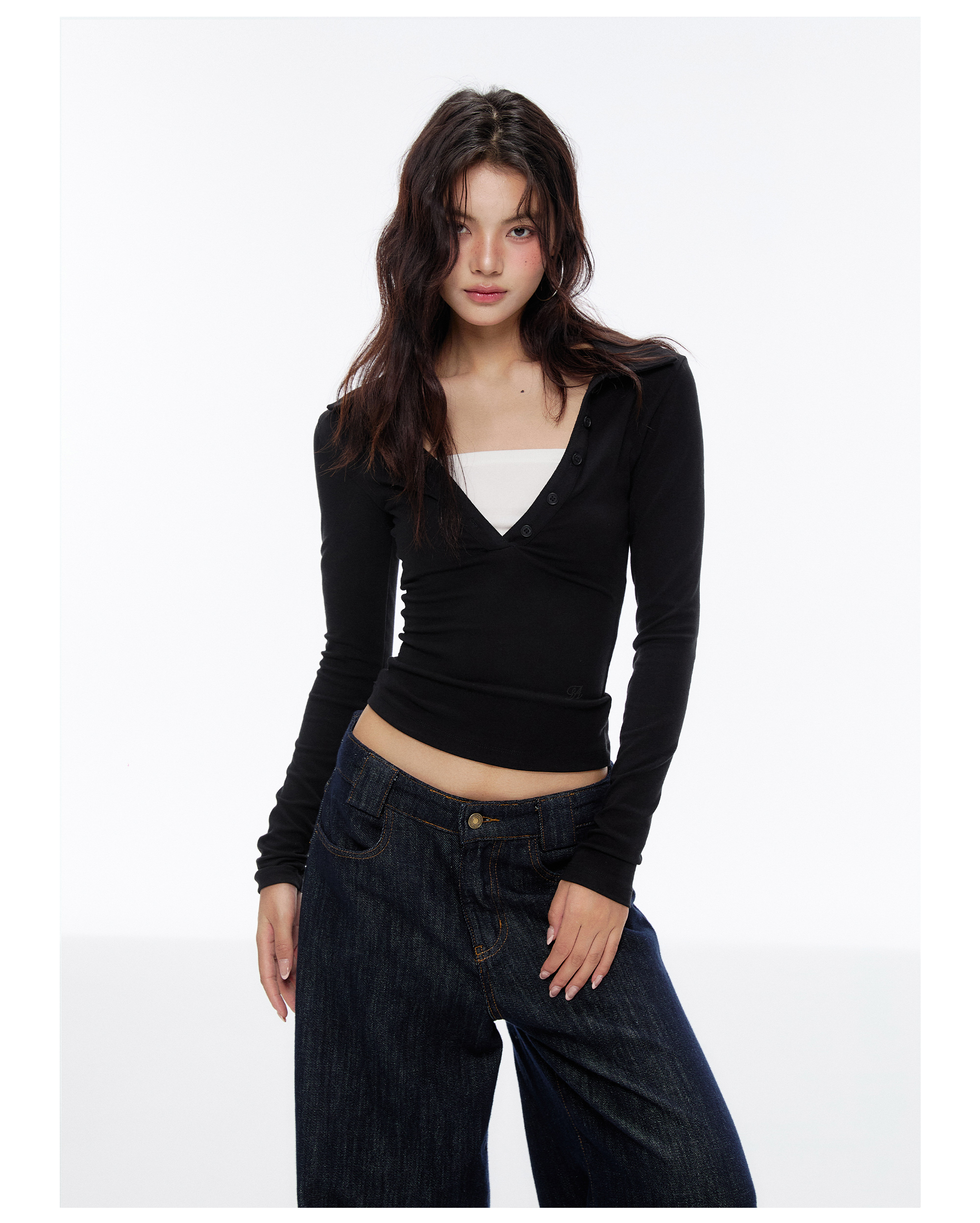 Archivum Fake Two-Piece Color-Block Polo Deep V-Neck Knitted Long-Sleeve Versatile Slim-Fit Commuter Top for a Trendy Look