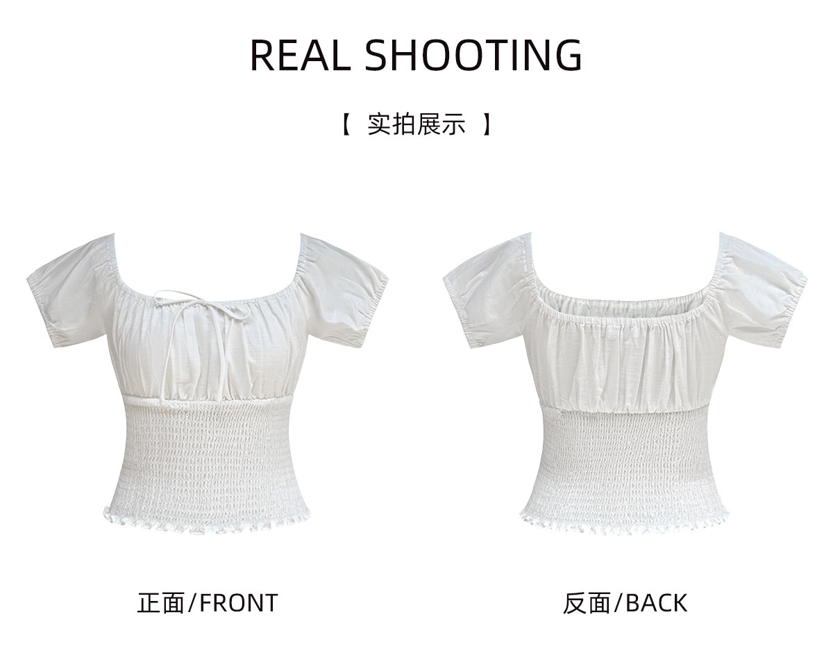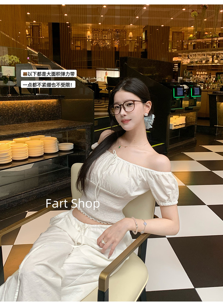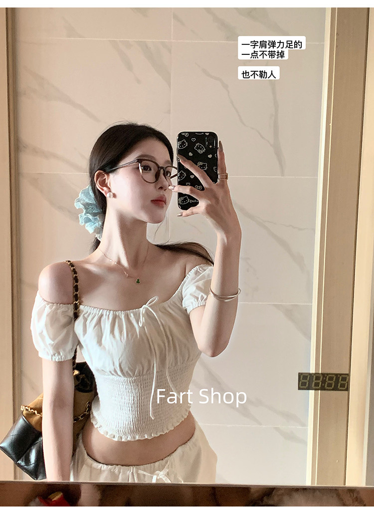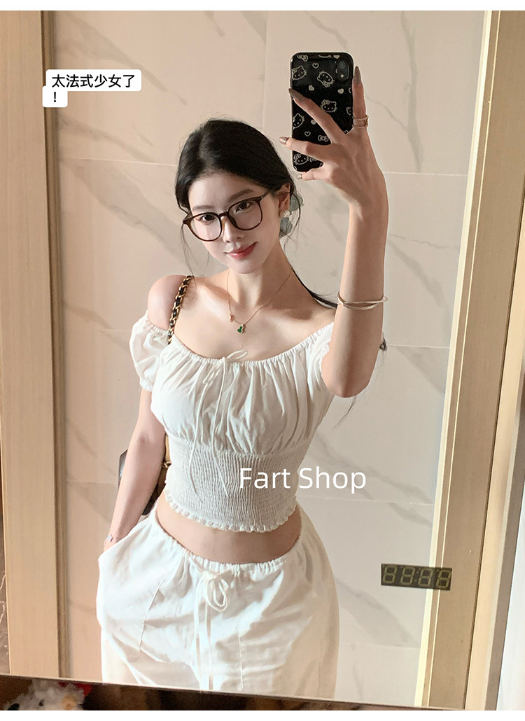 【Fart Shop】Southern French Style Girl's Off-Shoulder Ruched Design Pure and Alluring Off-Shoulder Waist-Cinching Short Shirt for Women