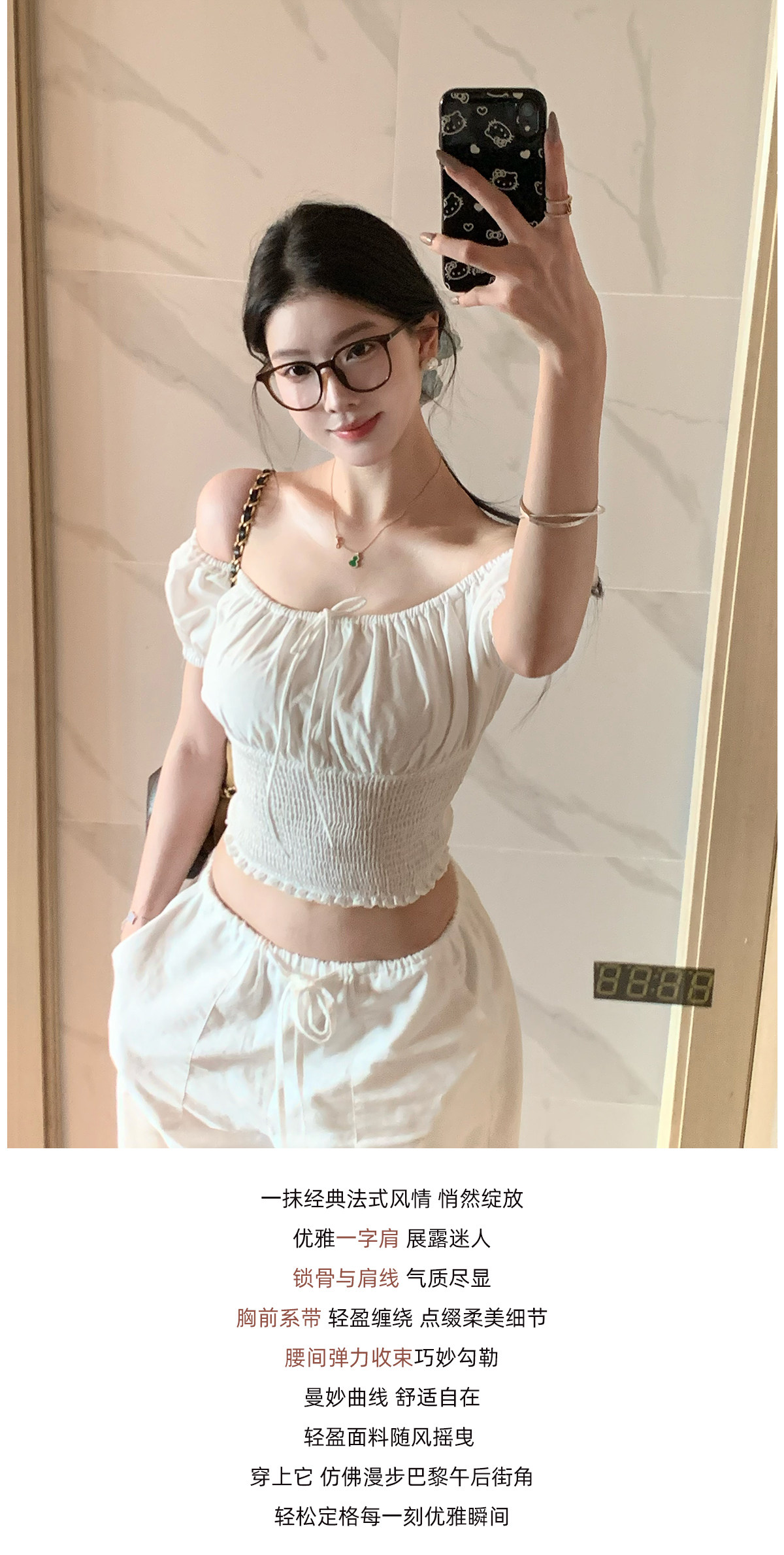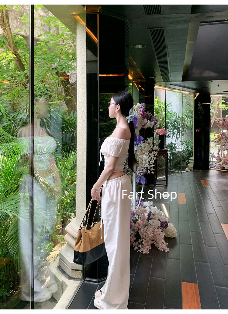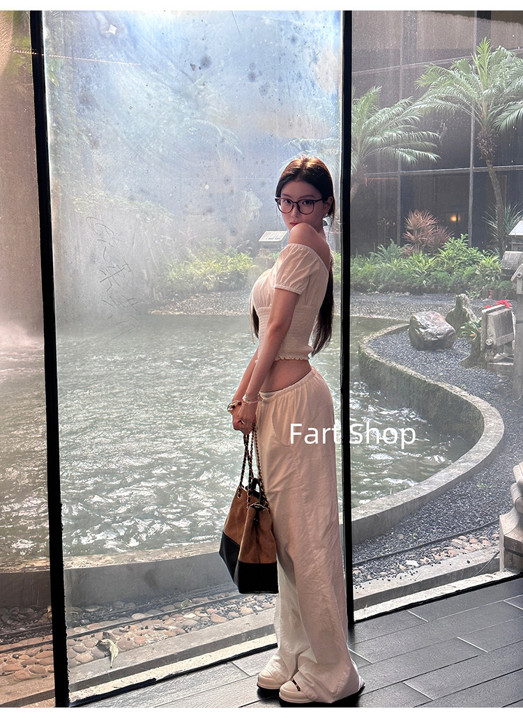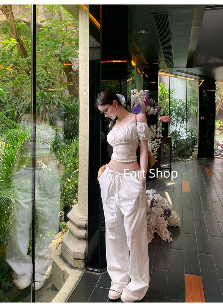 【Fart Shop】Southern French Style Girl's Off-Shoulder Ruched Design Pure and Alluring Off-Shoulder Waist-Cinching Short Shirt for Women