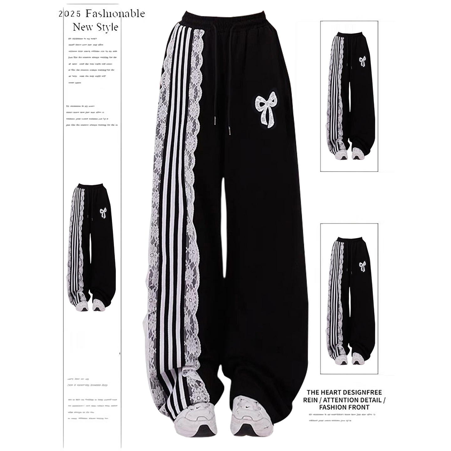 American Retro Lace Patchwork Navy Blue Sweatpants for Women, New Spring and Autumn Loose Straight Wide-Leg Casual Pants