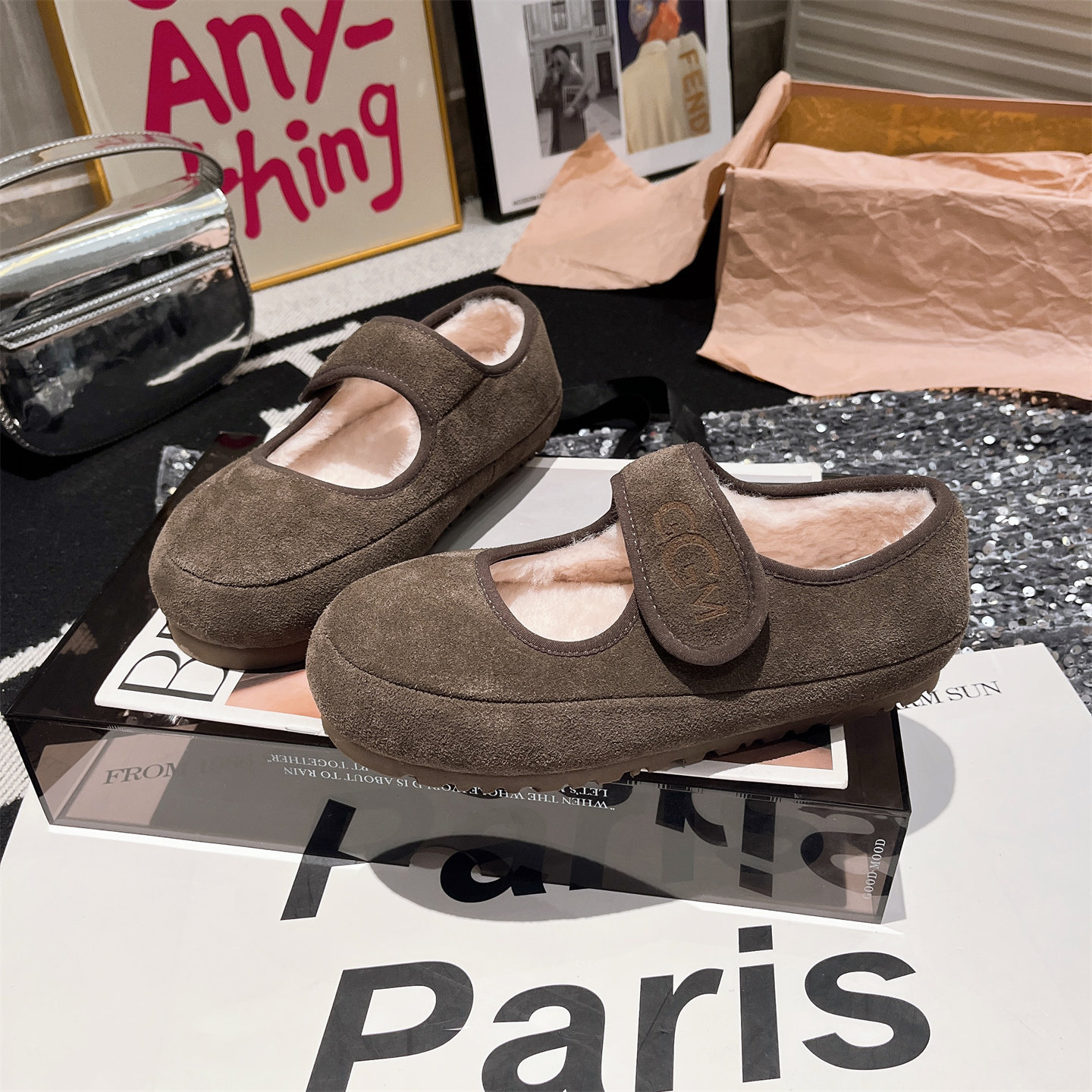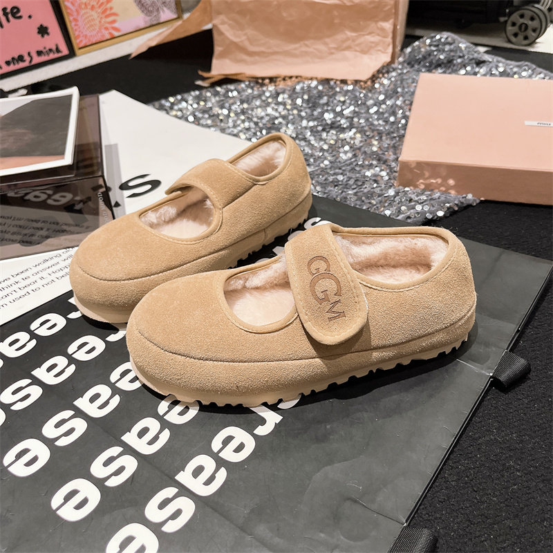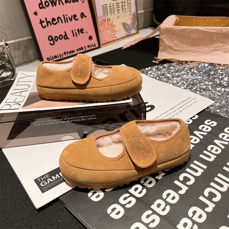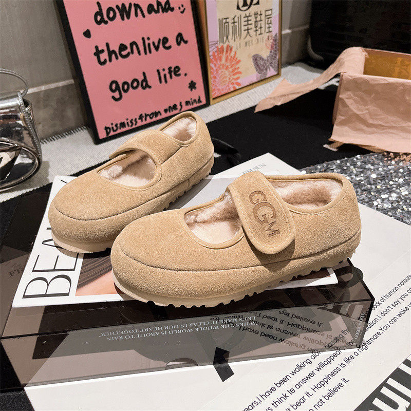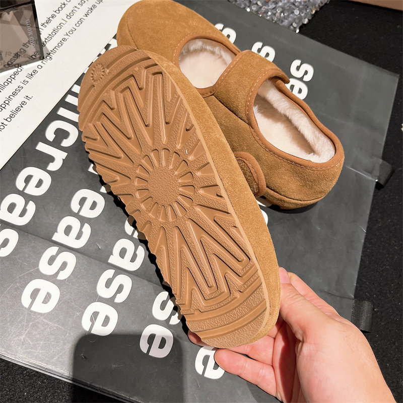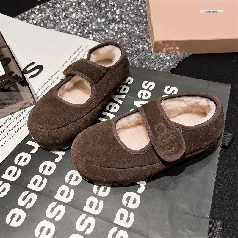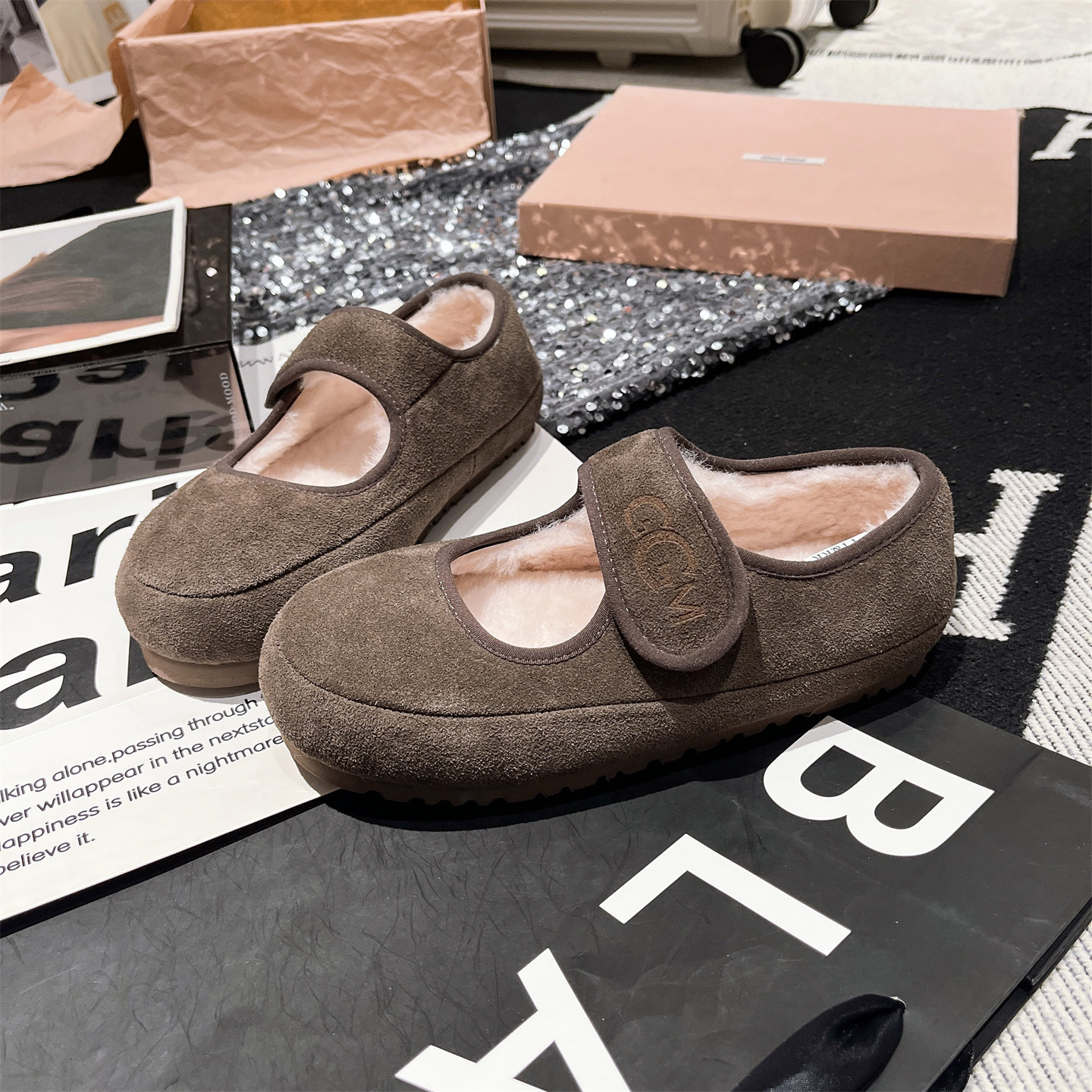 Hong Kong Genuine Leather Flat Mary Jane Birkenstock Shoes, Furry Cotton Shoes for Women, 2025 Winter, Velcro Lazy Slip-On Casual Shoes