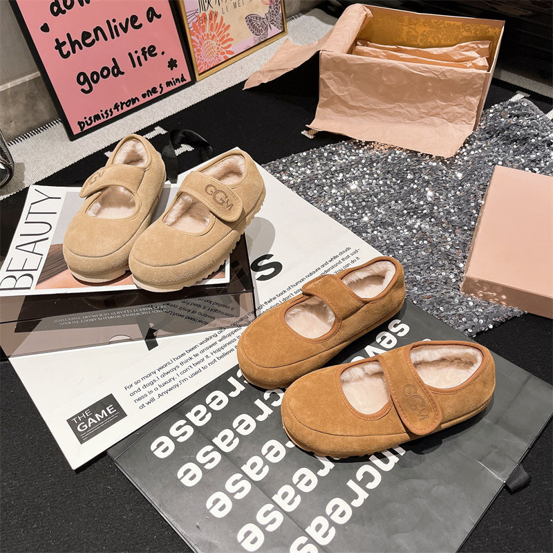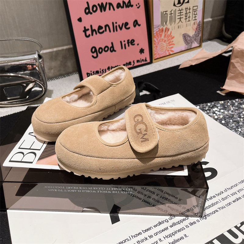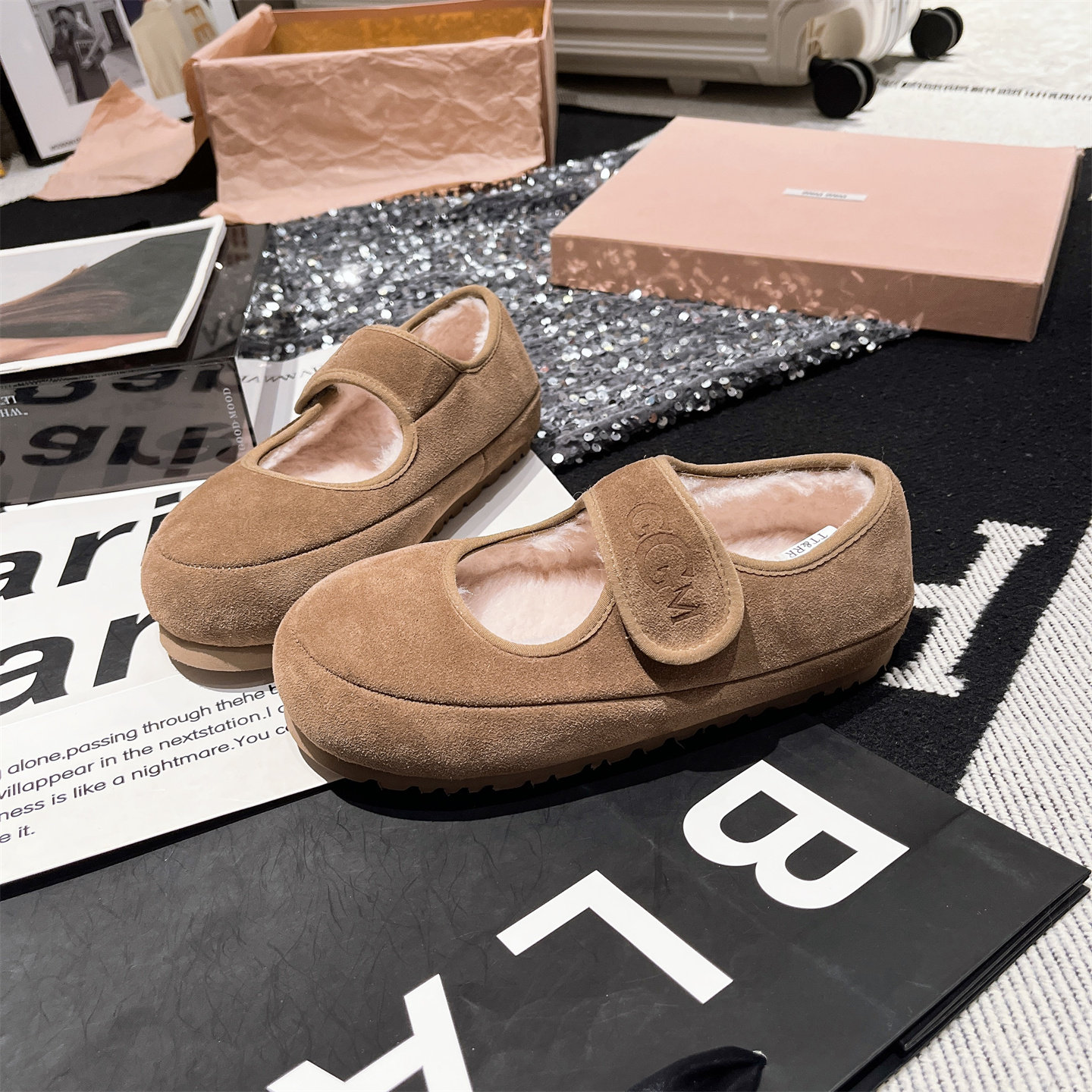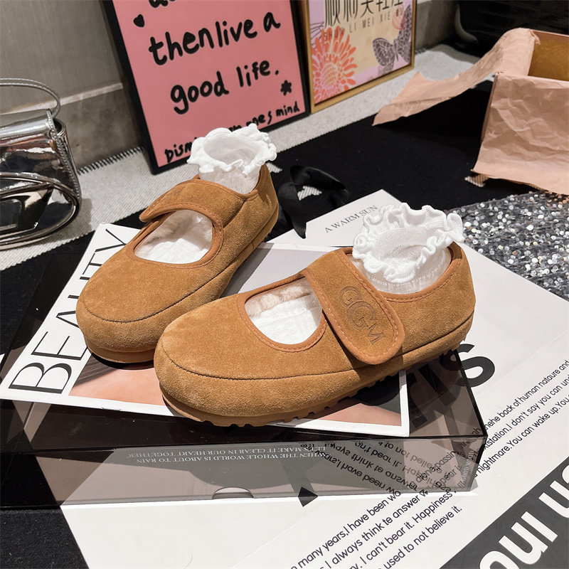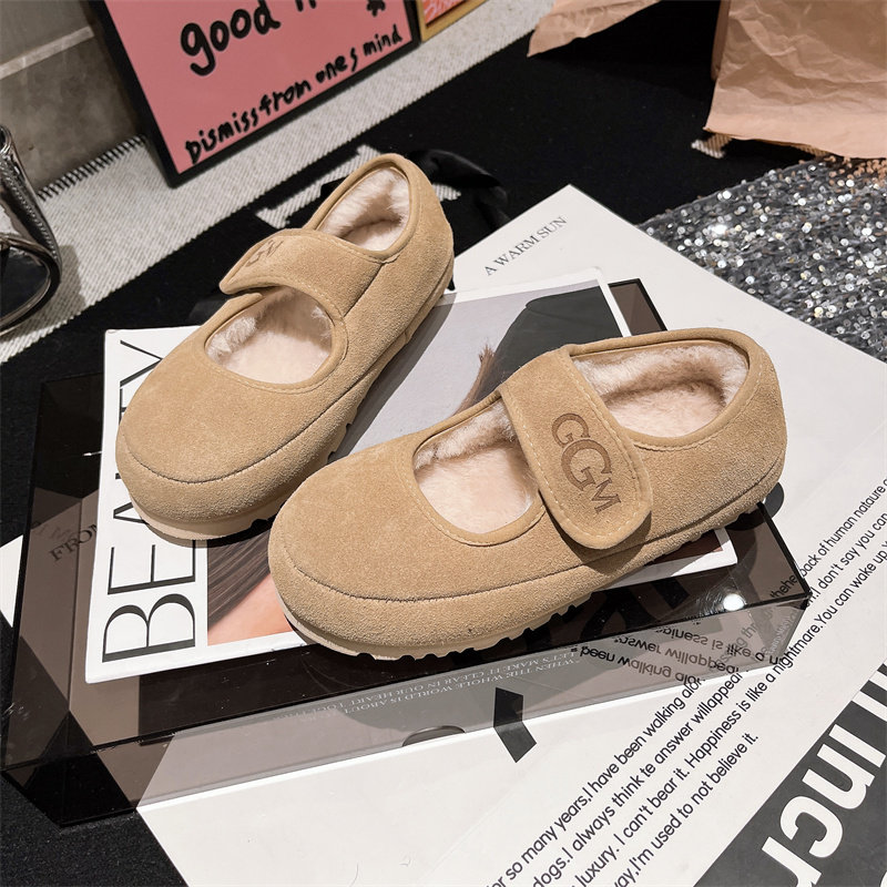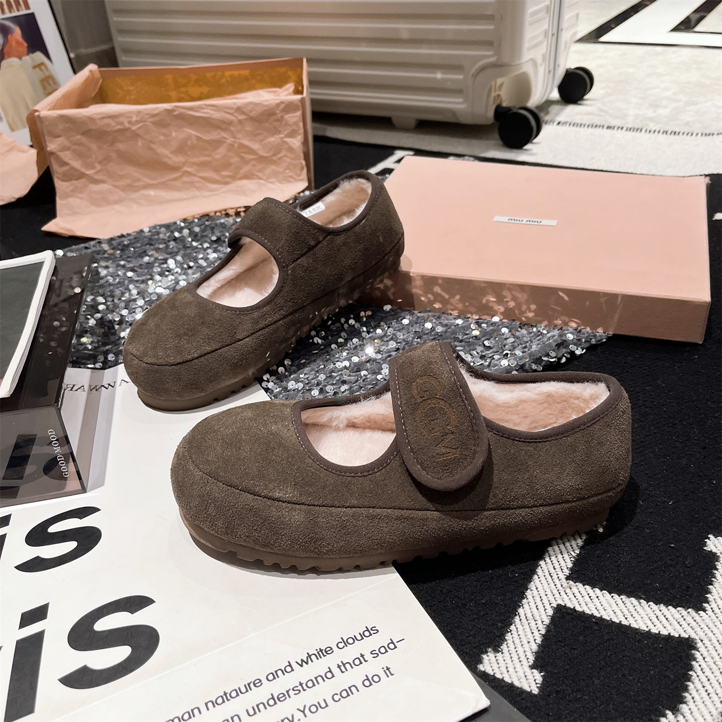Hong Kong Genuine Leather Flat Mary Jane Birkenstock Shoes, Furry Cotton Shoes for Women, 2025 Winter, Velcro Lazy Slip-On Casual Shoes
