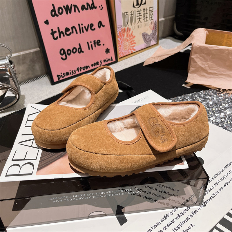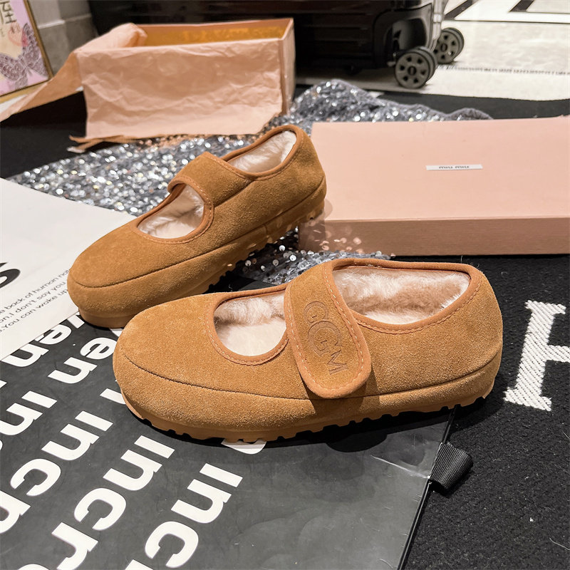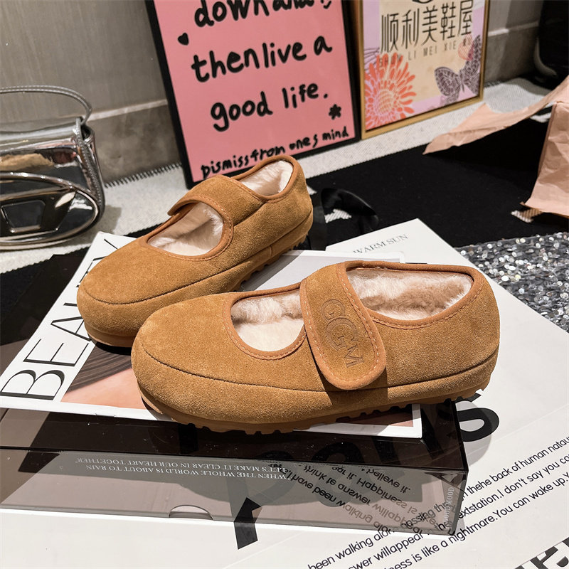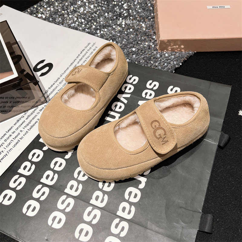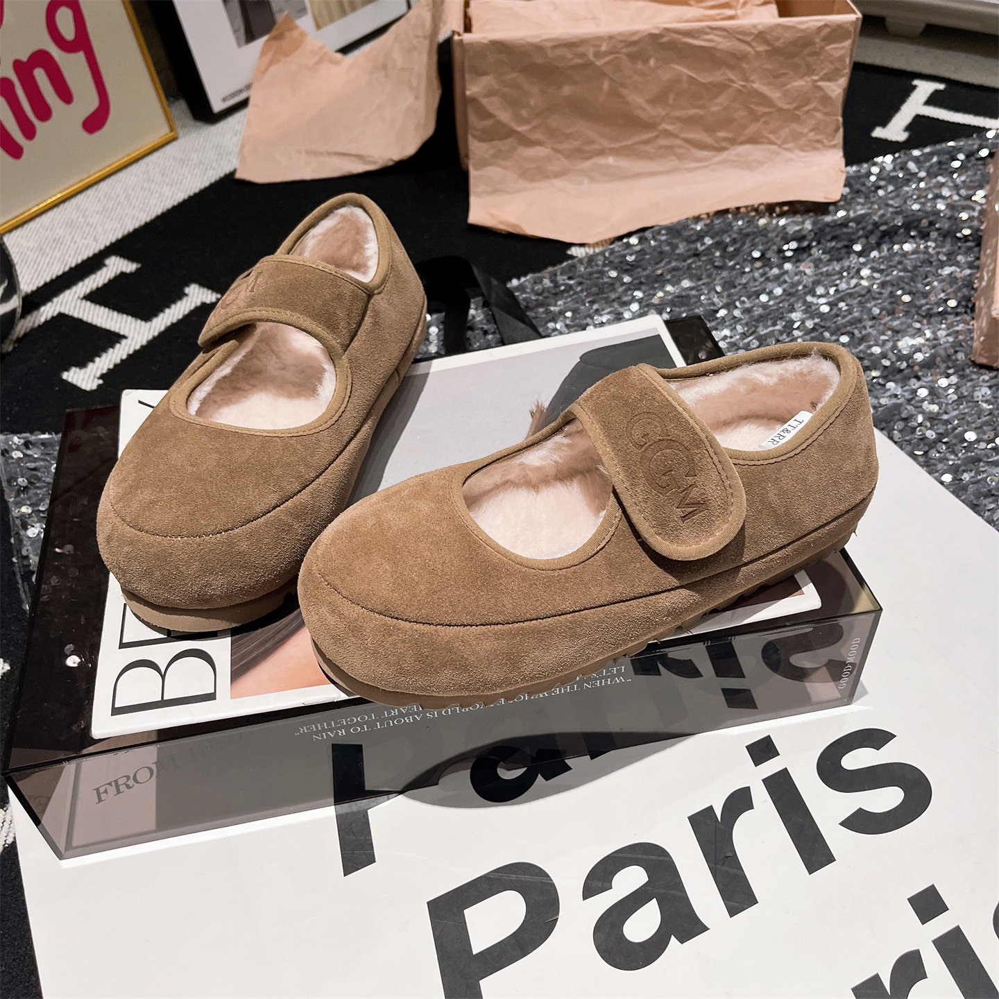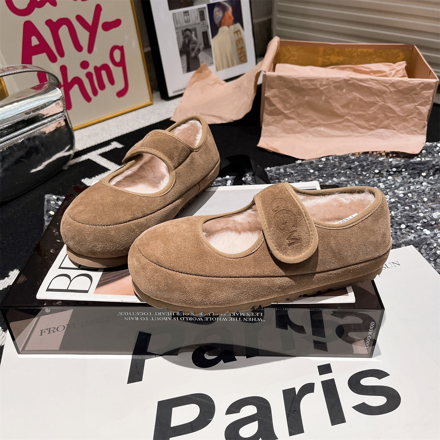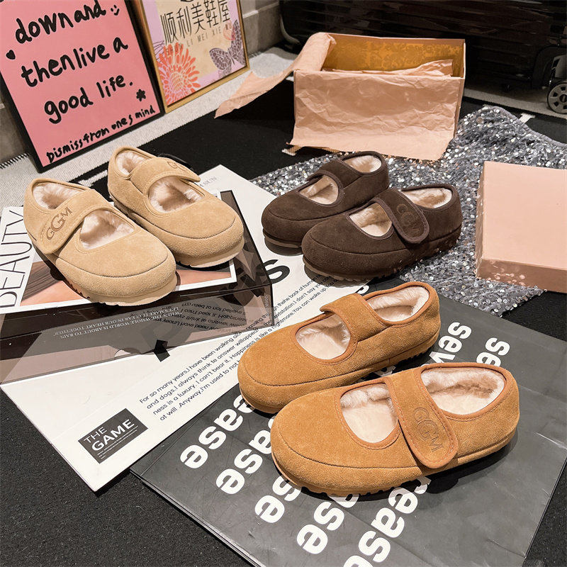 Hong Kong Genuine Leather Flat Mary Jane Birkenstock Shoes, Furry Cotton Shoes for Women, 2025 Winter, Velcro Lazy Slip-On Casual Shoes