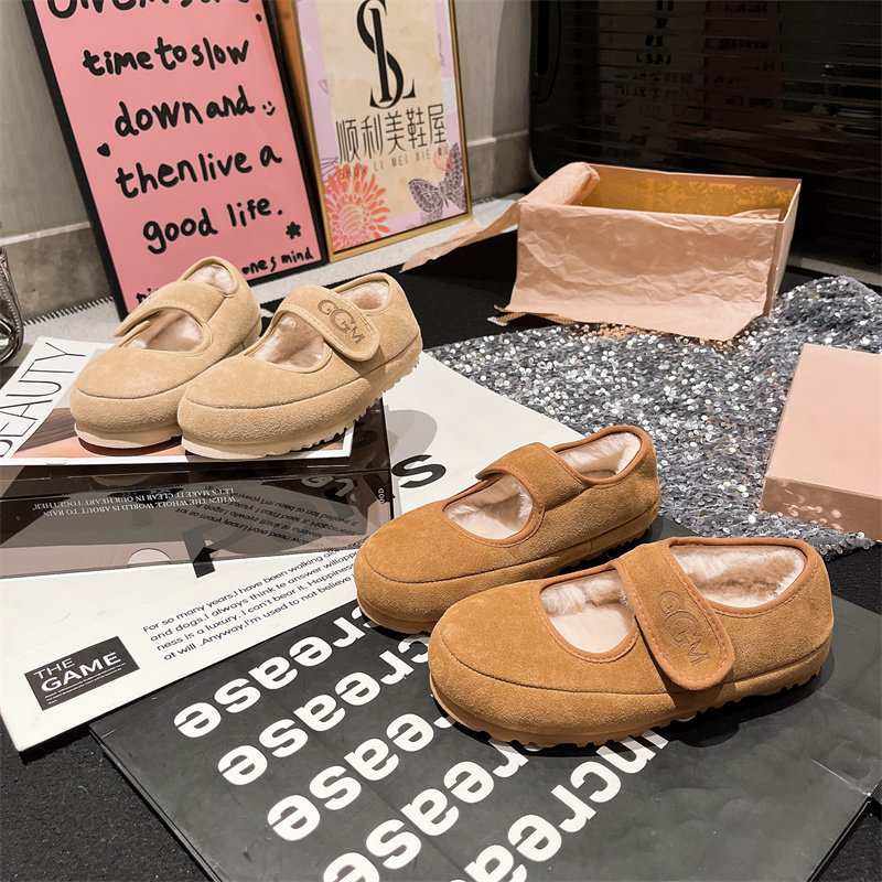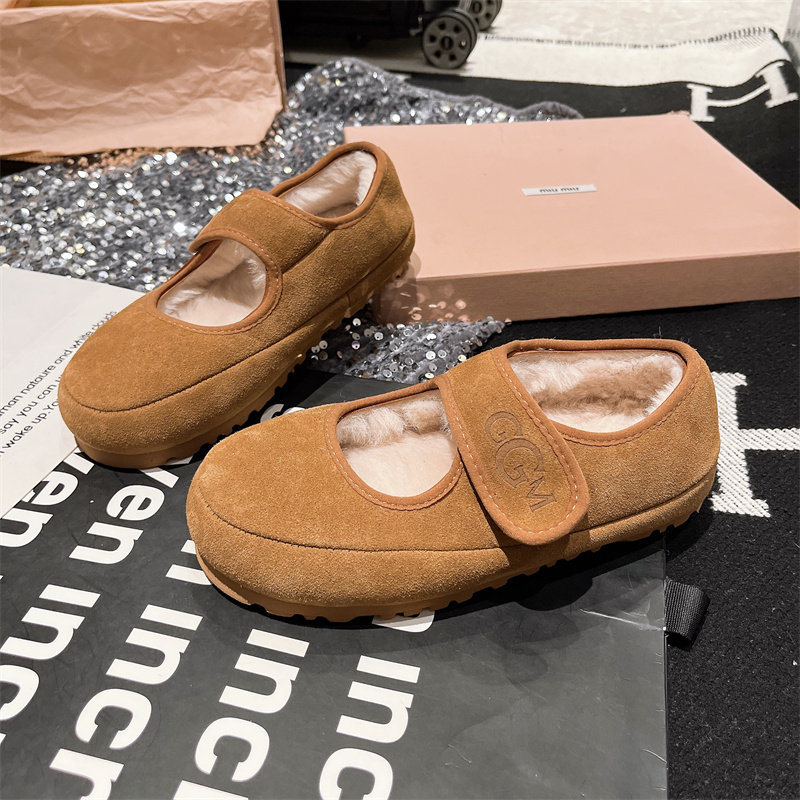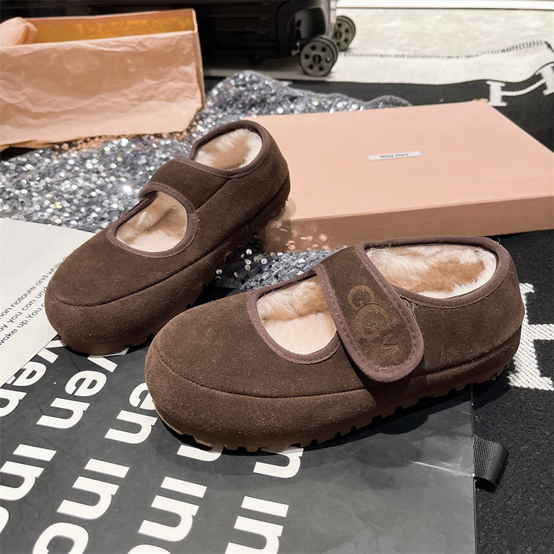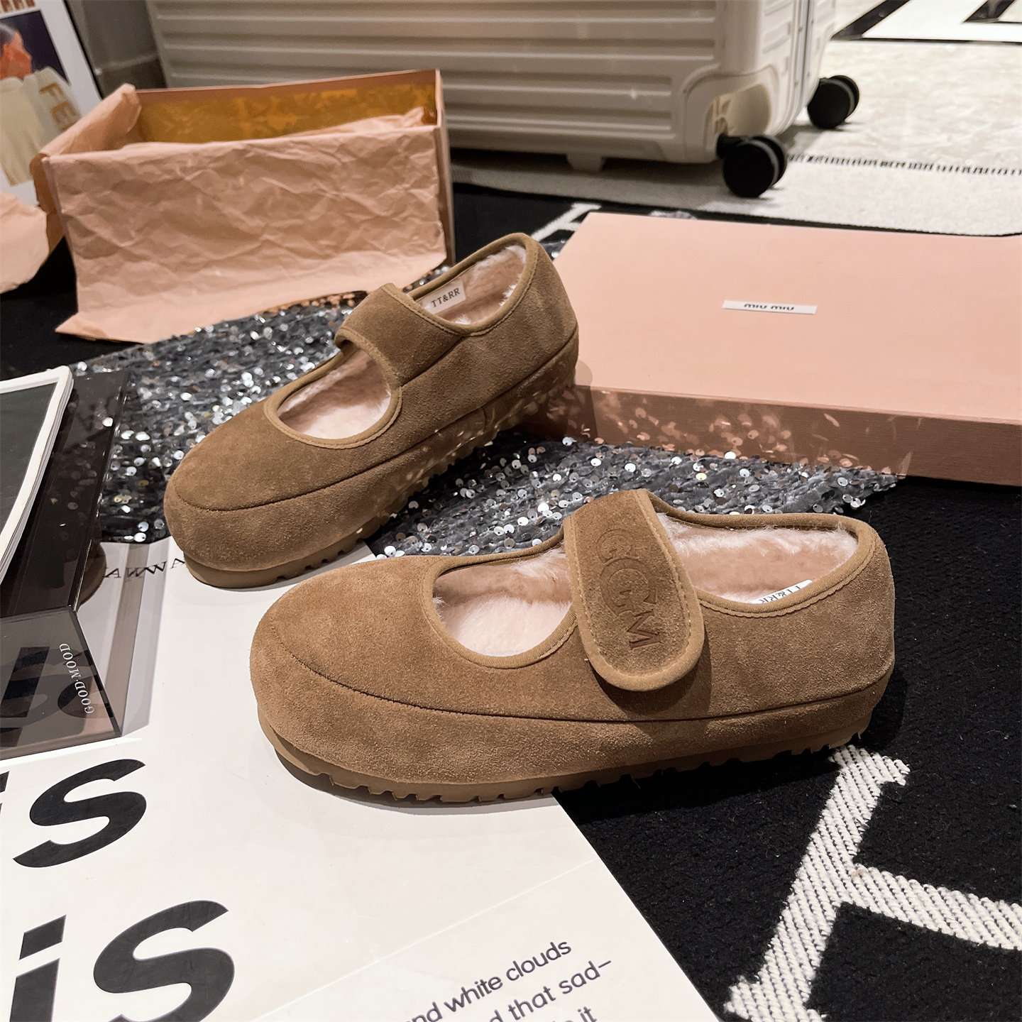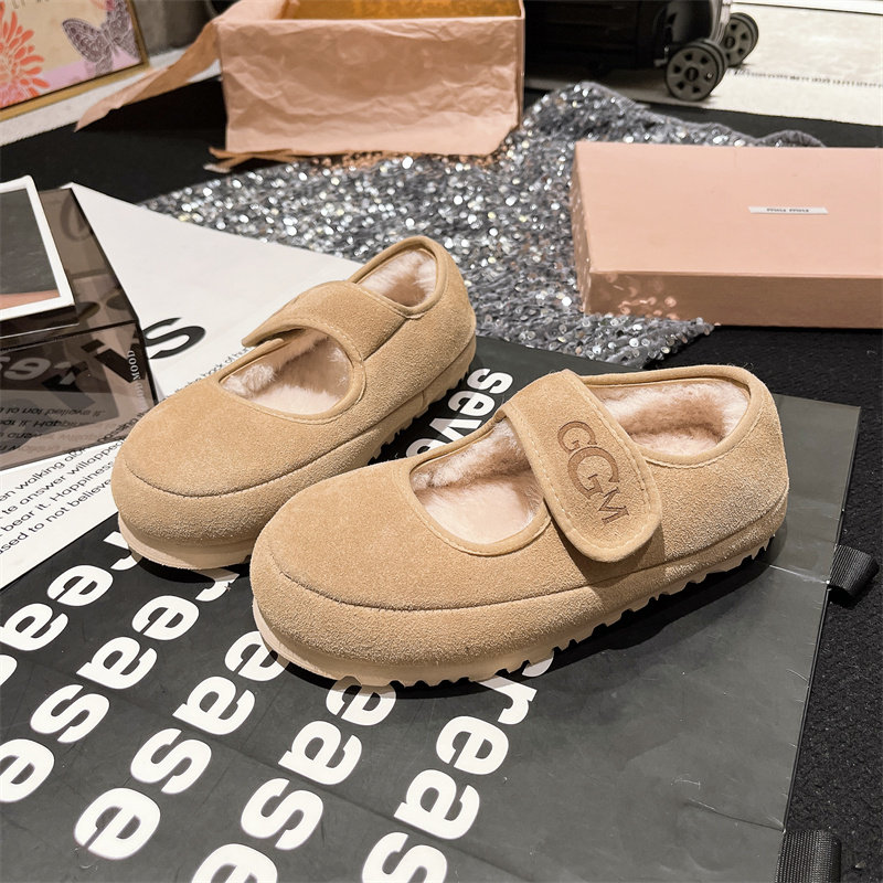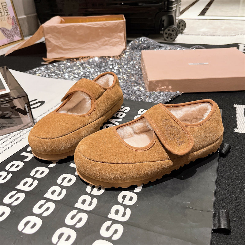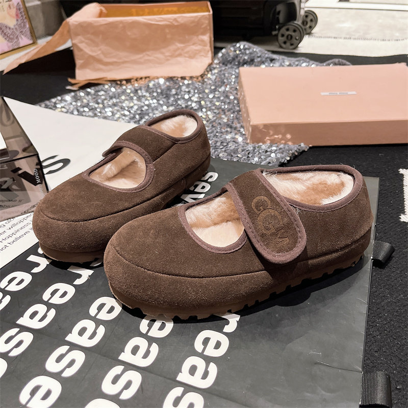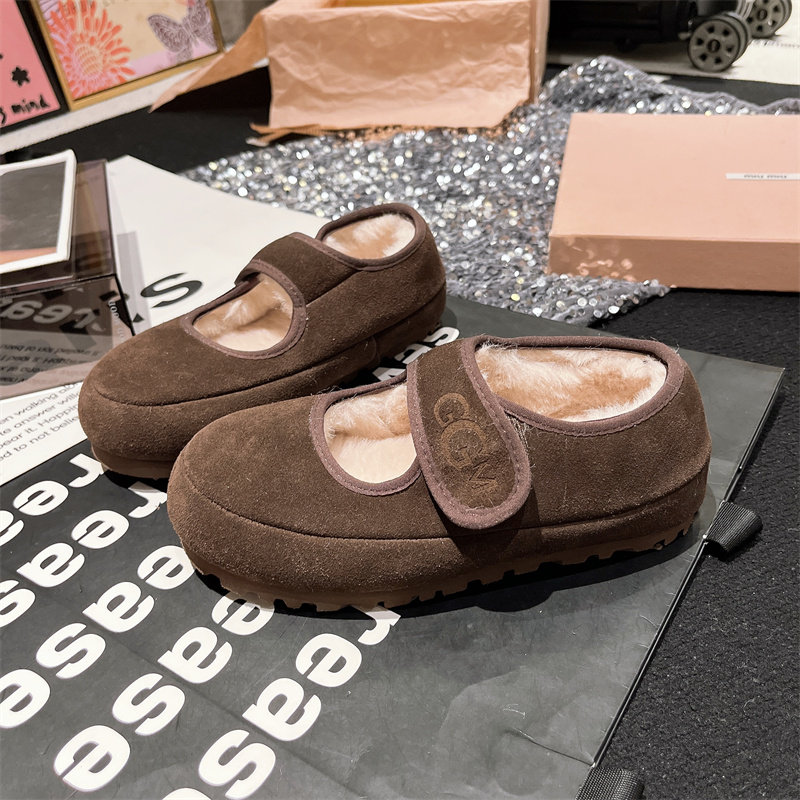 Hong Kong Genuine Leather Flat Mary Jane Birkenstock Shoes, Furry Cotton Shoes for Women, 2025 Winter, Velcro Lazy Slip-On Casual Shoes
