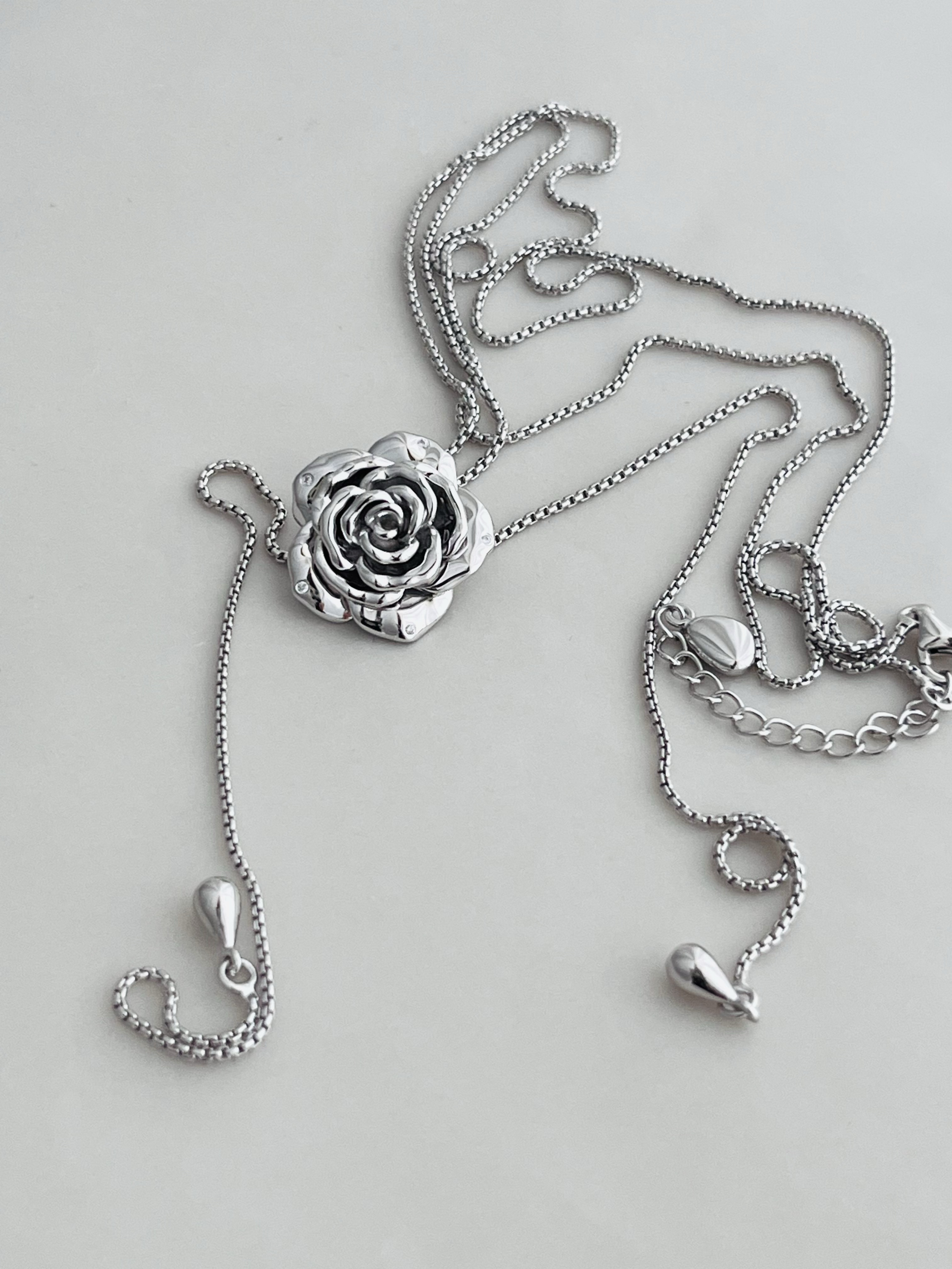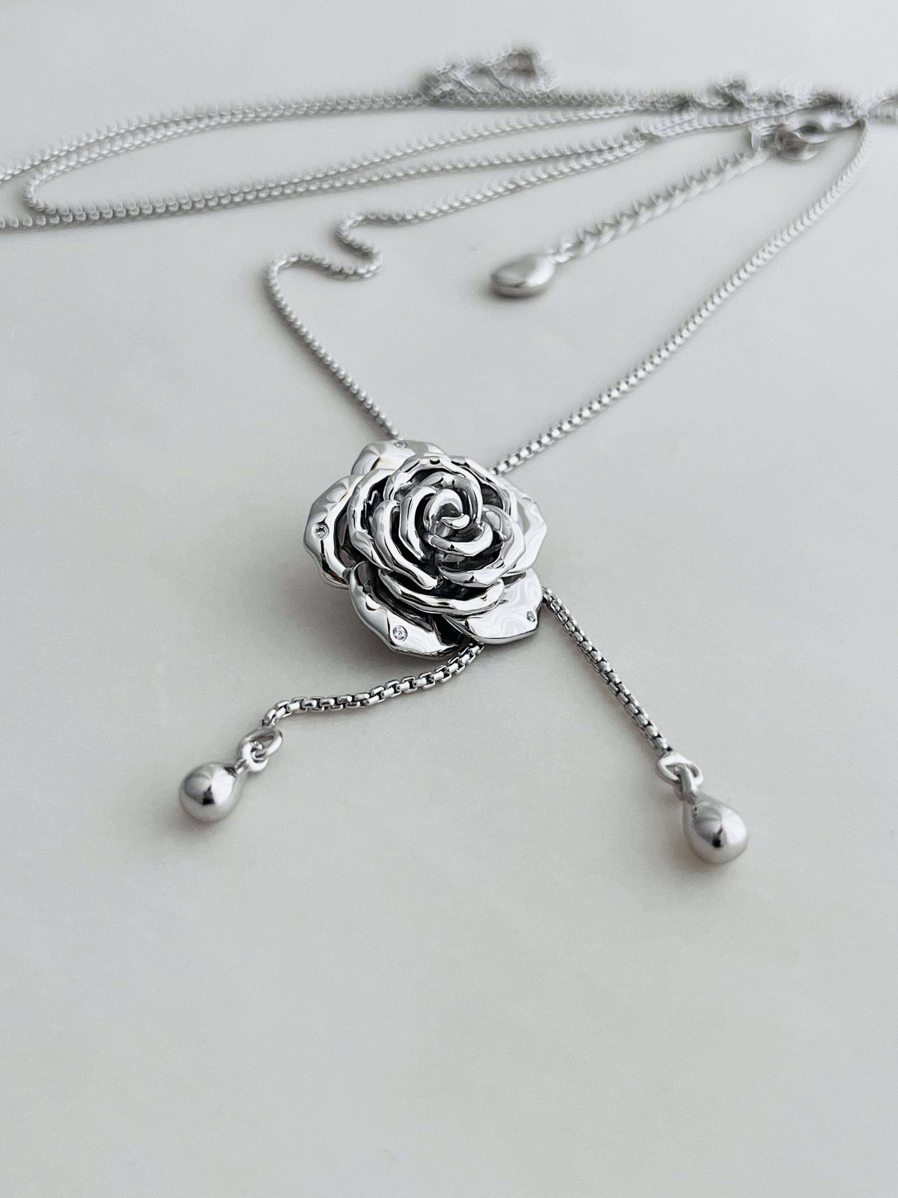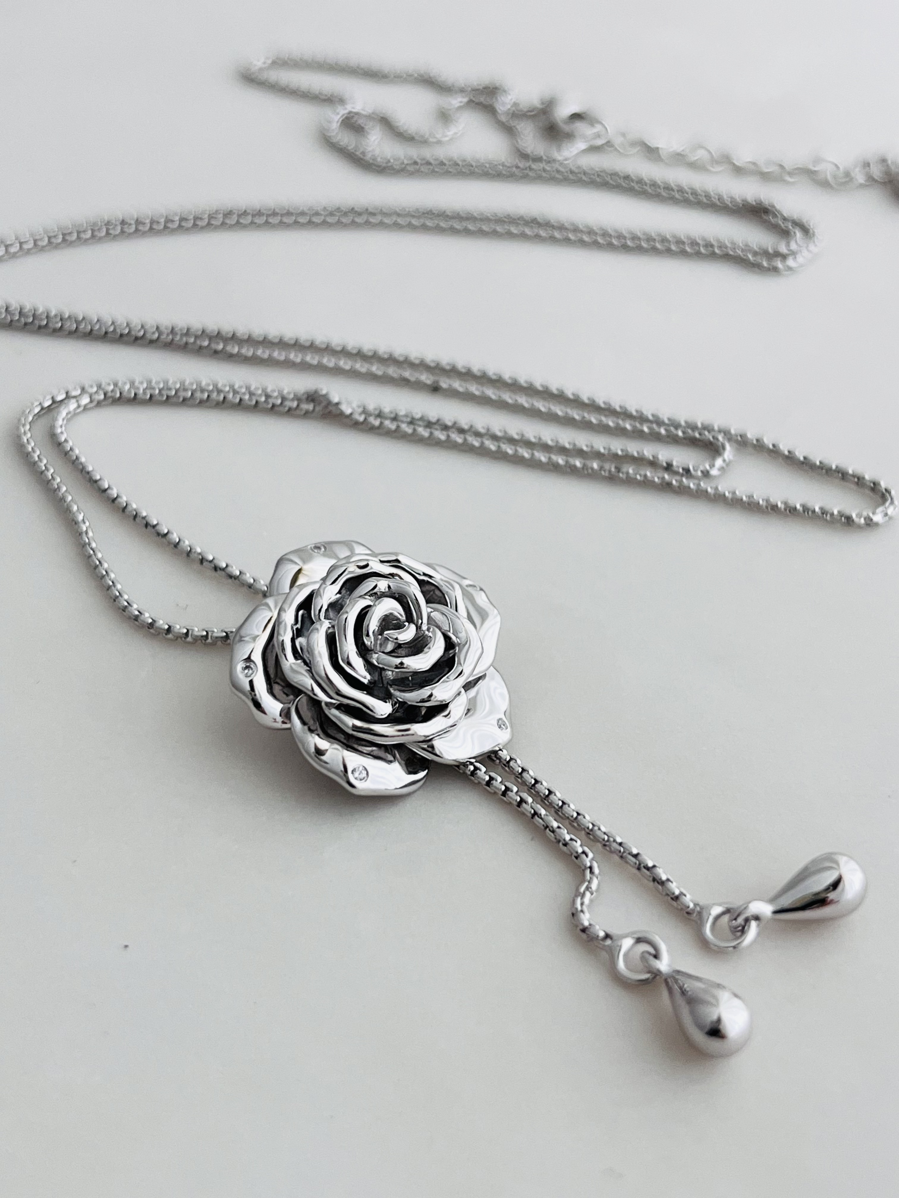 Wz&Silver Designer Style All-Over S925 Sterling Silver Rhodium-Plated Rose Flower Inlaid Pull-Out Craft Sweater Chain