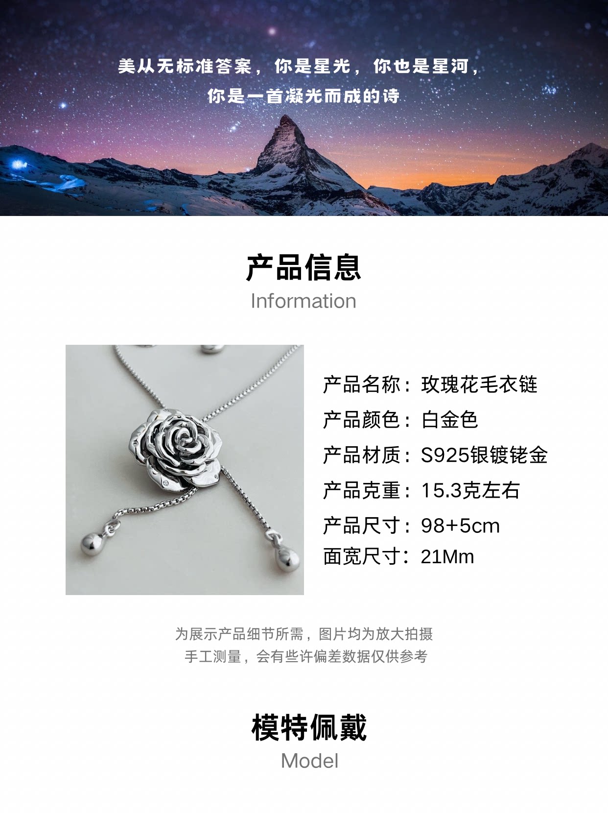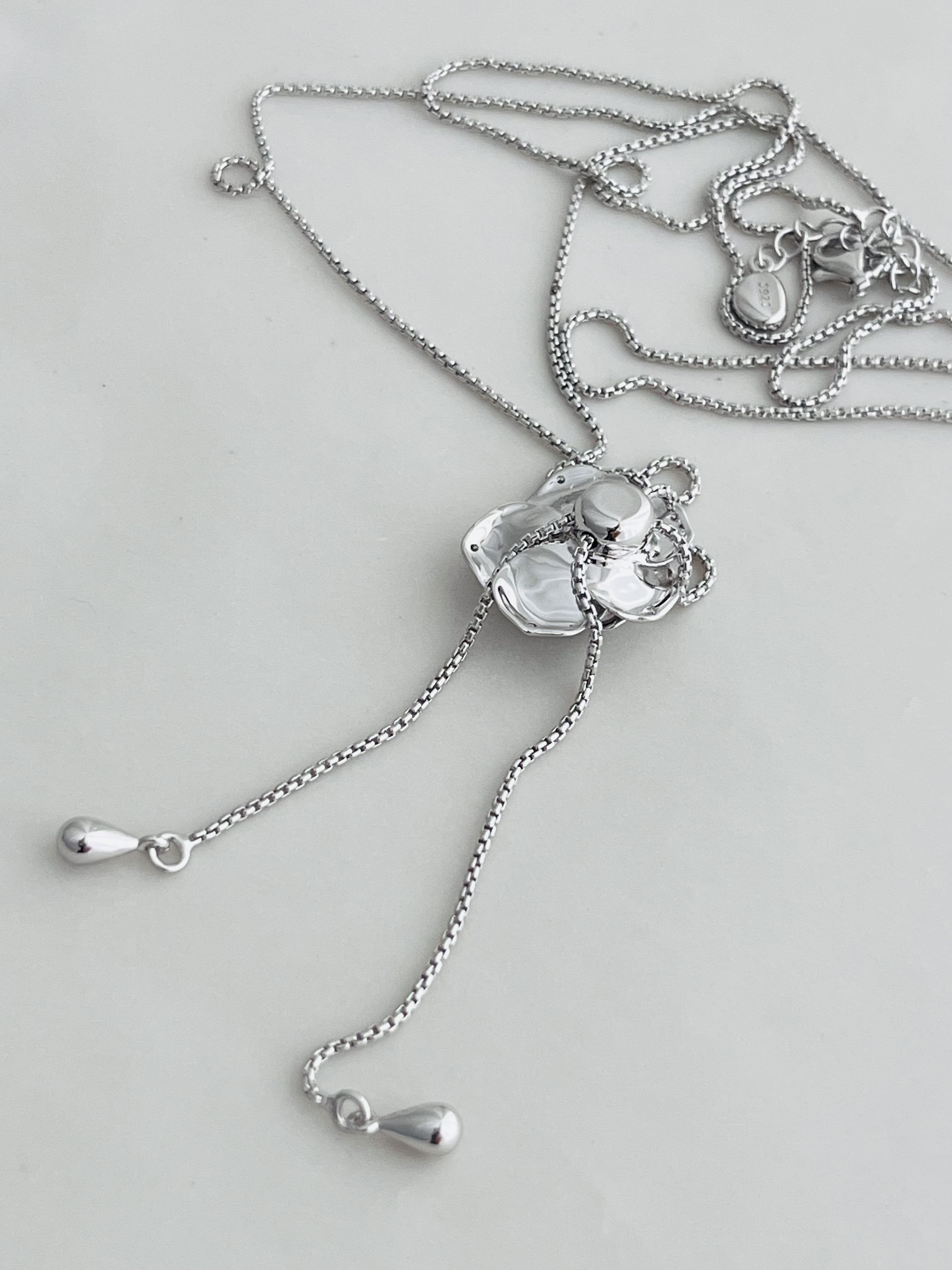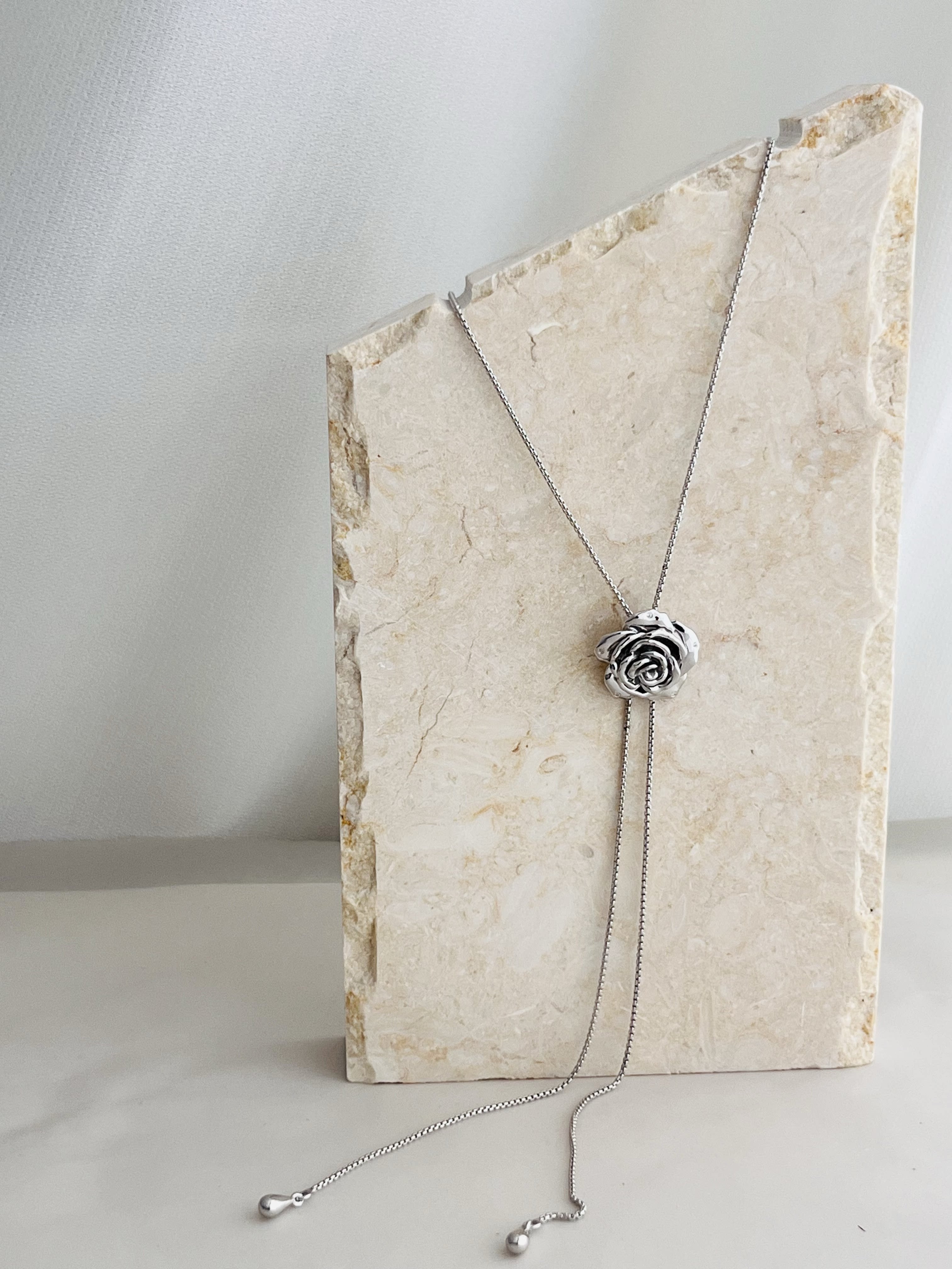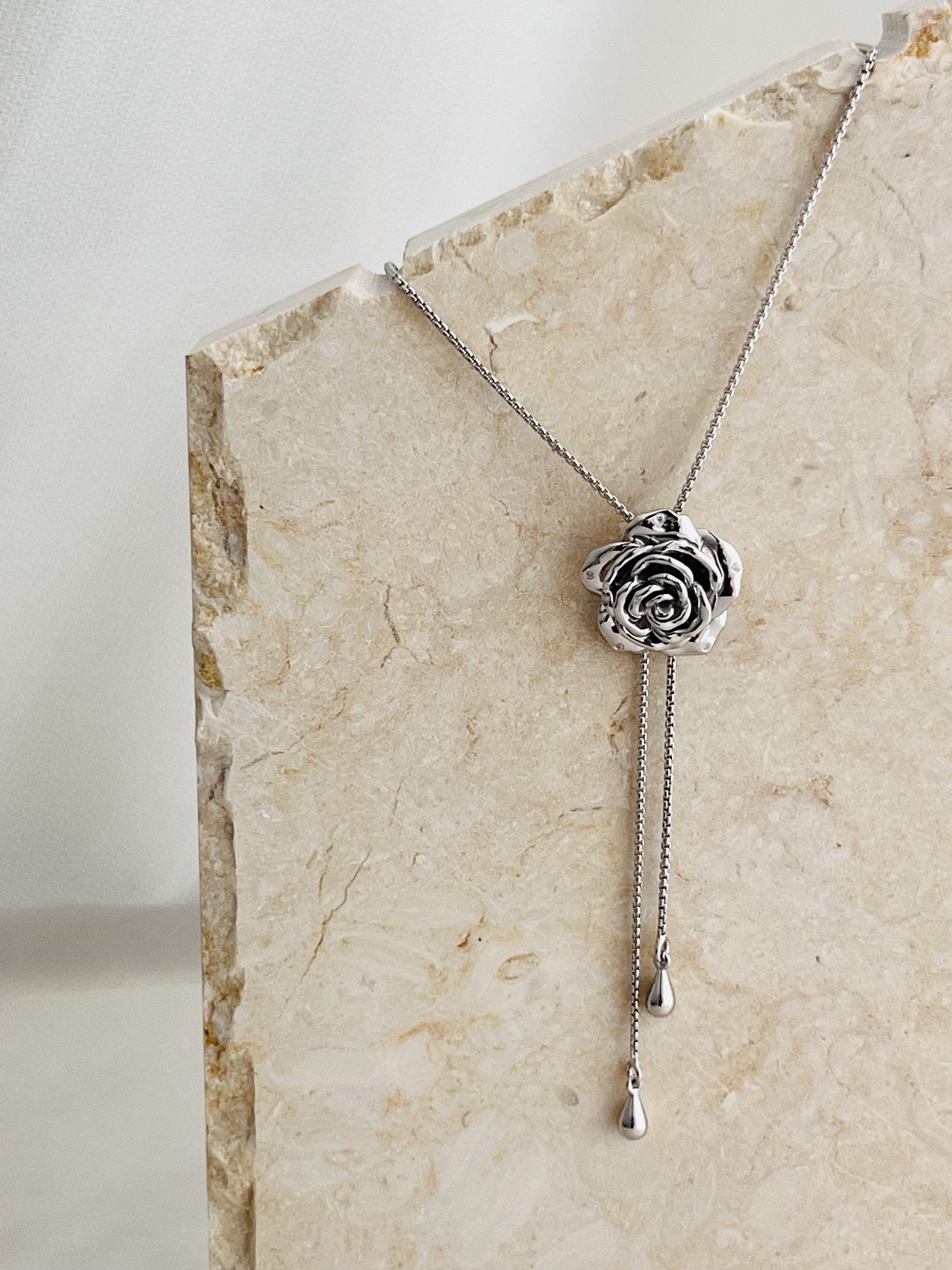 Wz&Silver Designer Style All-Over S925 Sterling Silver Rhodium-Plated Rose Flower Inlaid Pull-Out Craft Sweater Chain