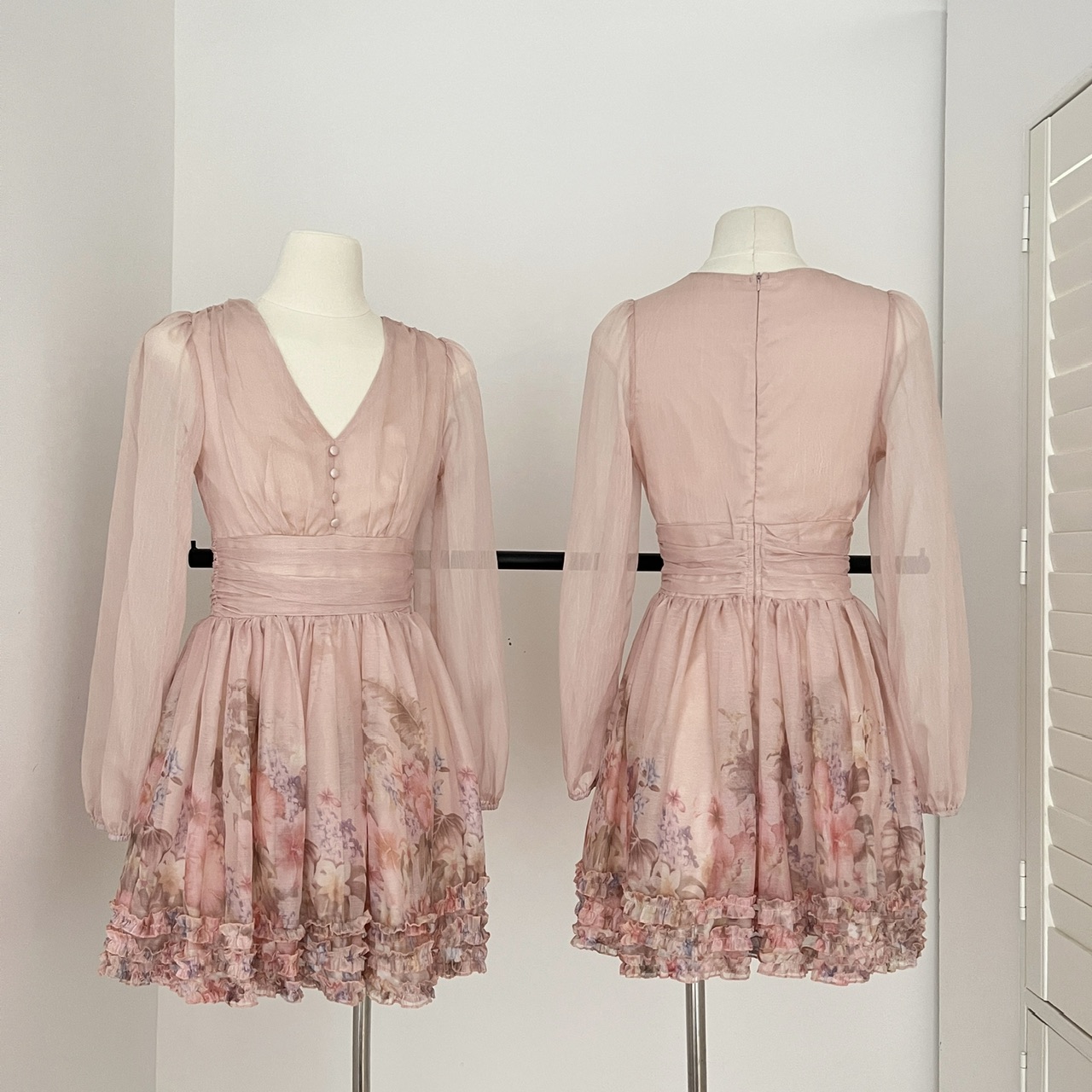 Peach LAOSHU Floral Evening Slimming V-Neck Ruffled Floral Long Sleeve Dress