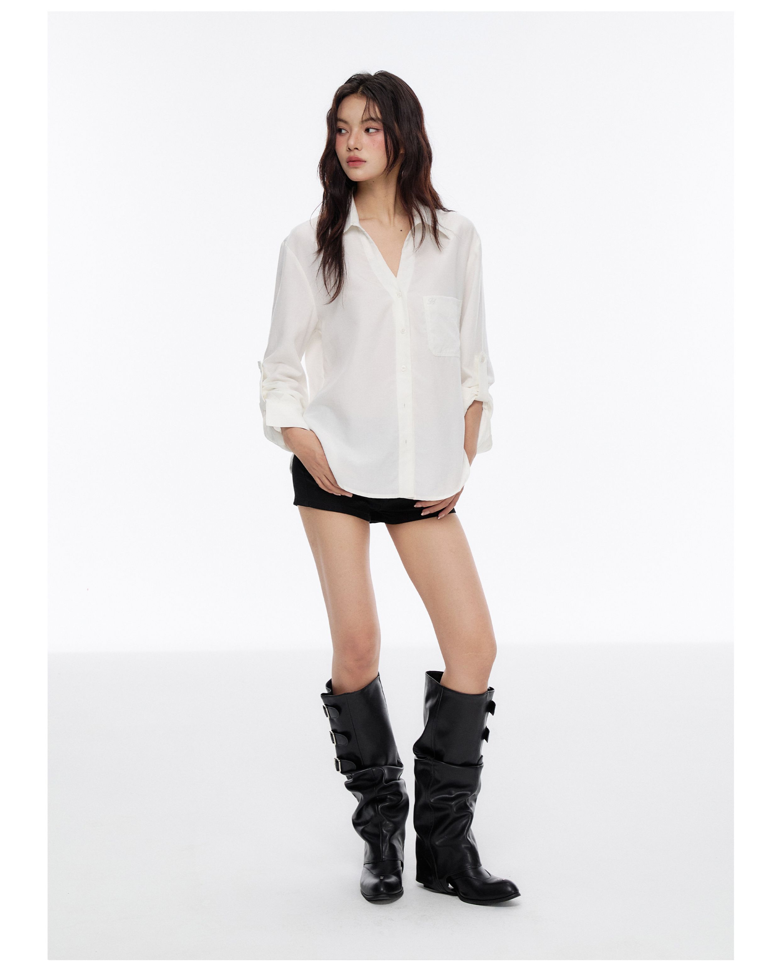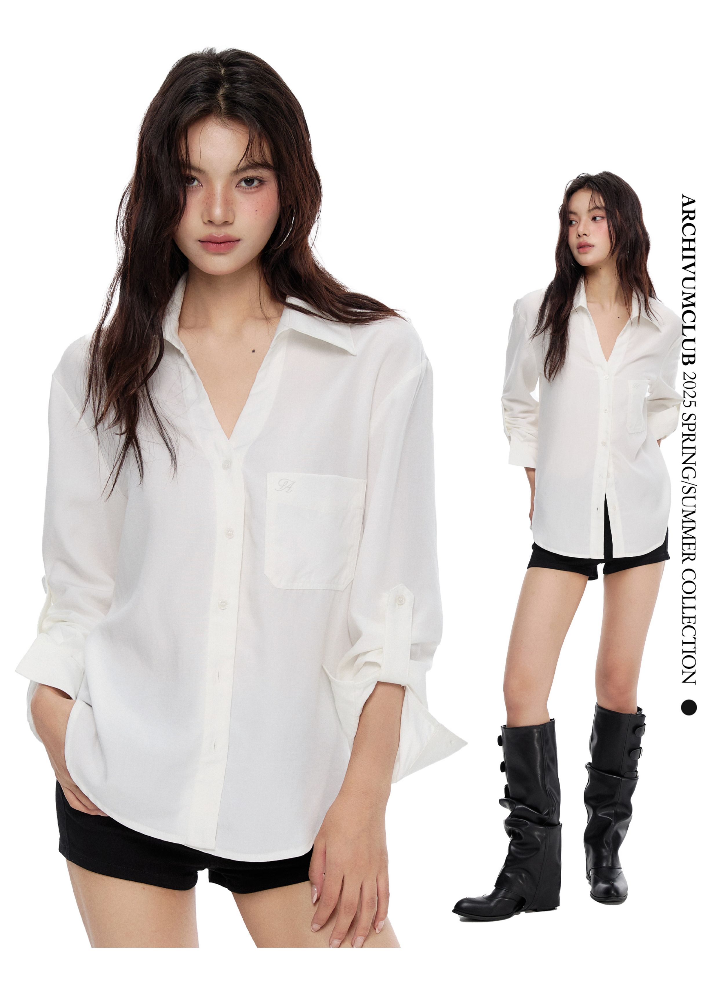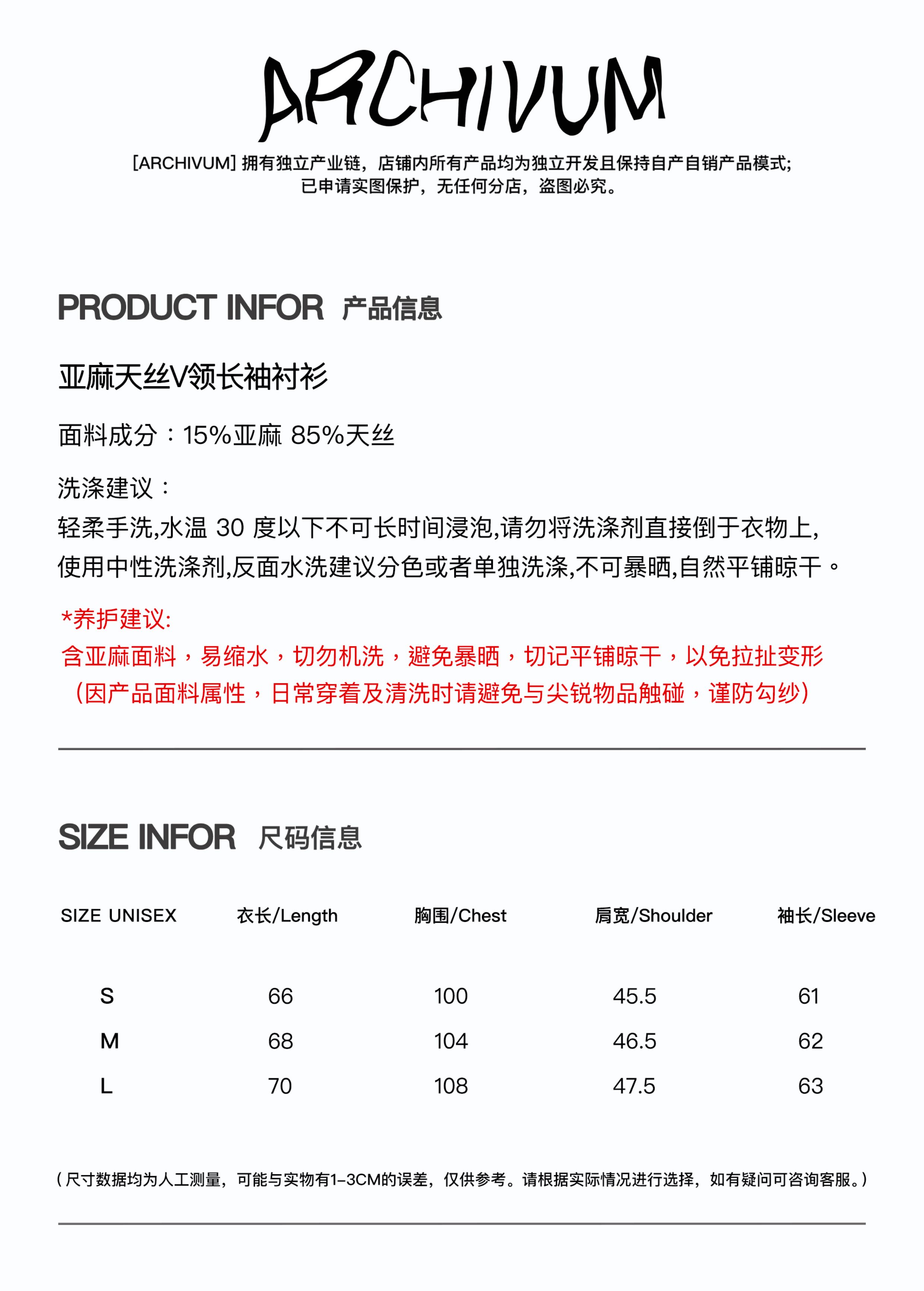 Archivum White V-Neck Old Money Style Loose Casual Relaxed Linen and Tencel Blend Long-Sleeve Shirt