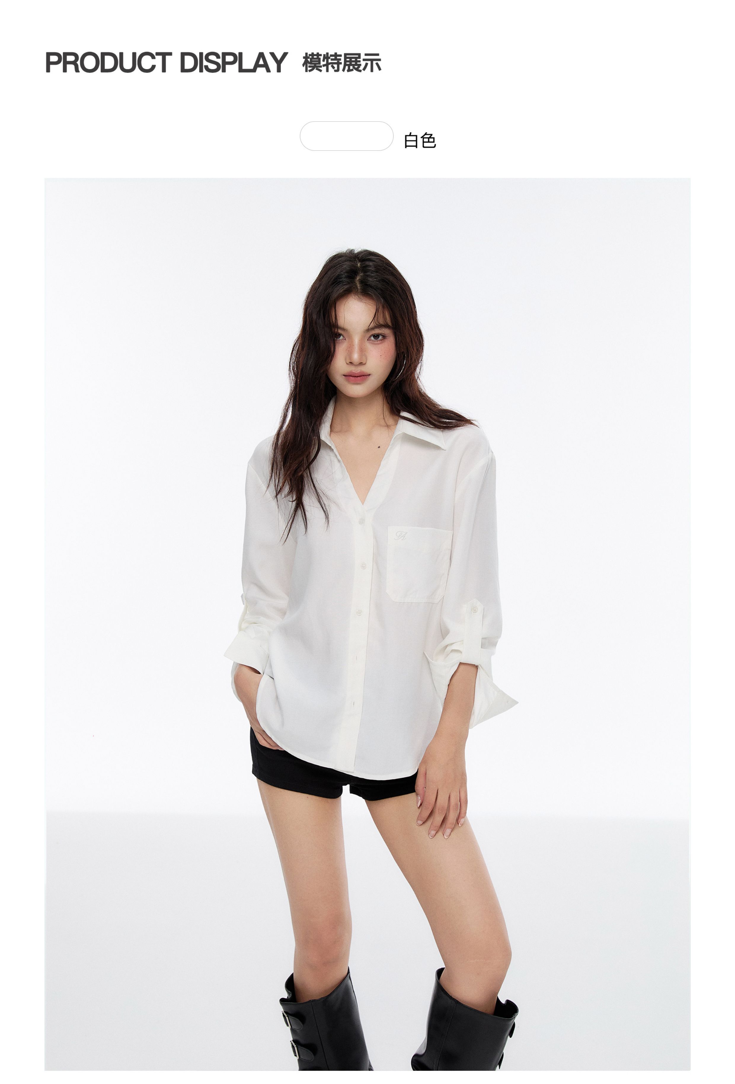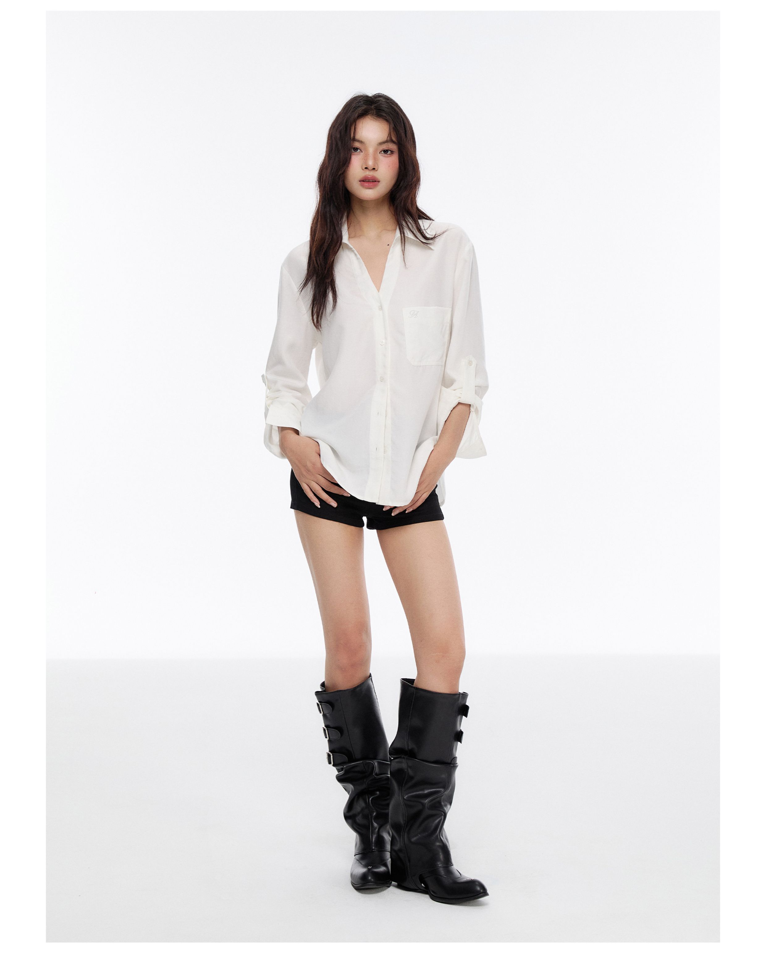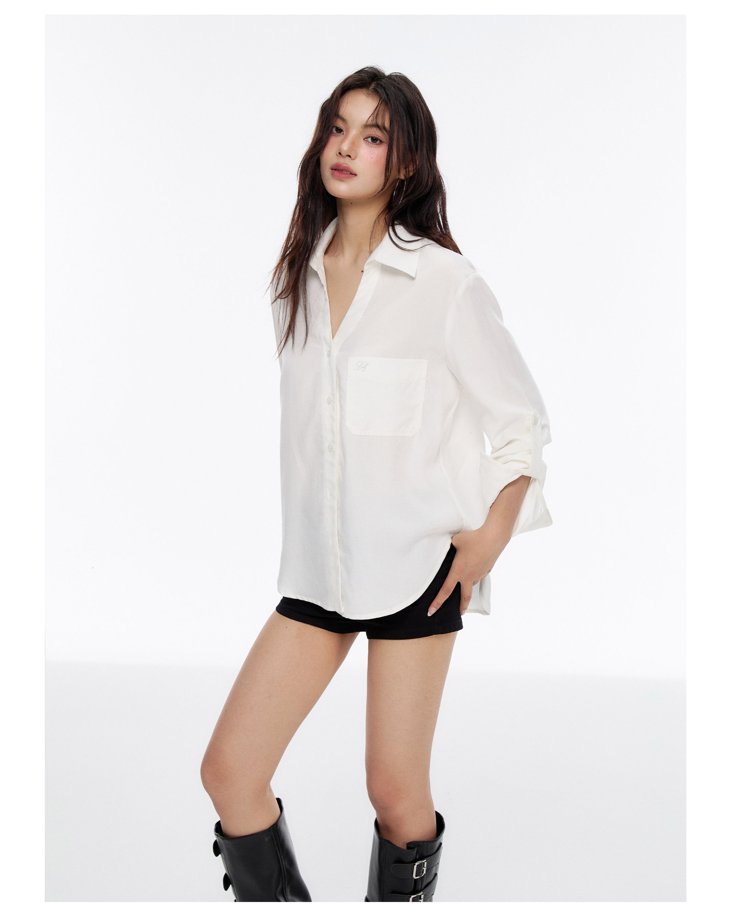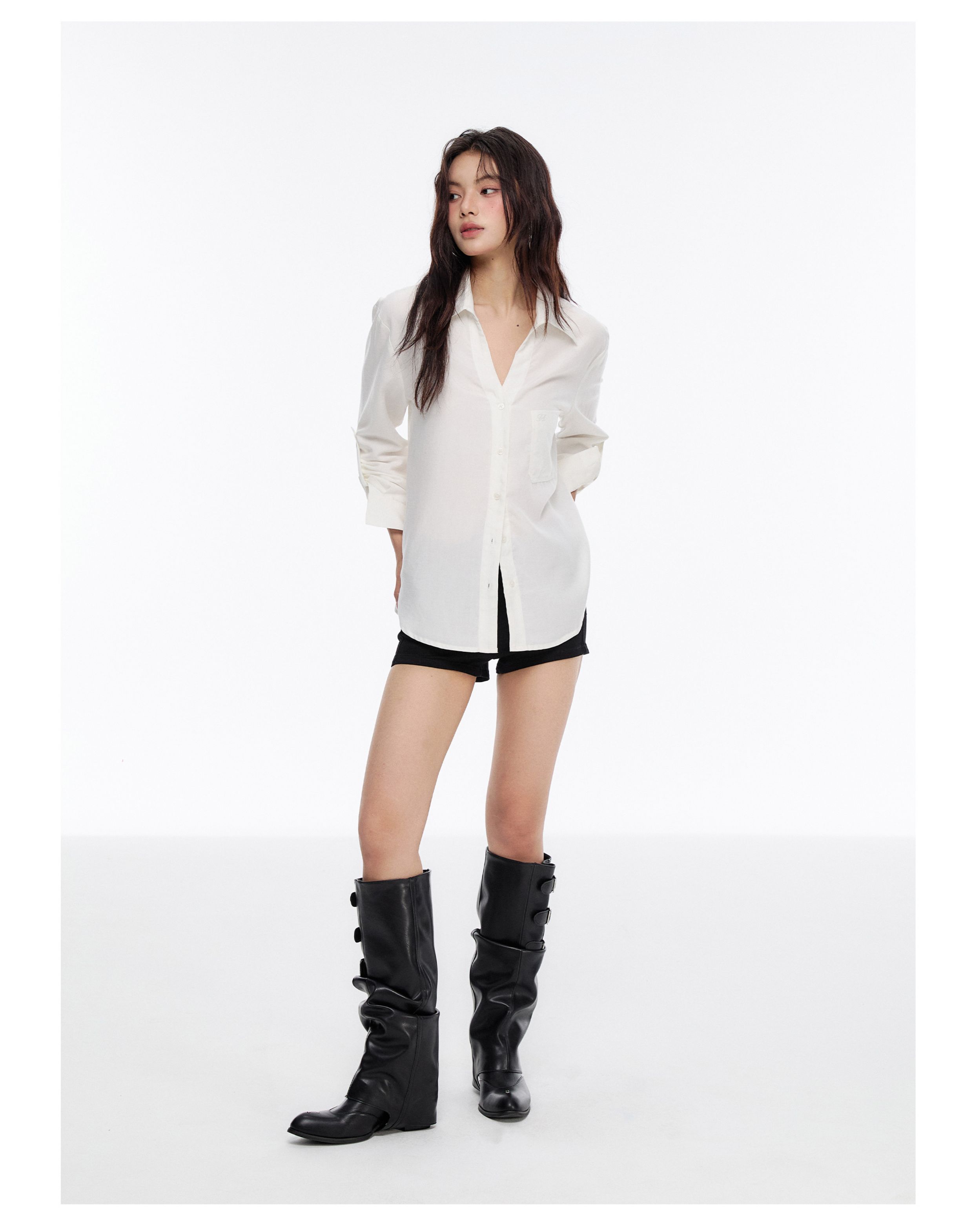 Archivum White V-Neck Old Money Style Loose Casual Relaxed Linen and Tencel Blend Long-Sleeve Shirt