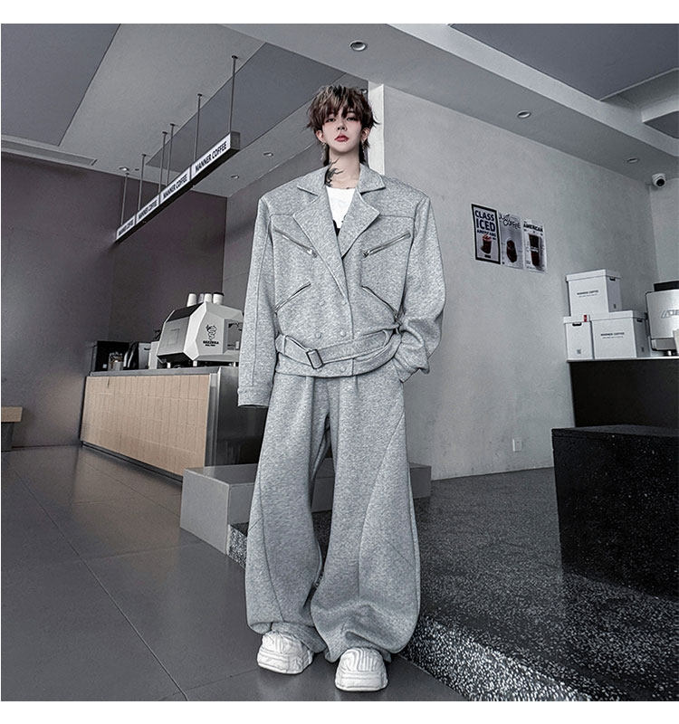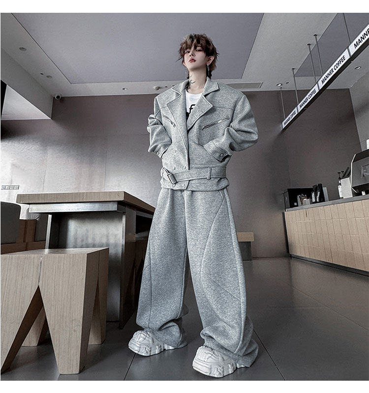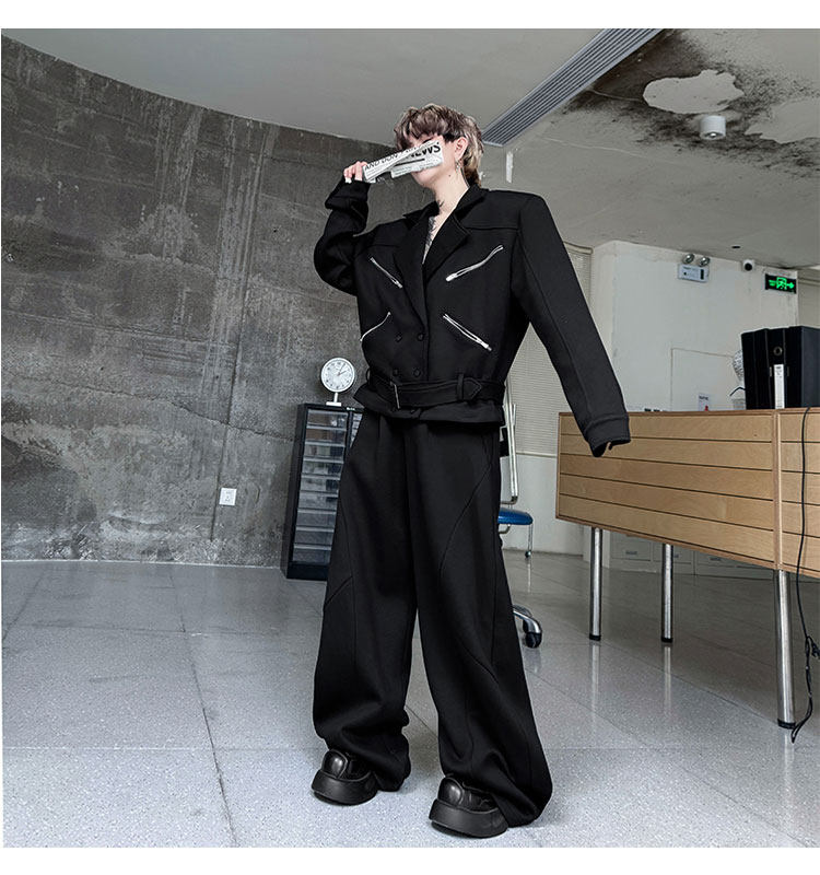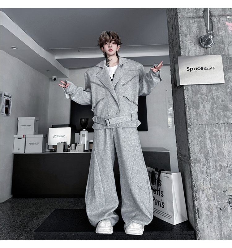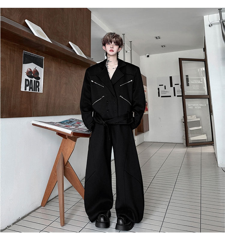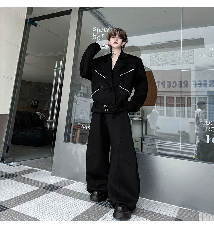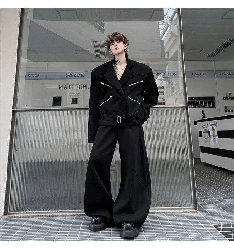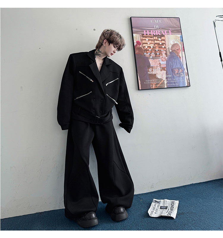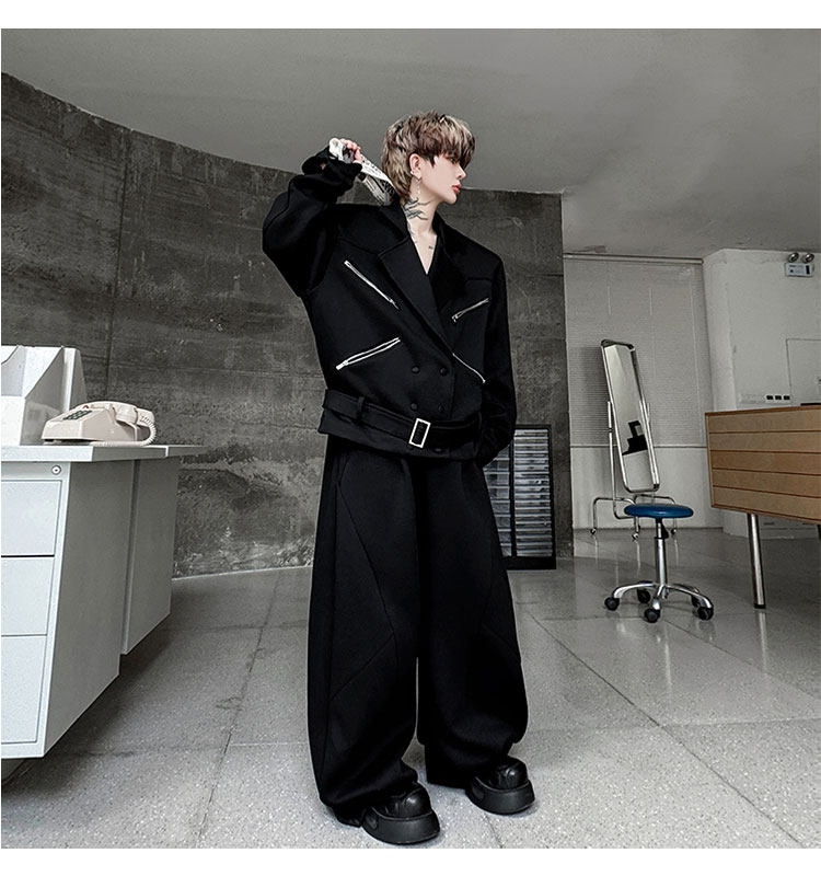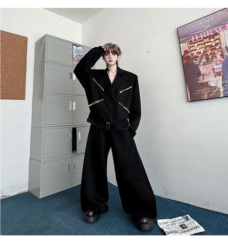 Autumn Outfit with a Unique Zipper Design, Deconstructed Belt, Lapel Jacket, Shoulder Pads, Men's Two-Piece Set with Scimitar-Style Wide-Leg Pants, Trendy
