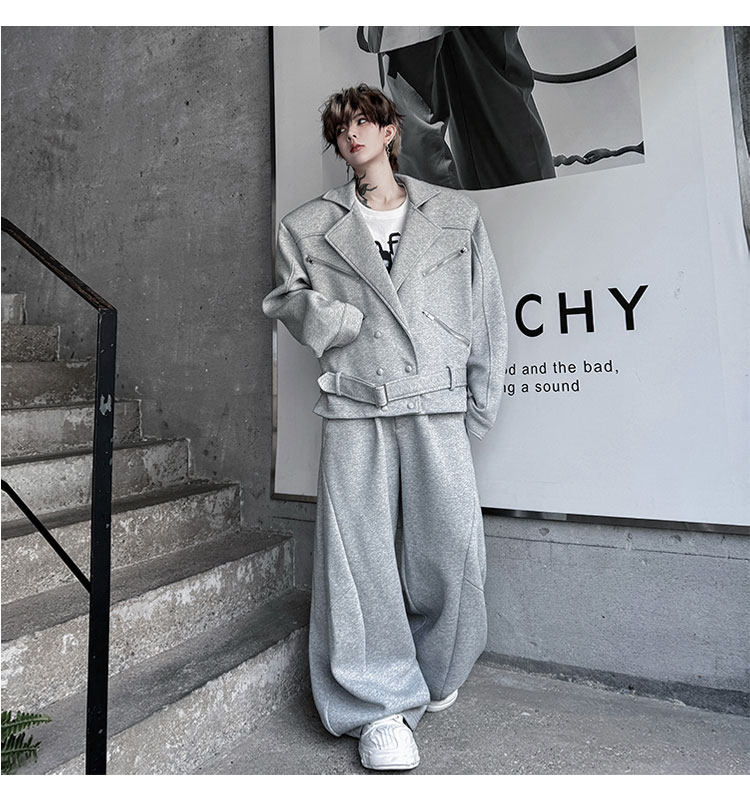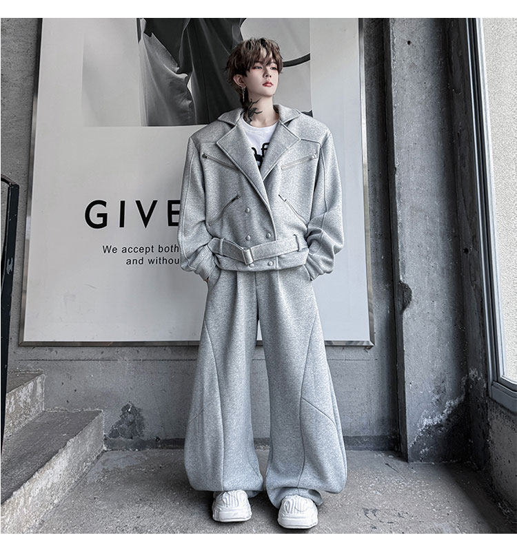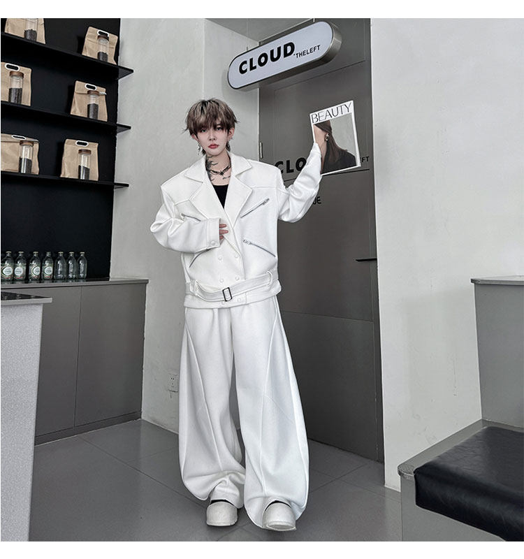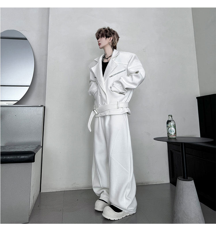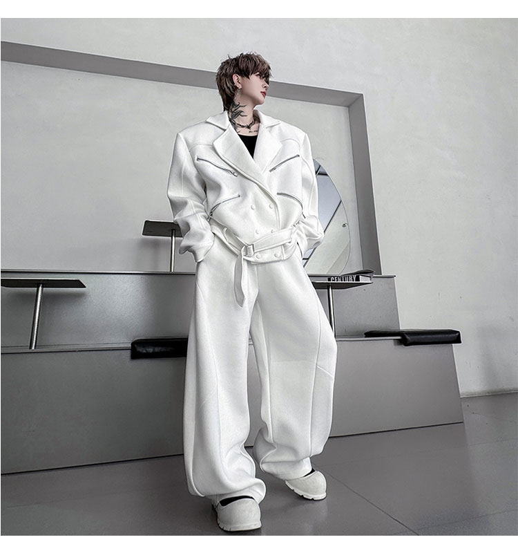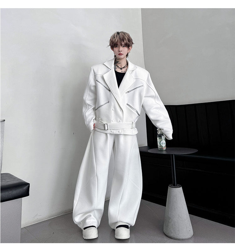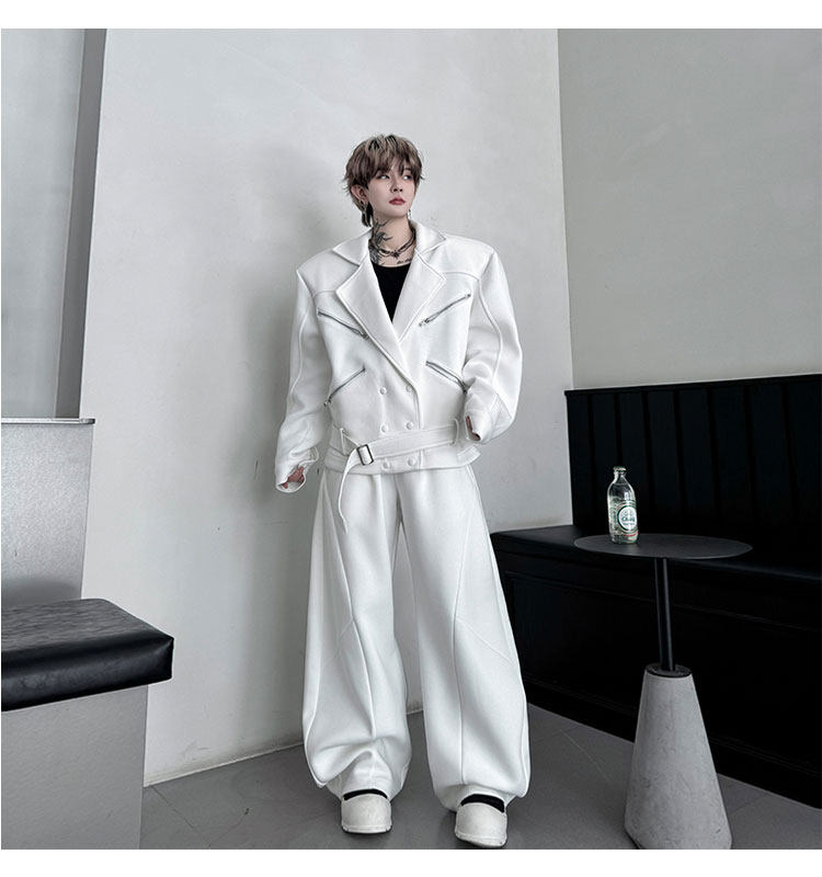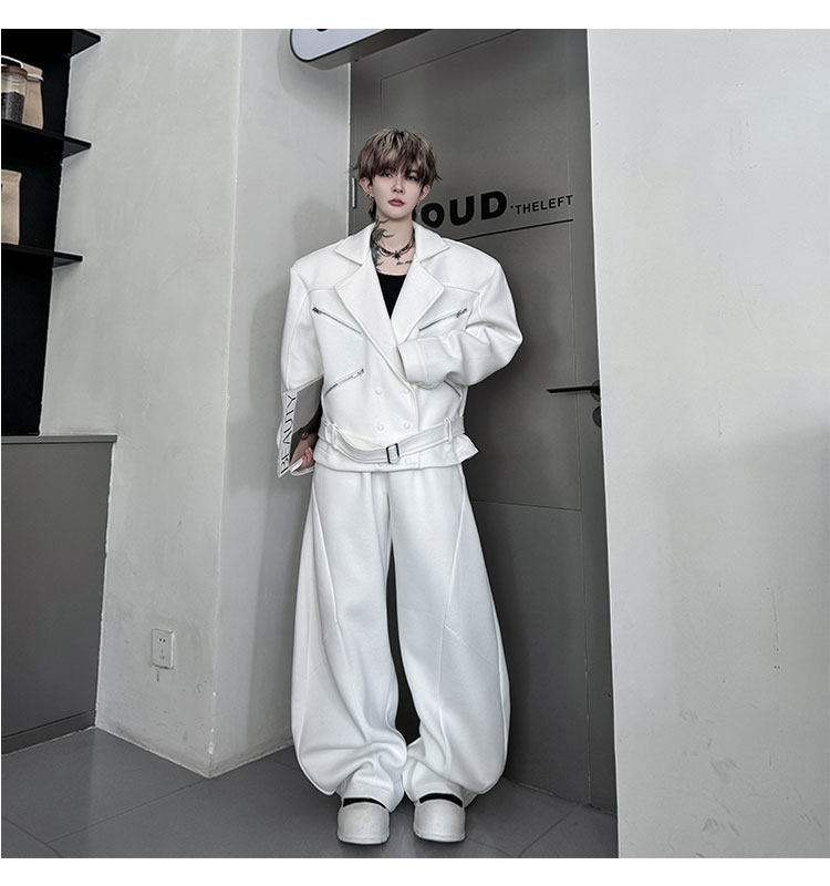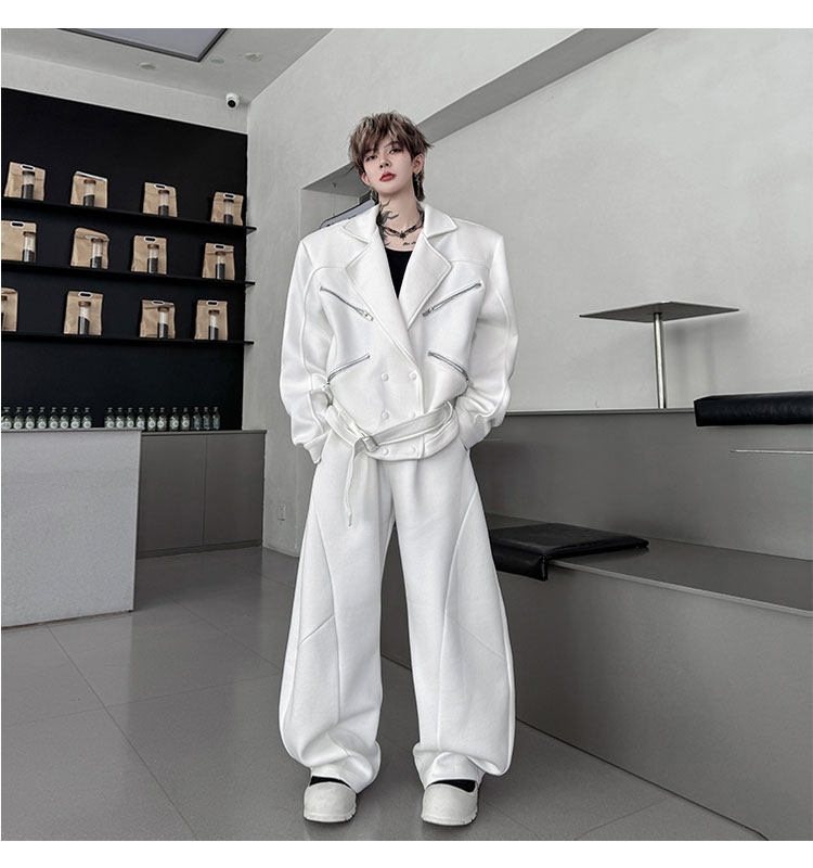 Autumn Outfit with a Unique Zipper Design, Deconstructed Belt, Lapel Jacket, Shoulder Pads, Men's Two-Piece Set with Scimitar-Style Wide-Leg Pants, Trendy