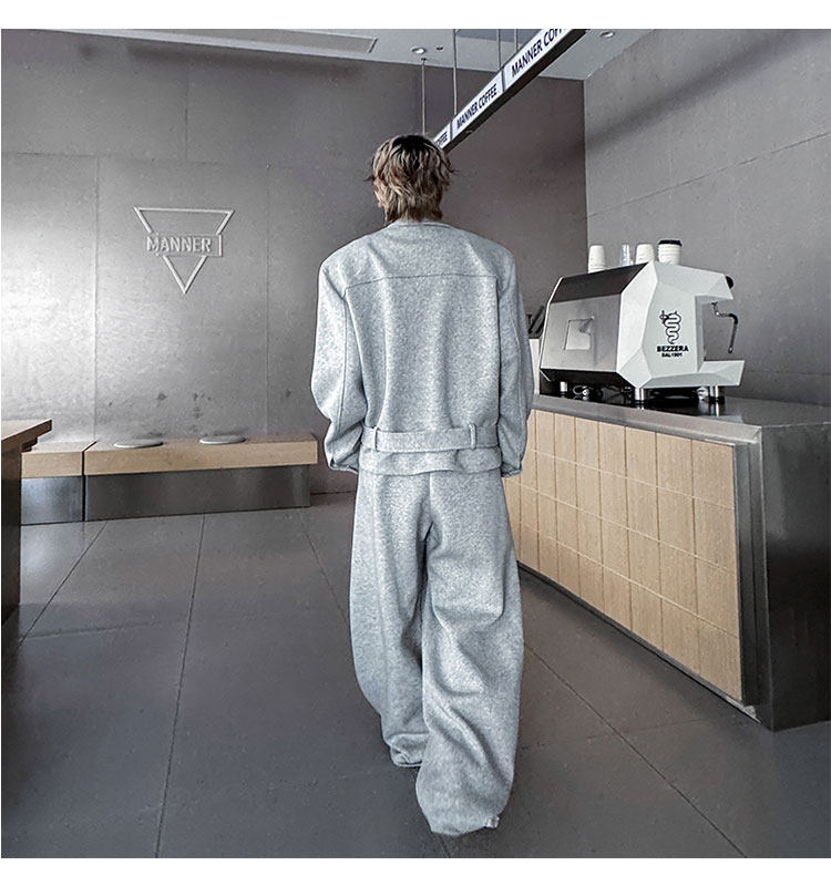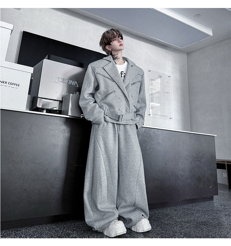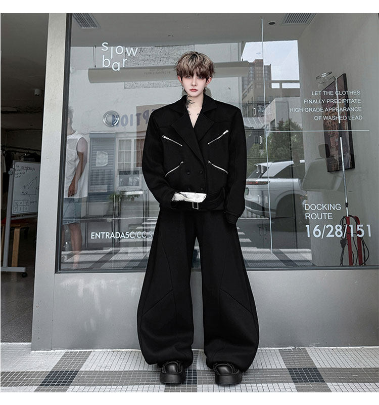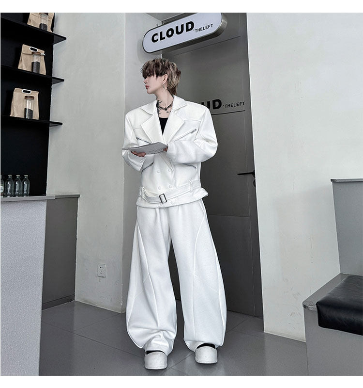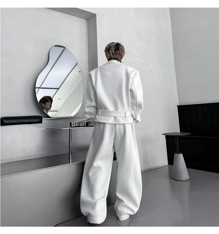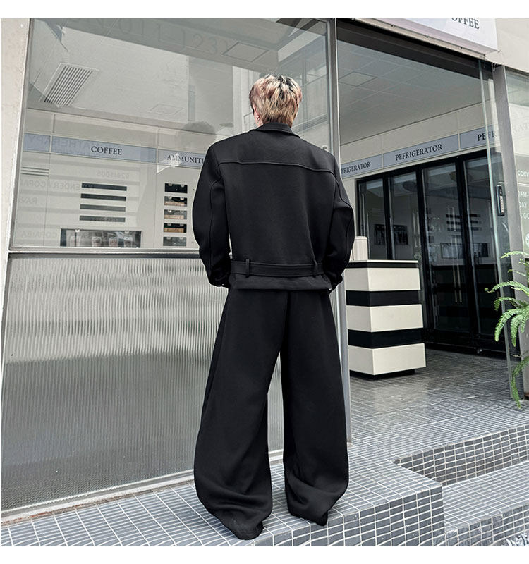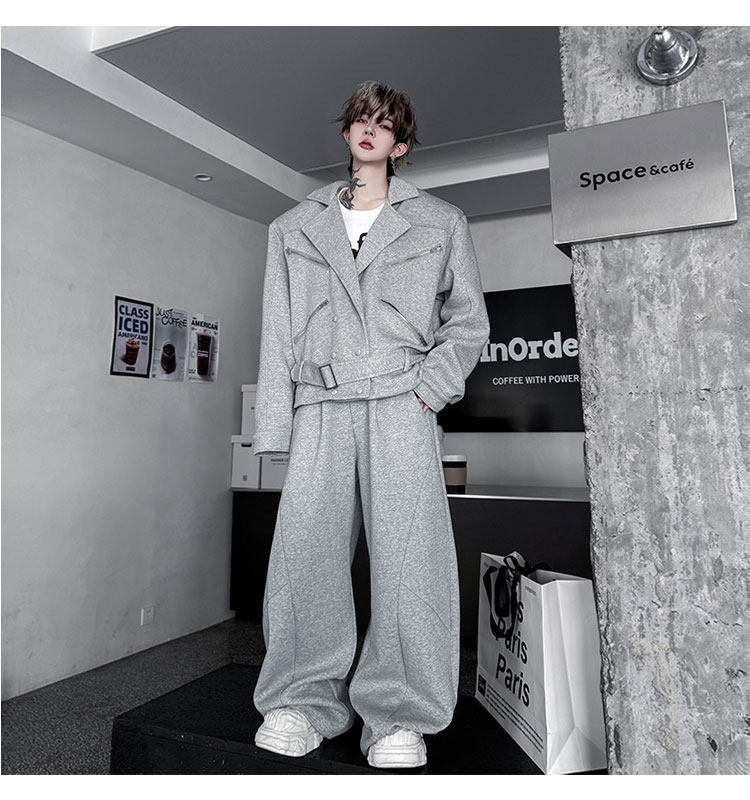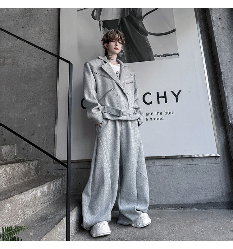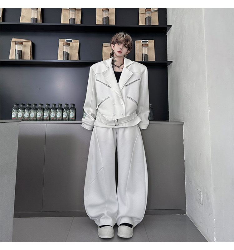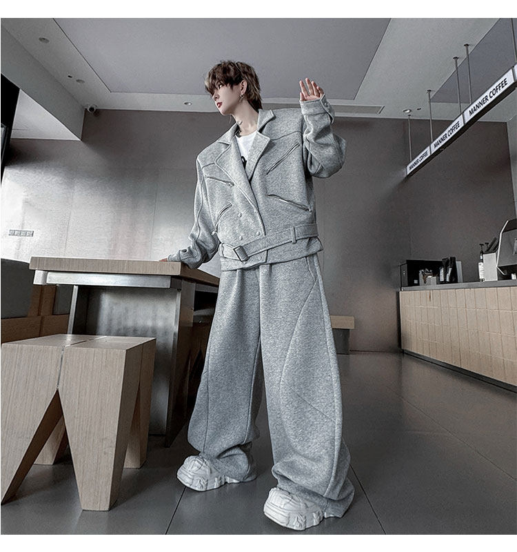 Autumn Outfit with a Unique Zipper Design, Deconstructed Belt, Lapel Jacket, Shoulder Pads, Men's Two-Piece Set with Scimitar-Style Wide-Leg Pants, Trendy