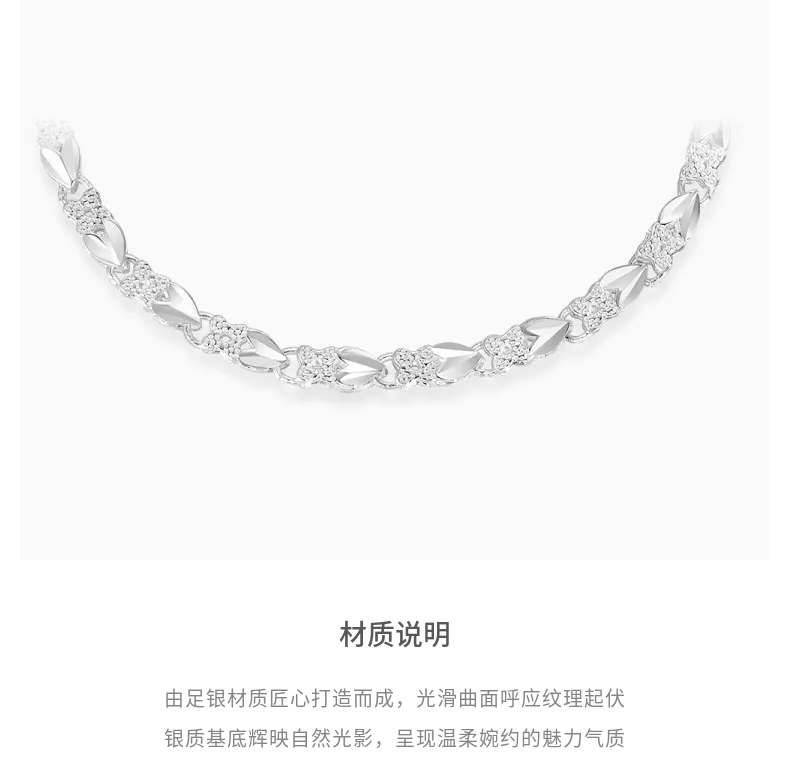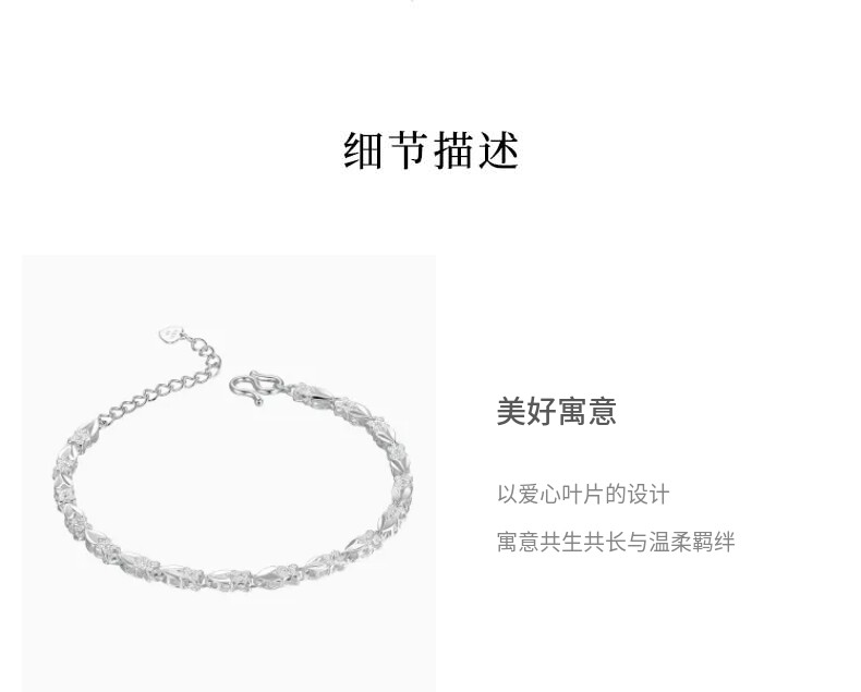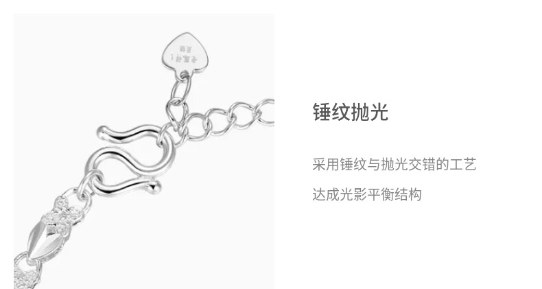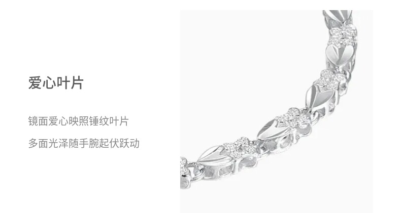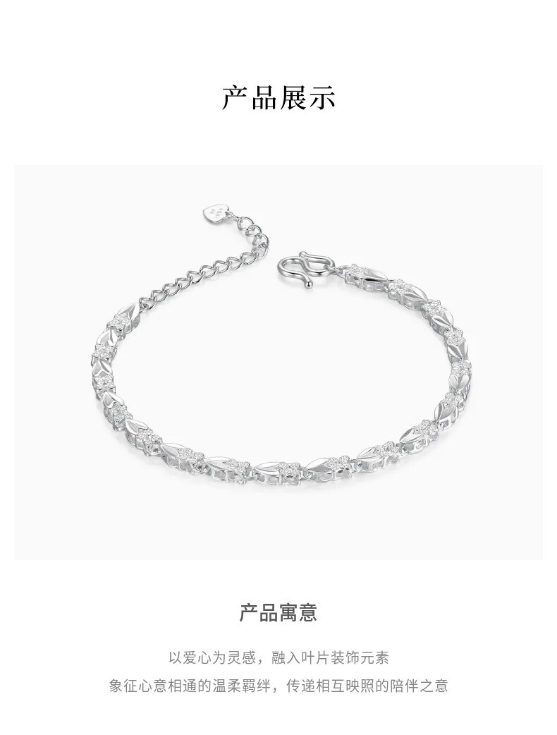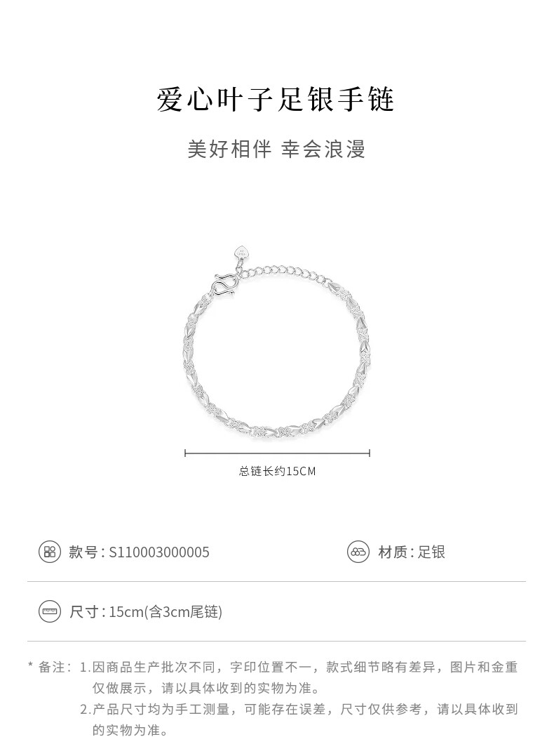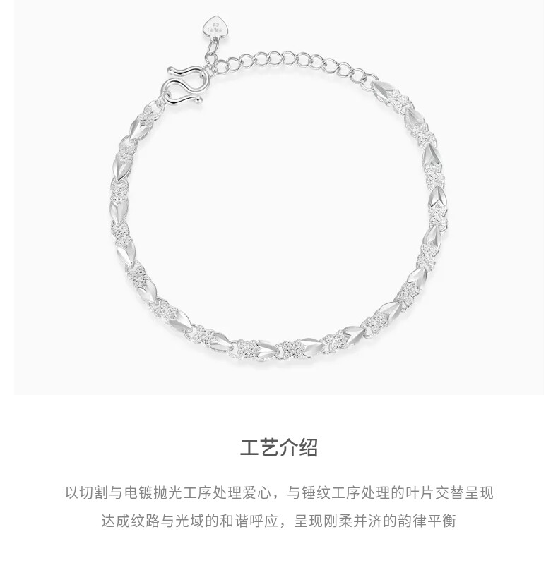 Lao Fengxiang Simple Heart Leaf Plain Silver Bracelet for Women, 38cm, Women's Day Gift