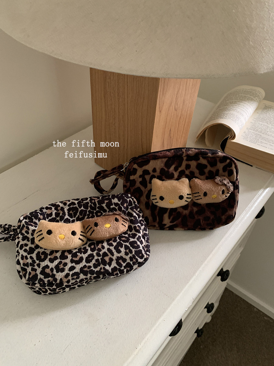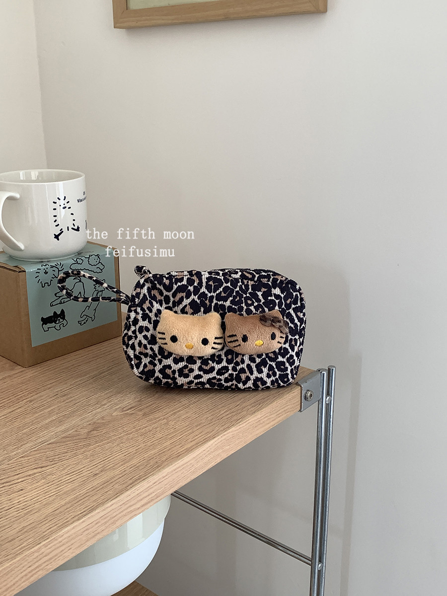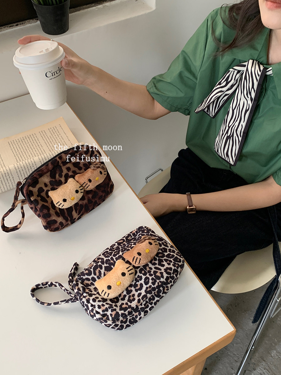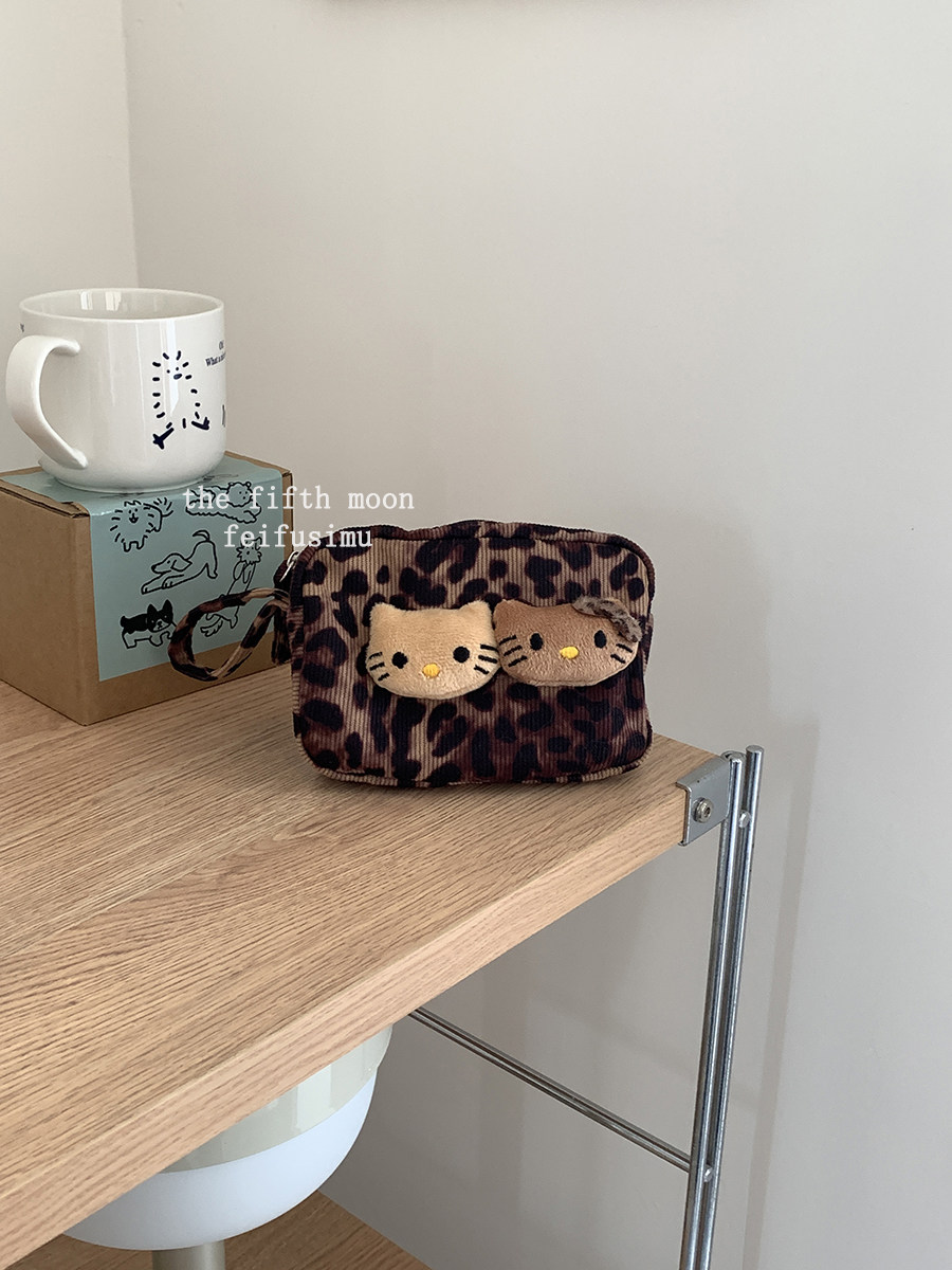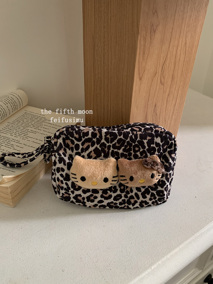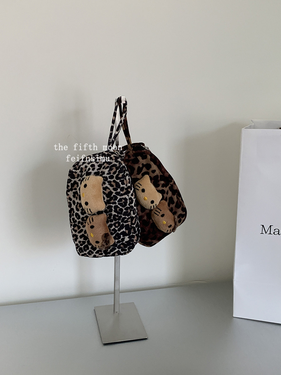 Thefifthmoon Cute Plush Cat Corduroy Leopard Print Storage Bag Cosmetic Bag Handbag
