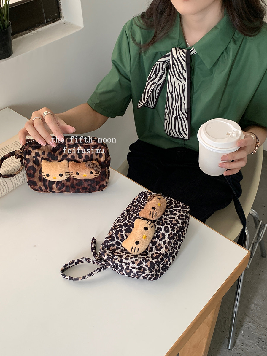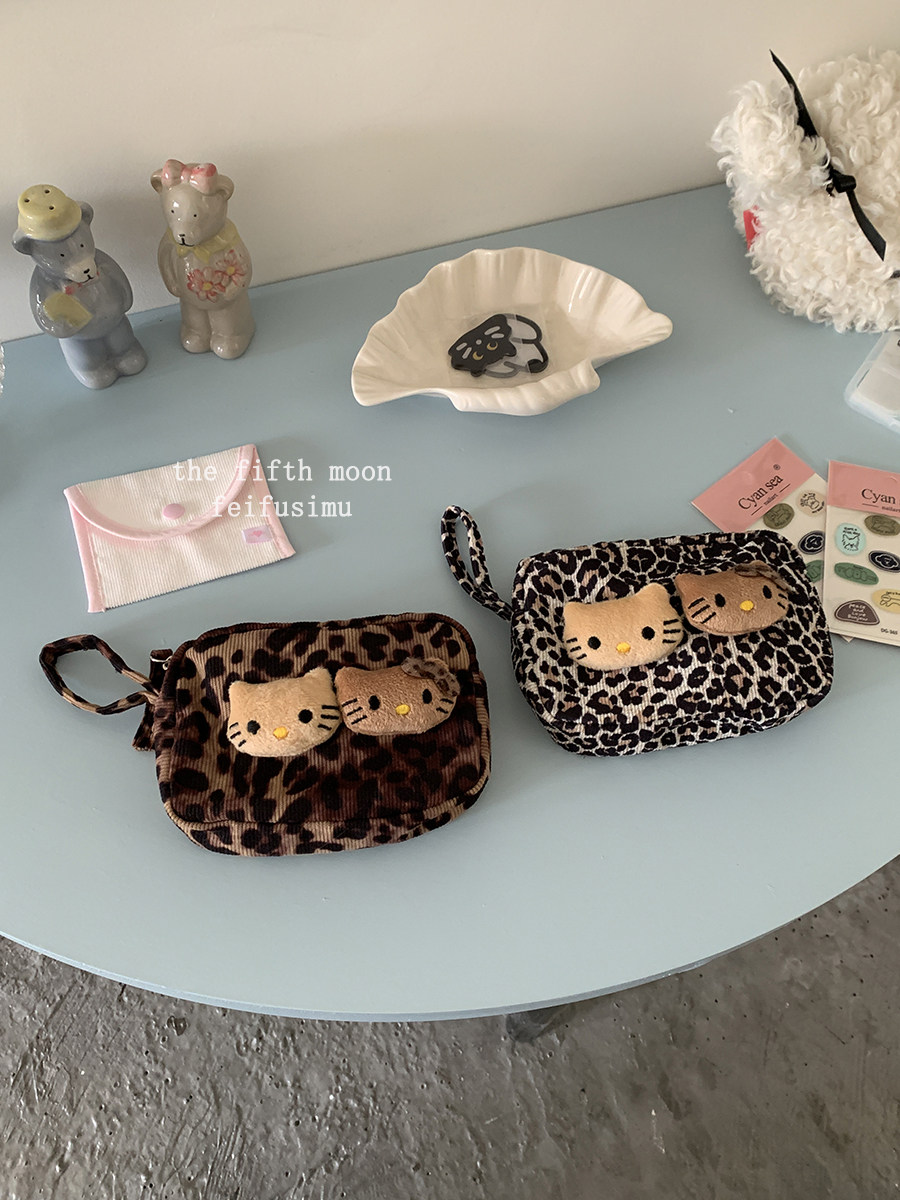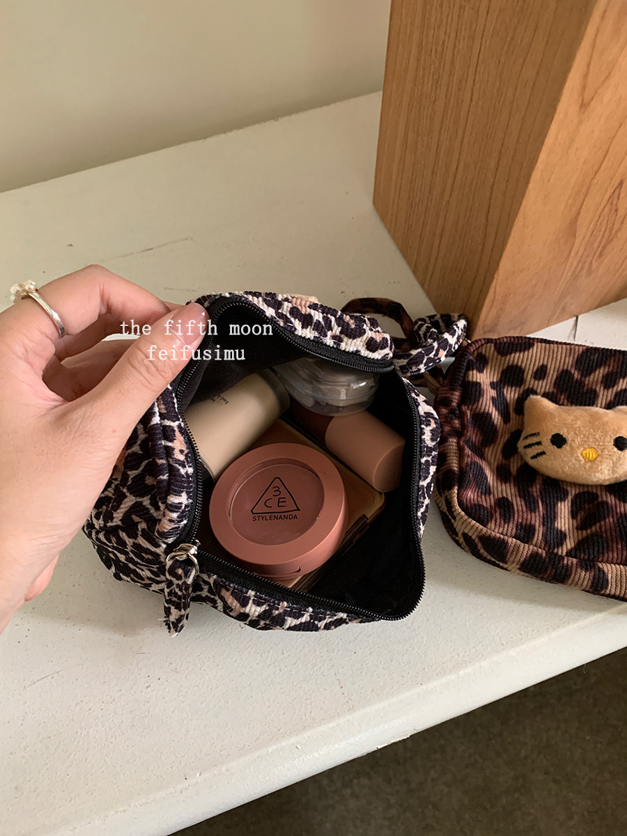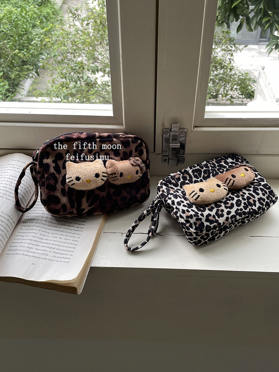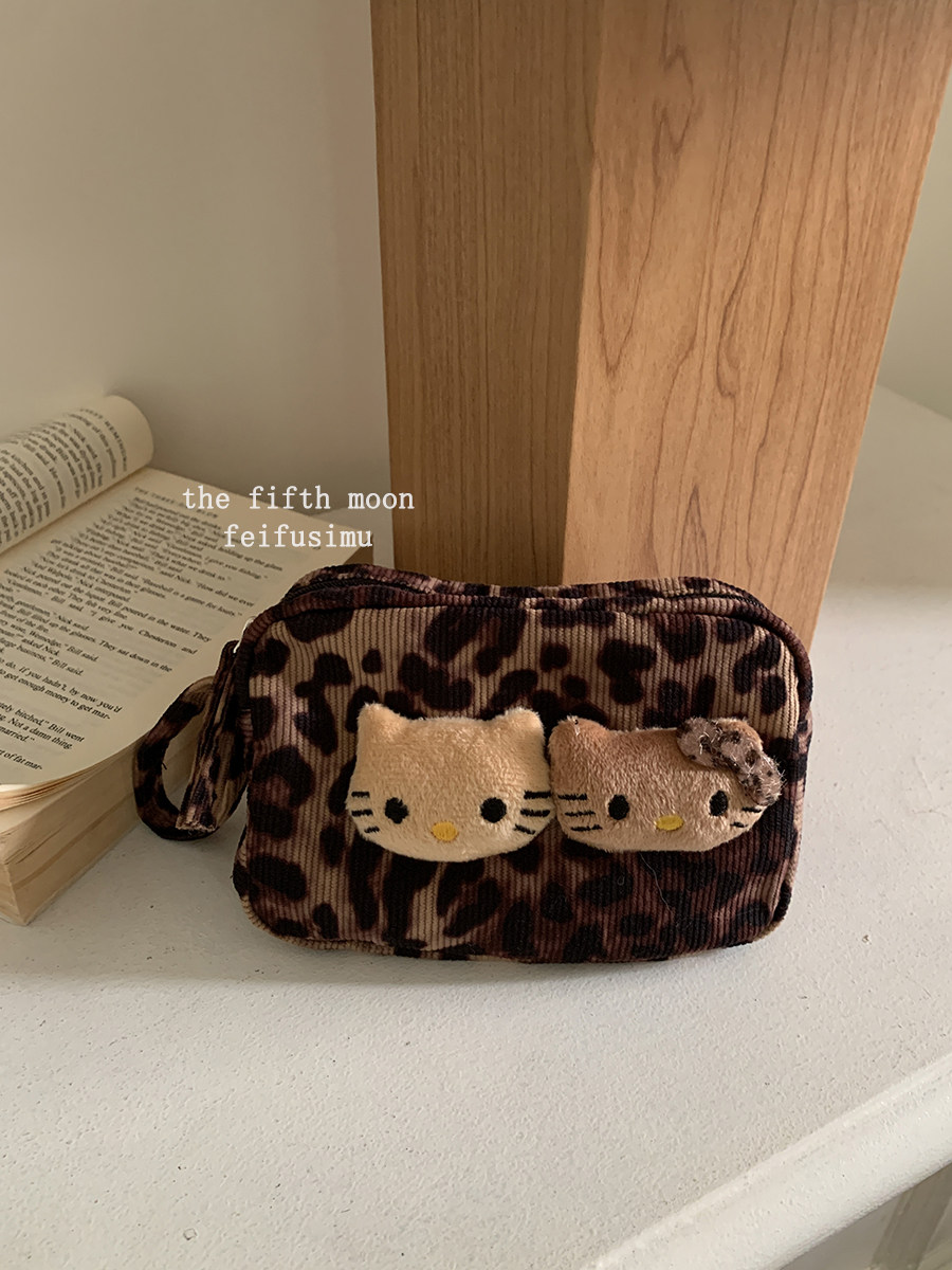 Thefifthmoon Cute Plush Cat Corduroy Leopard Print Storage Bag Cosmetic Bag Handbag