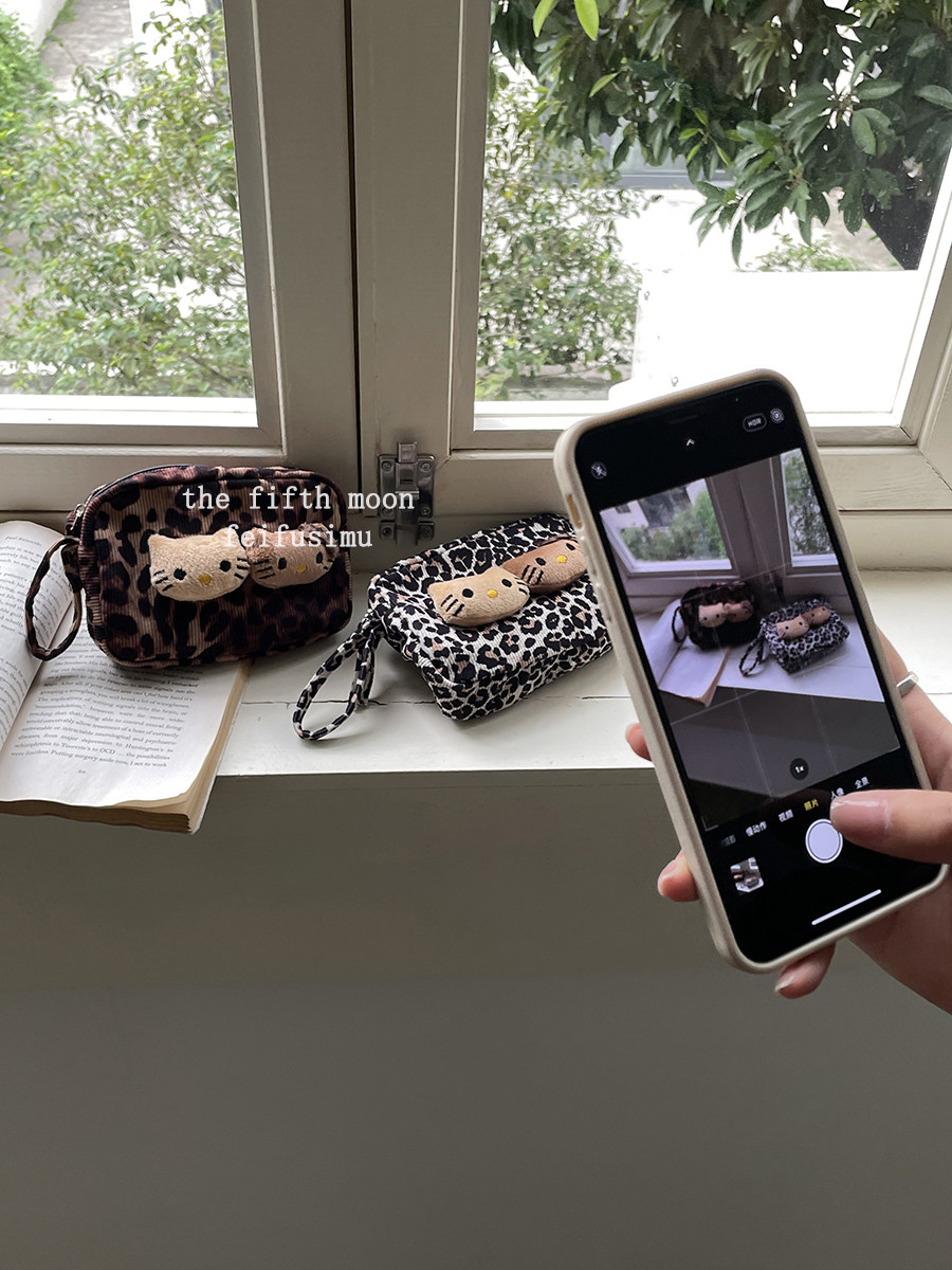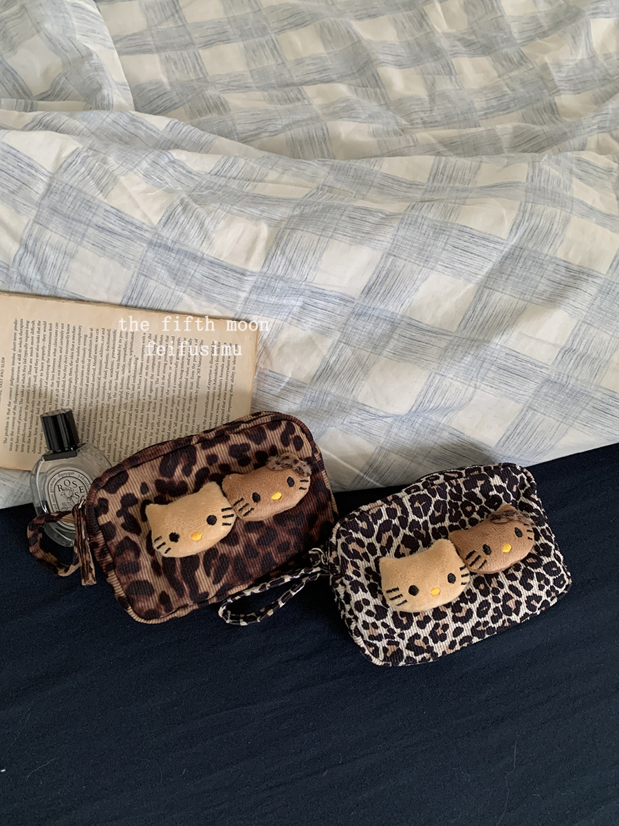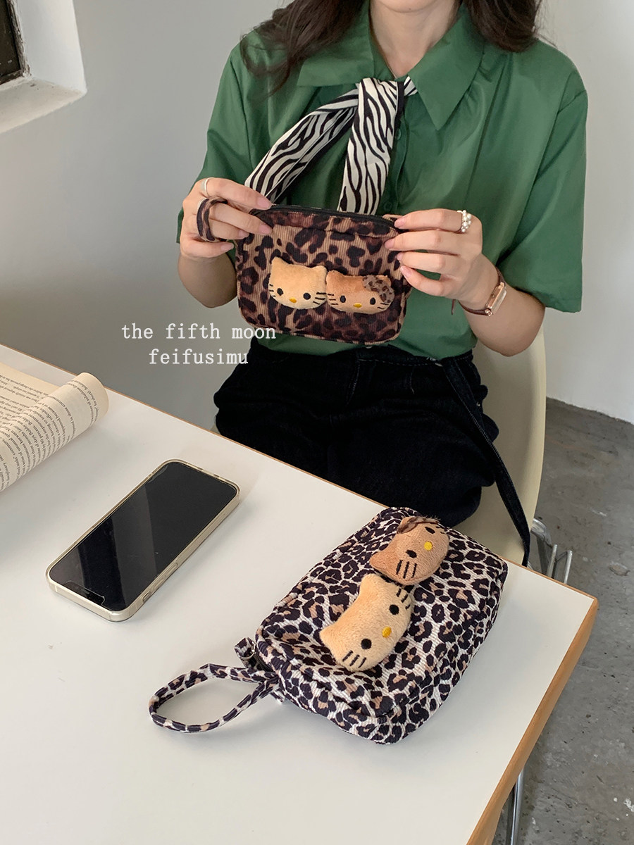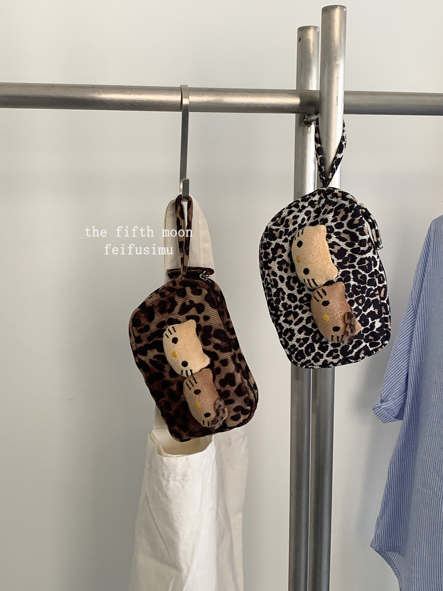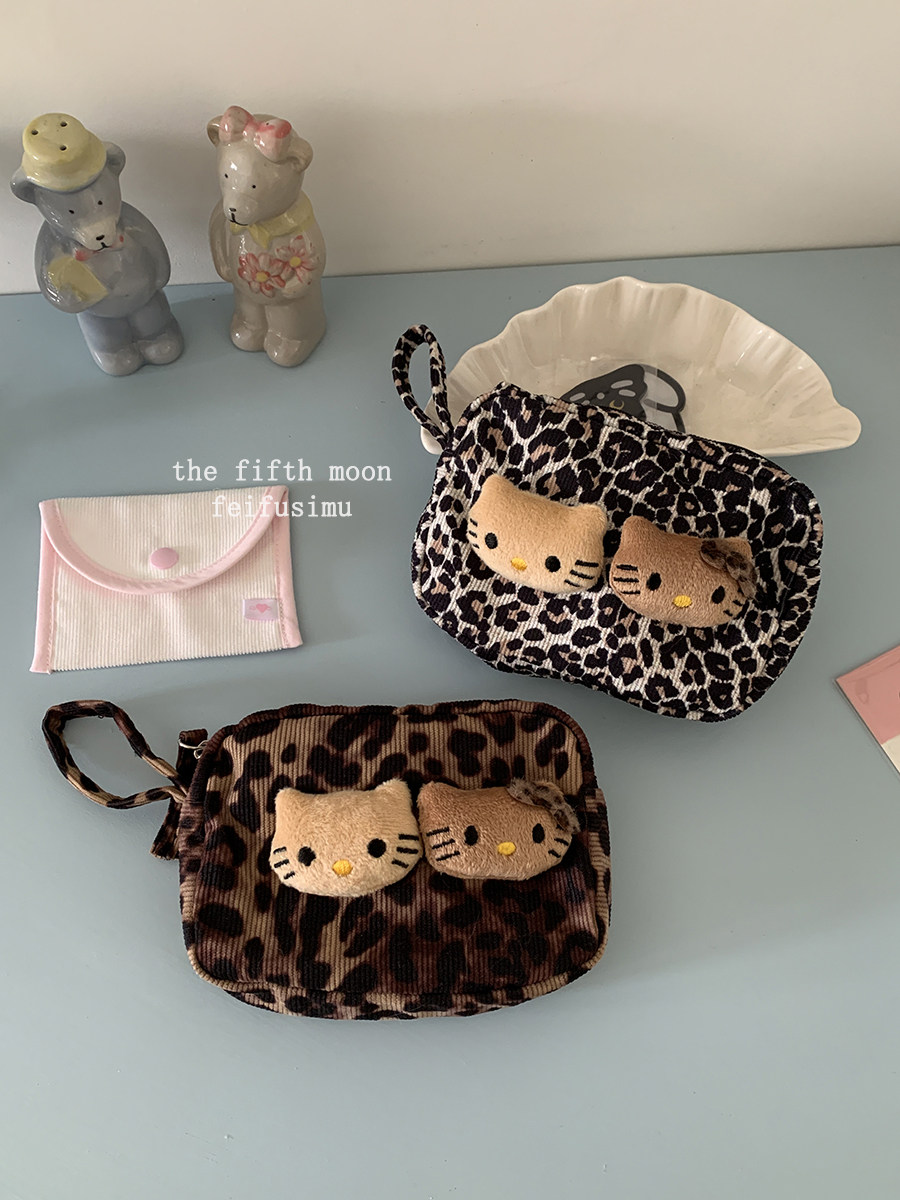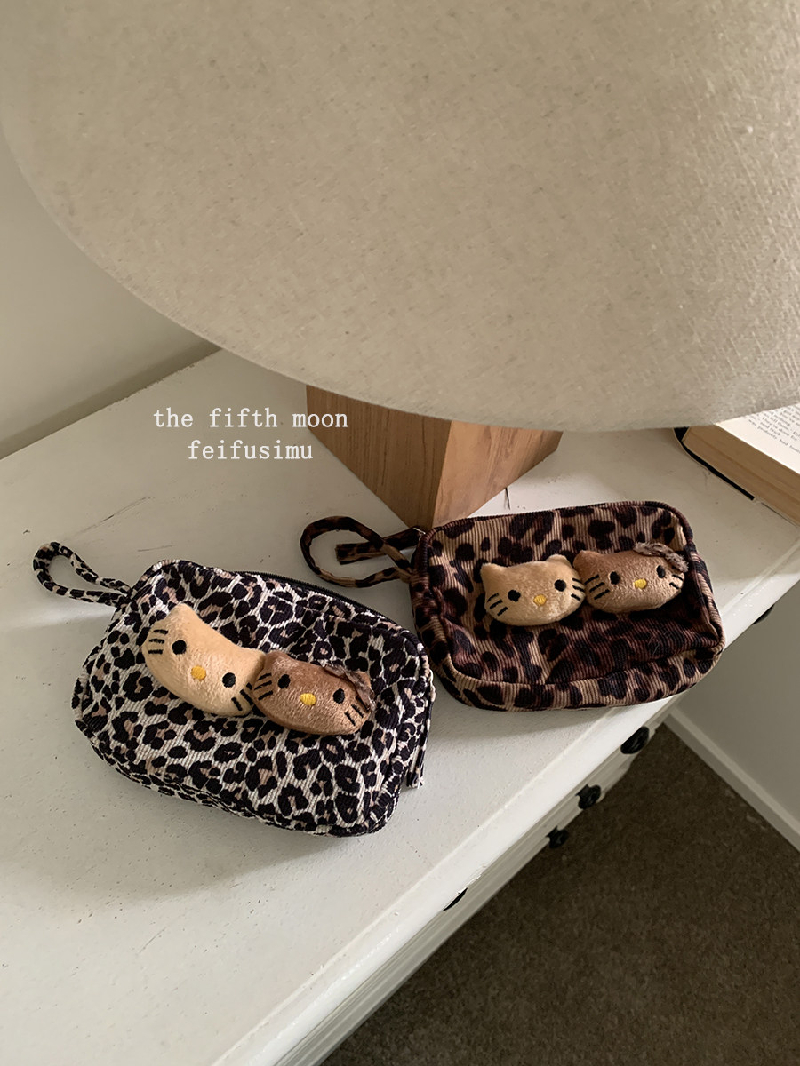 Thefifthmoon Cute Plush Cat Corduroy Leopard Print Storage Bag Cosmetic Bag Handbag