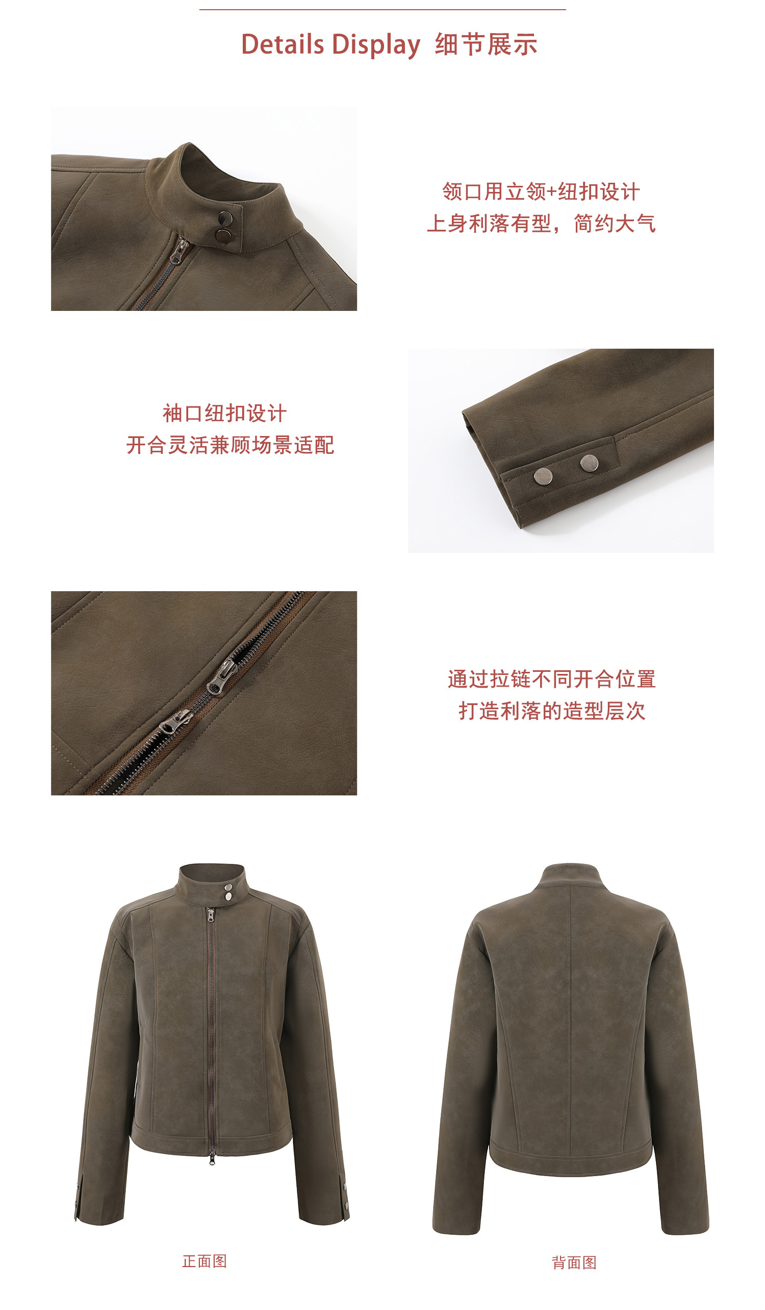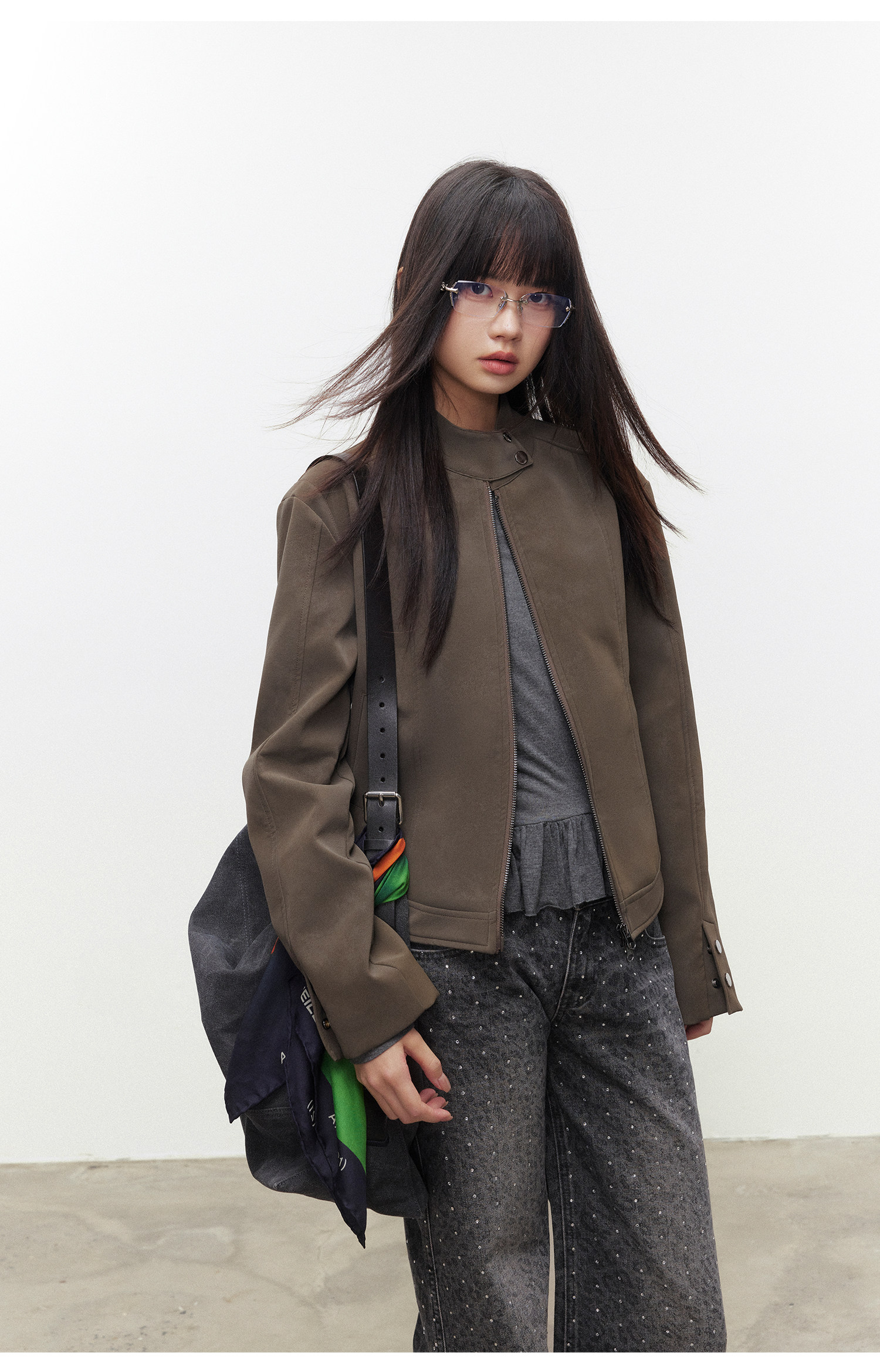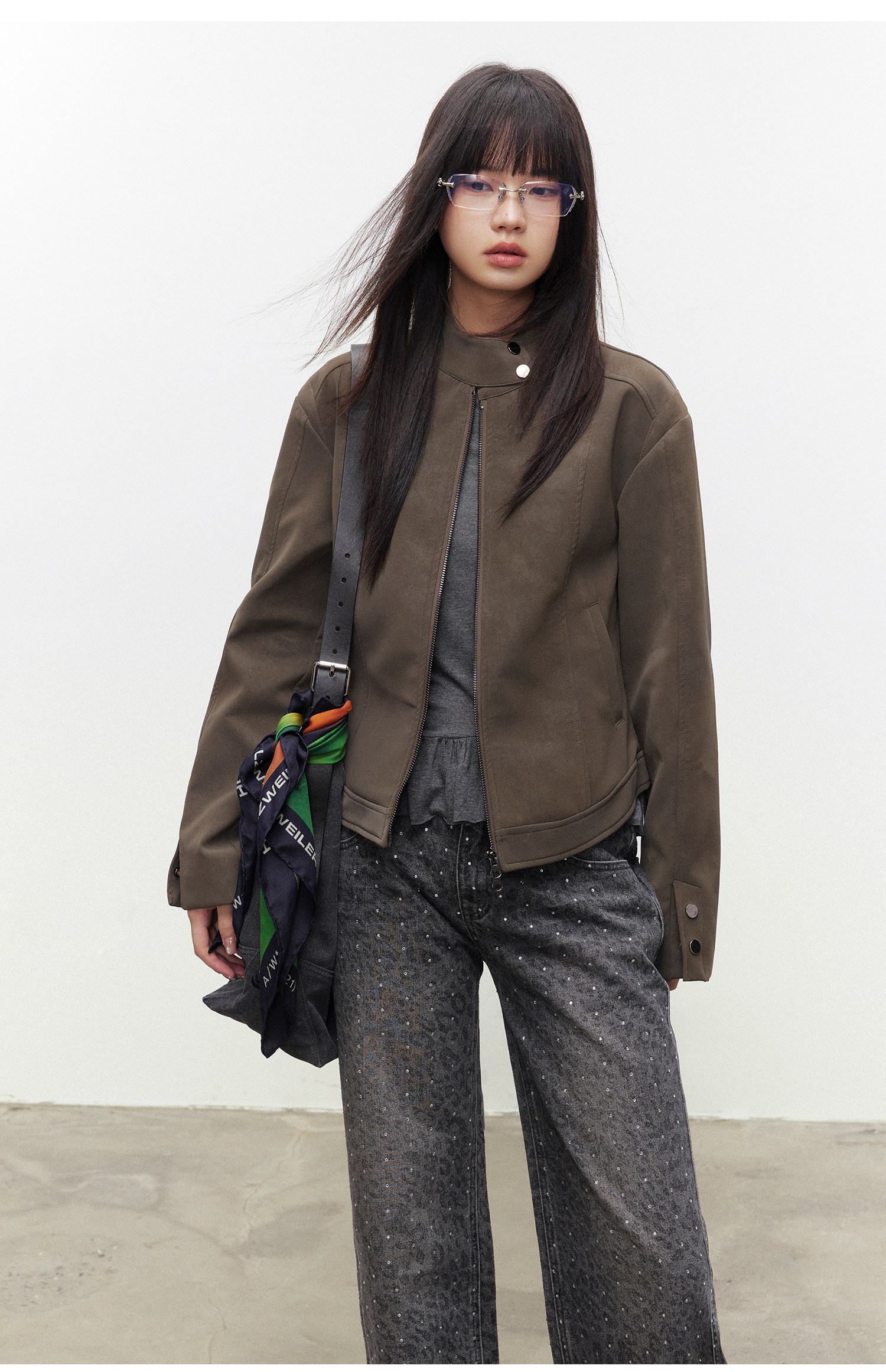 Aunp Retro Gray-Green-Brown Stand-Up Collar Slim-Fit Leather Jacket for Women 2025 Autumn Slimming Versatile Short Leather Jacket