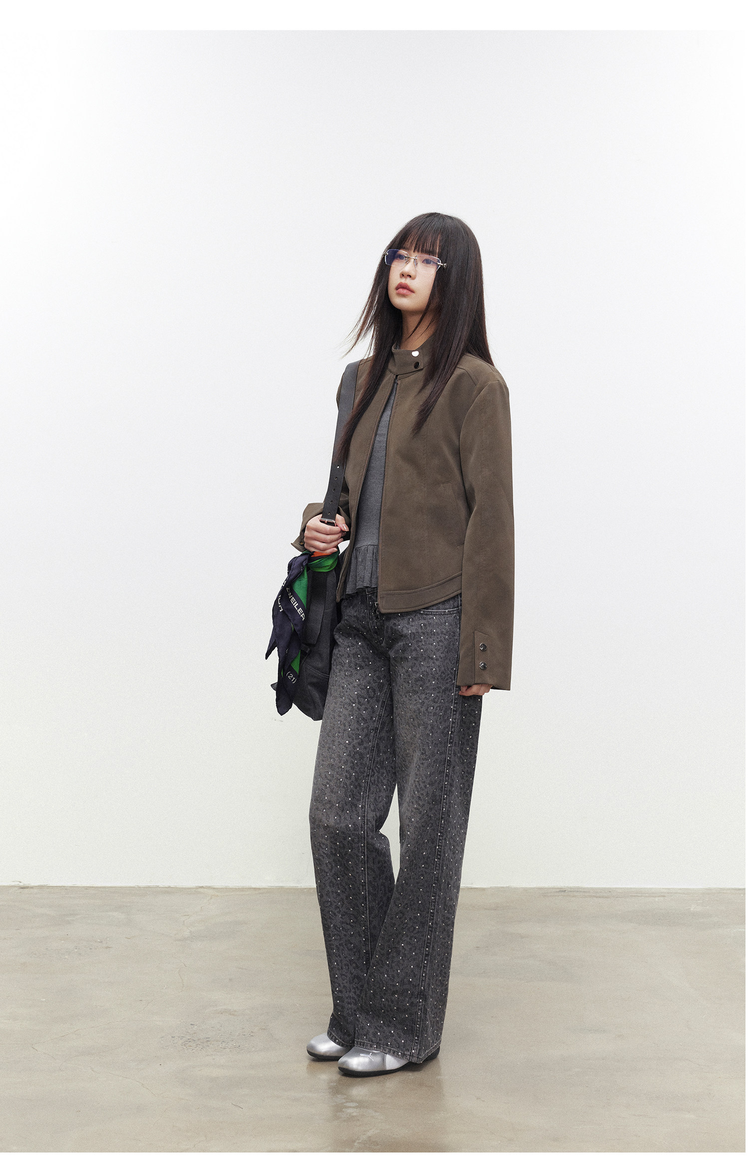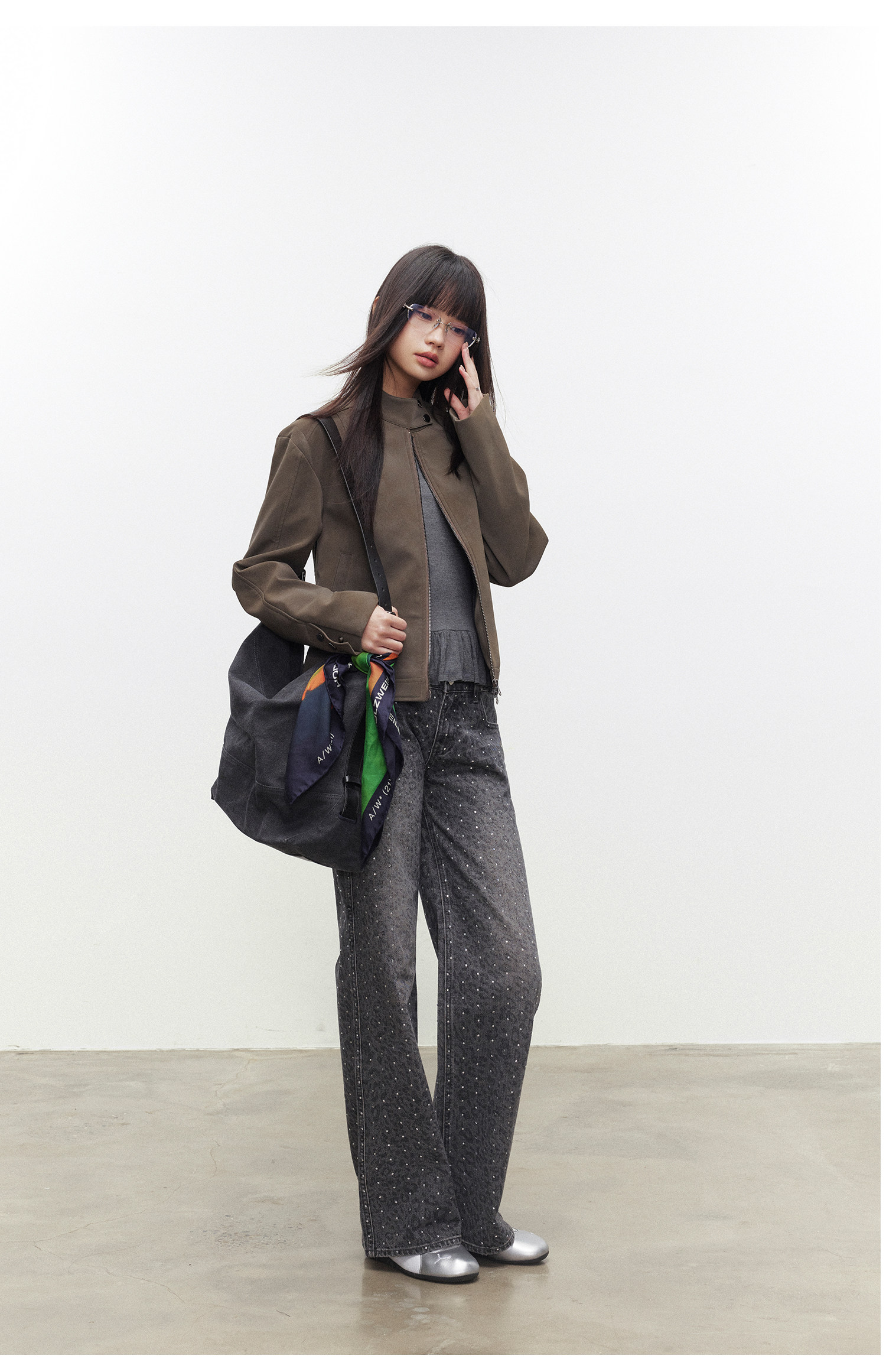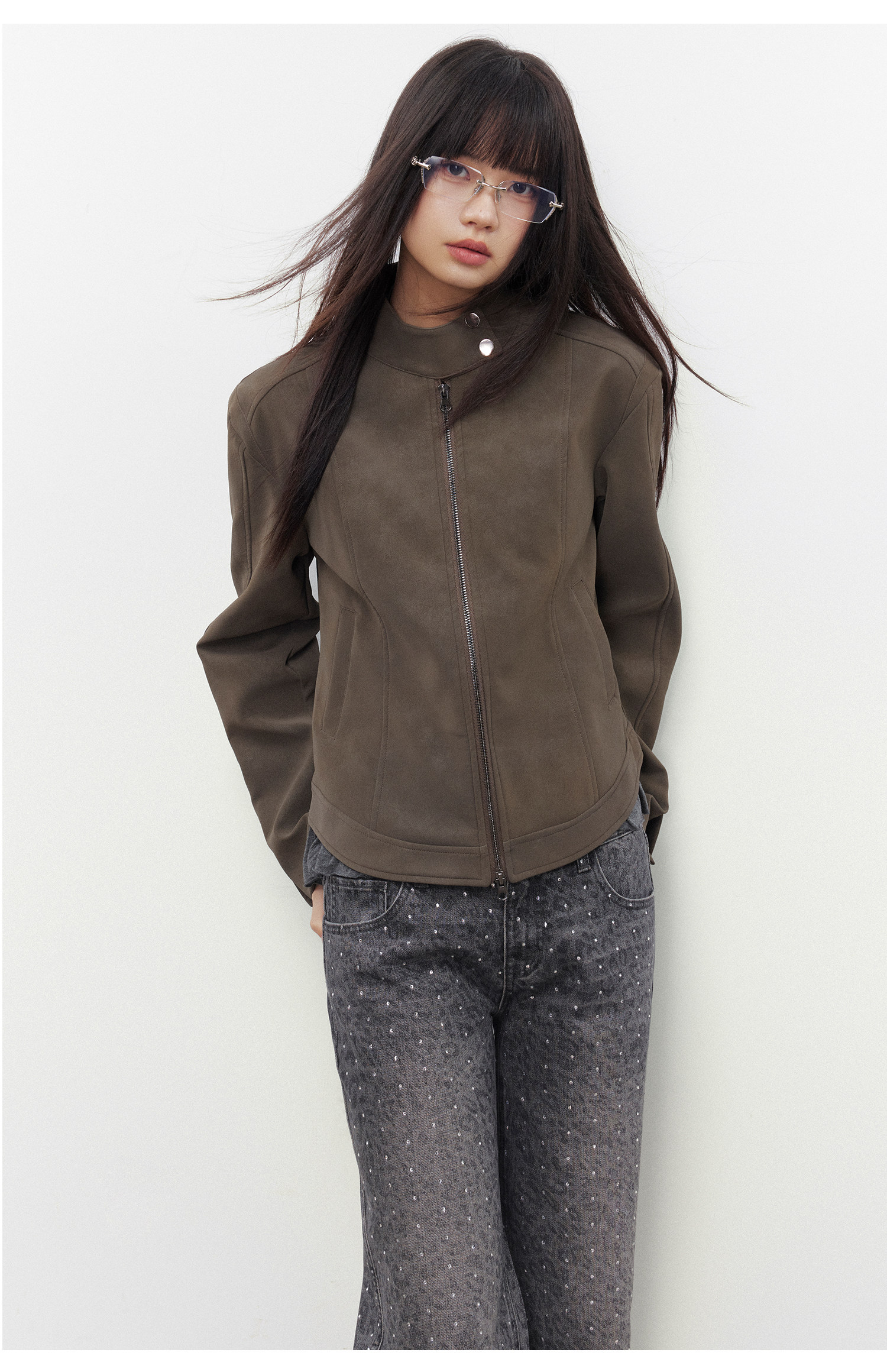 Aunp Retro Gray-Green-Brown Stand-Up Collar Slim-Fit Leather Jacket for Women 2025 Autumn Slimming Versatile Short Leather Jacket