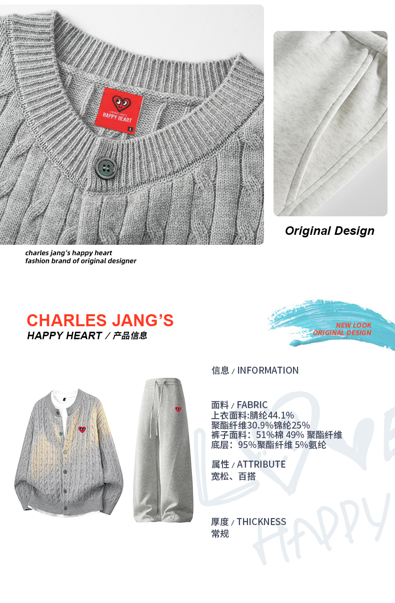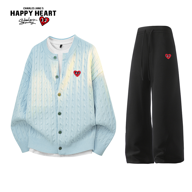 Charles Peach Heart Solid Color Cardigan Sweater Jacket Straight-Leg Casual Pants Two-Piece Set Spring and Autumn New Sports Suit