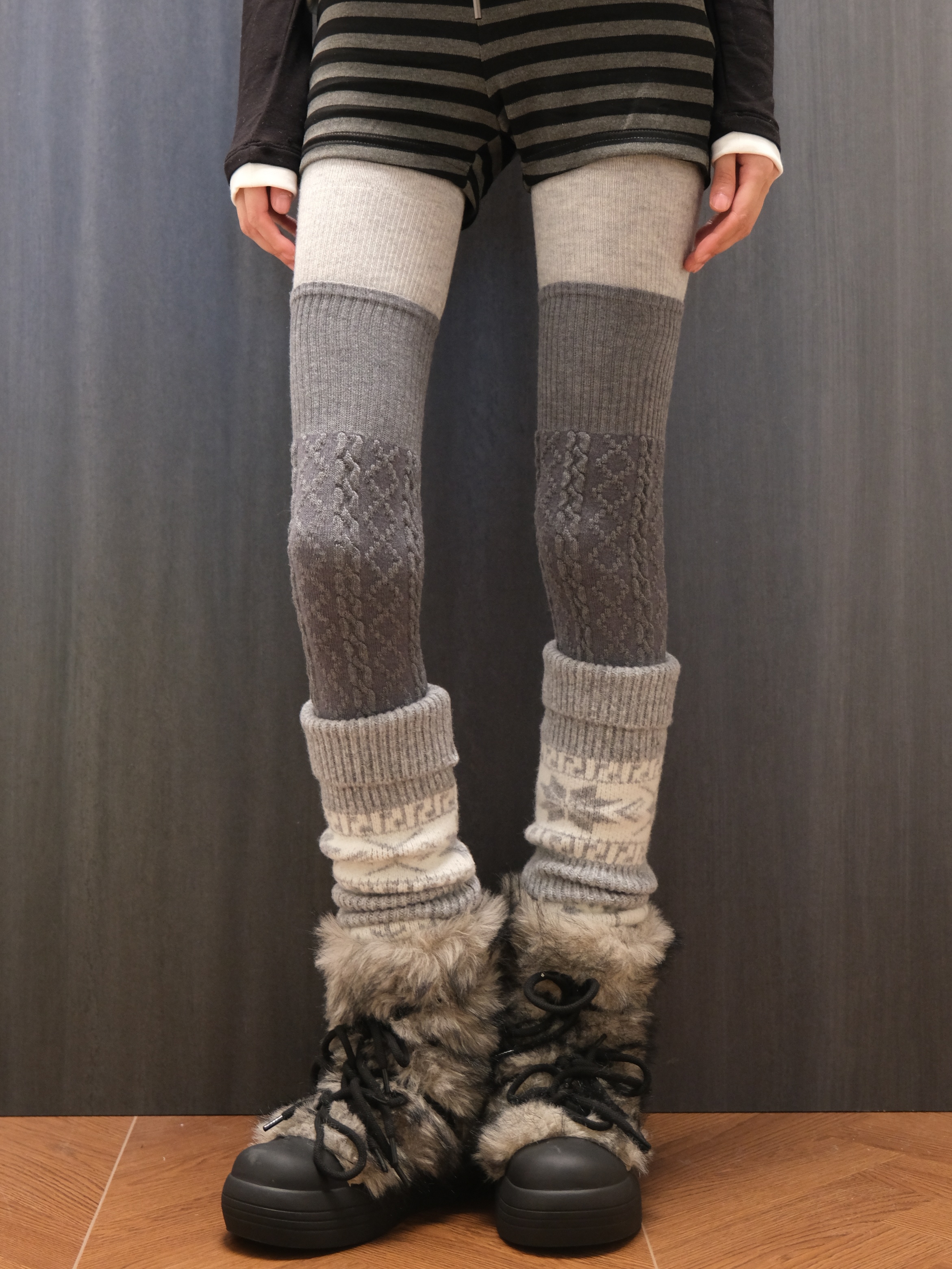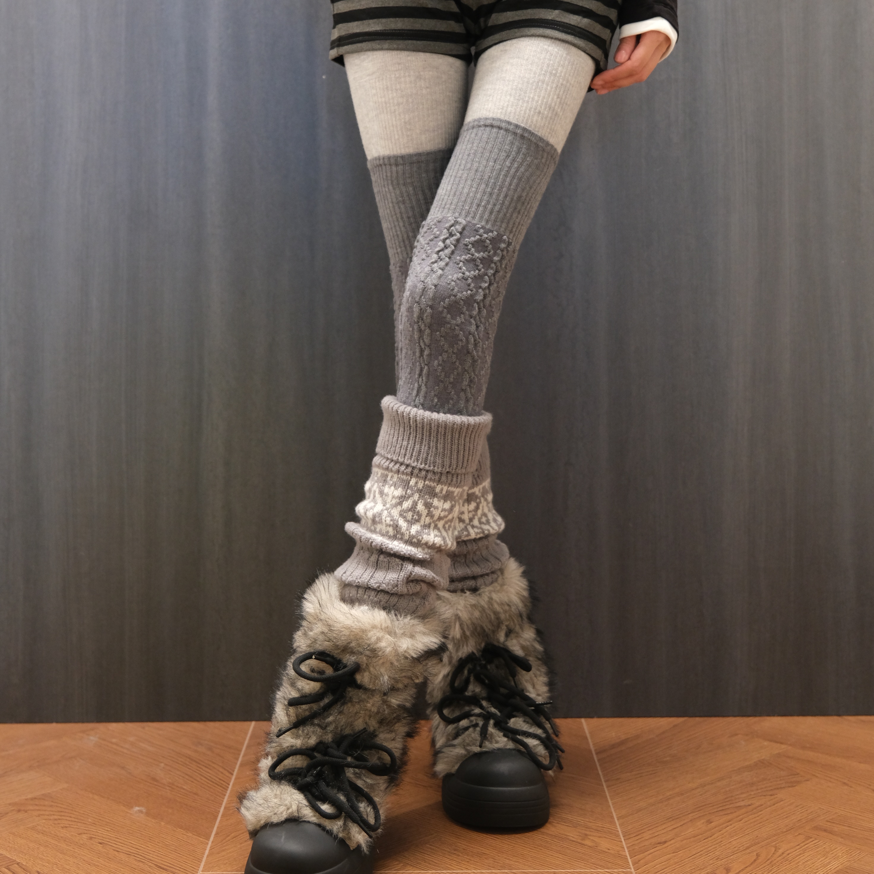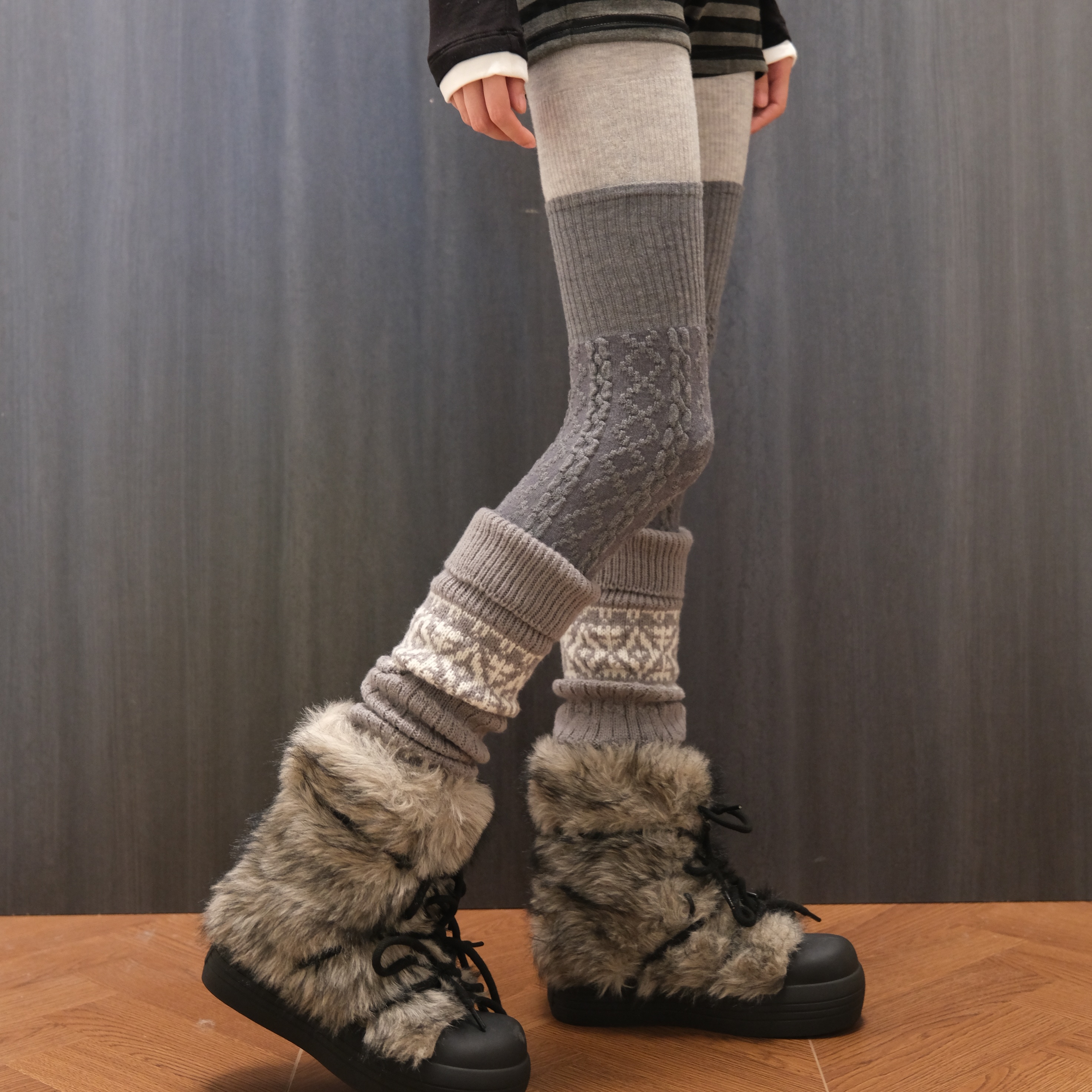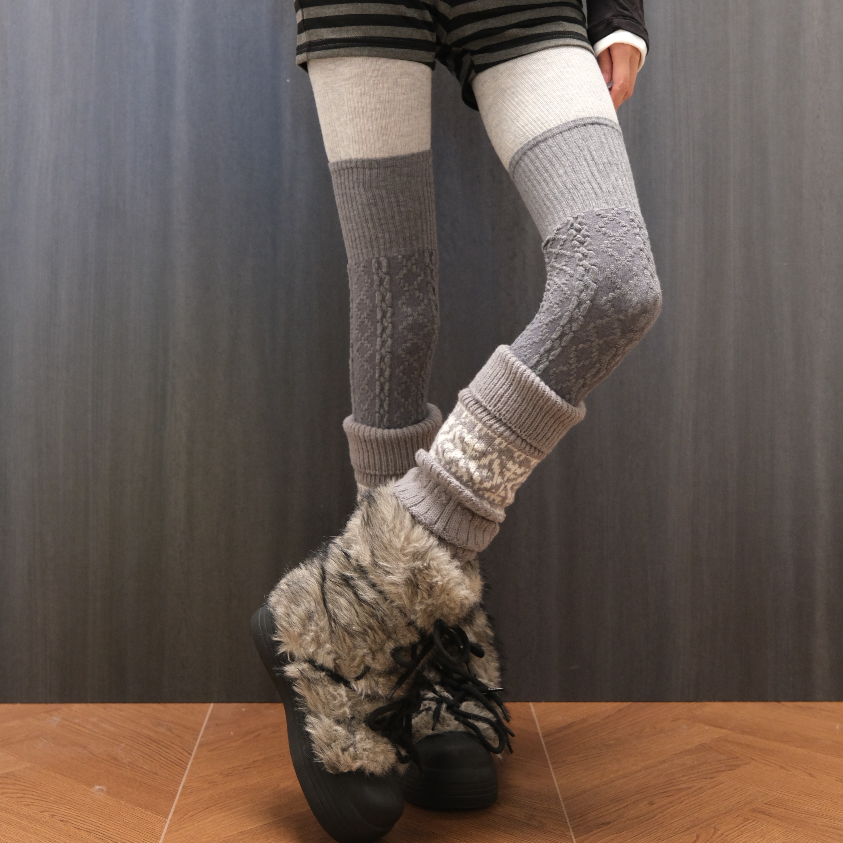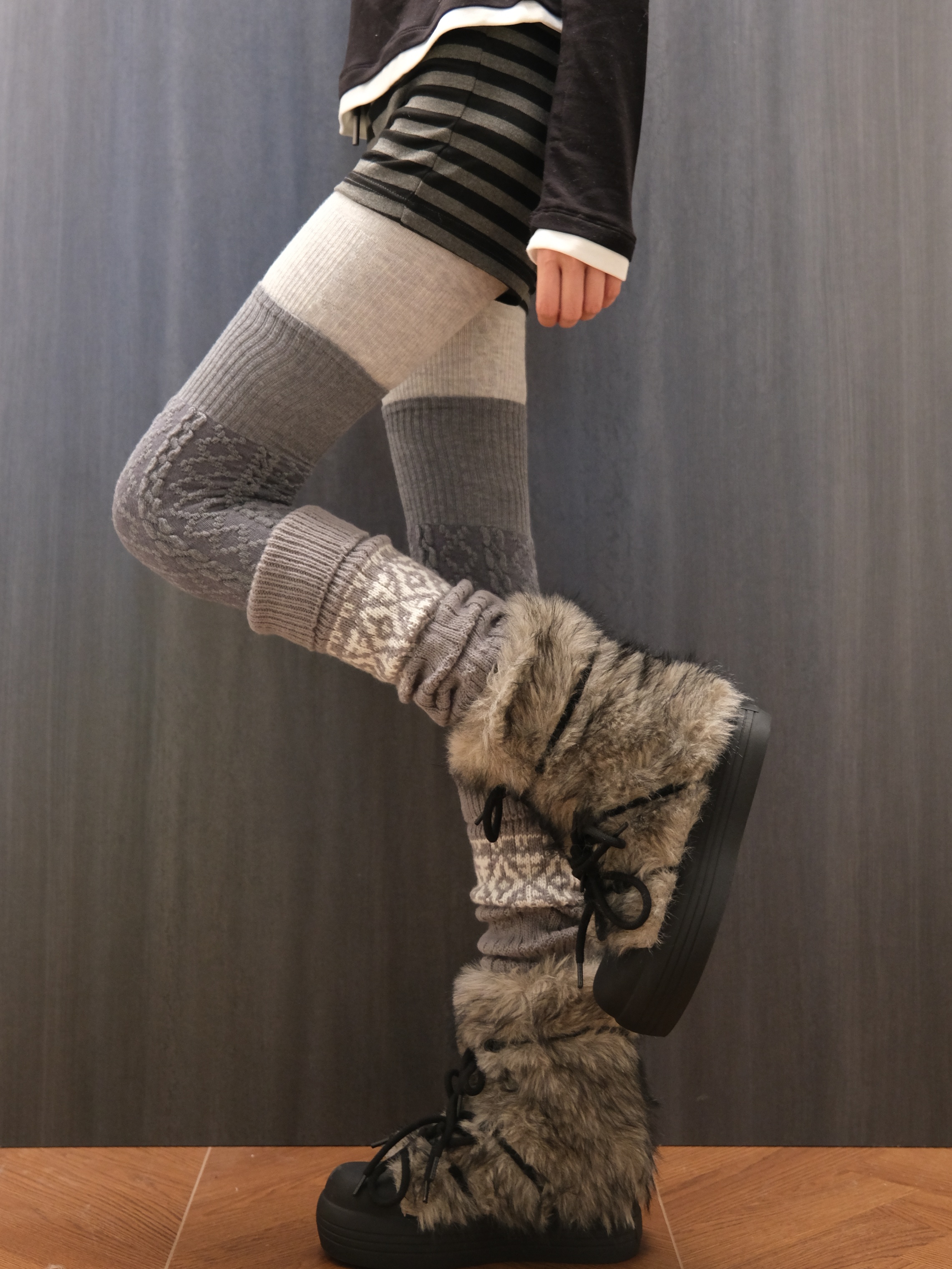 Winter in Hokkaido: Fair Isle Socks Layered over Knee-High Cable Knit Dark Gray Over-The-Knee Socks Paired with Plush Snow Boots