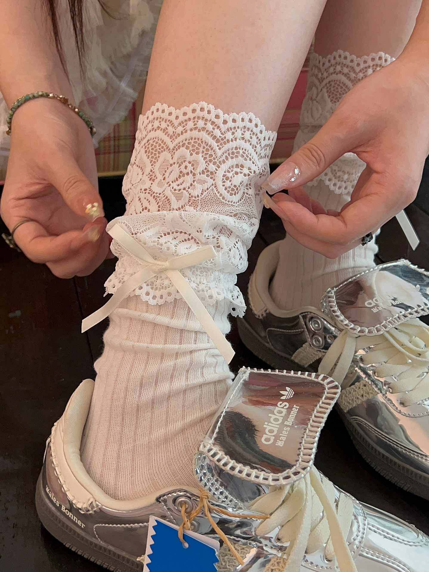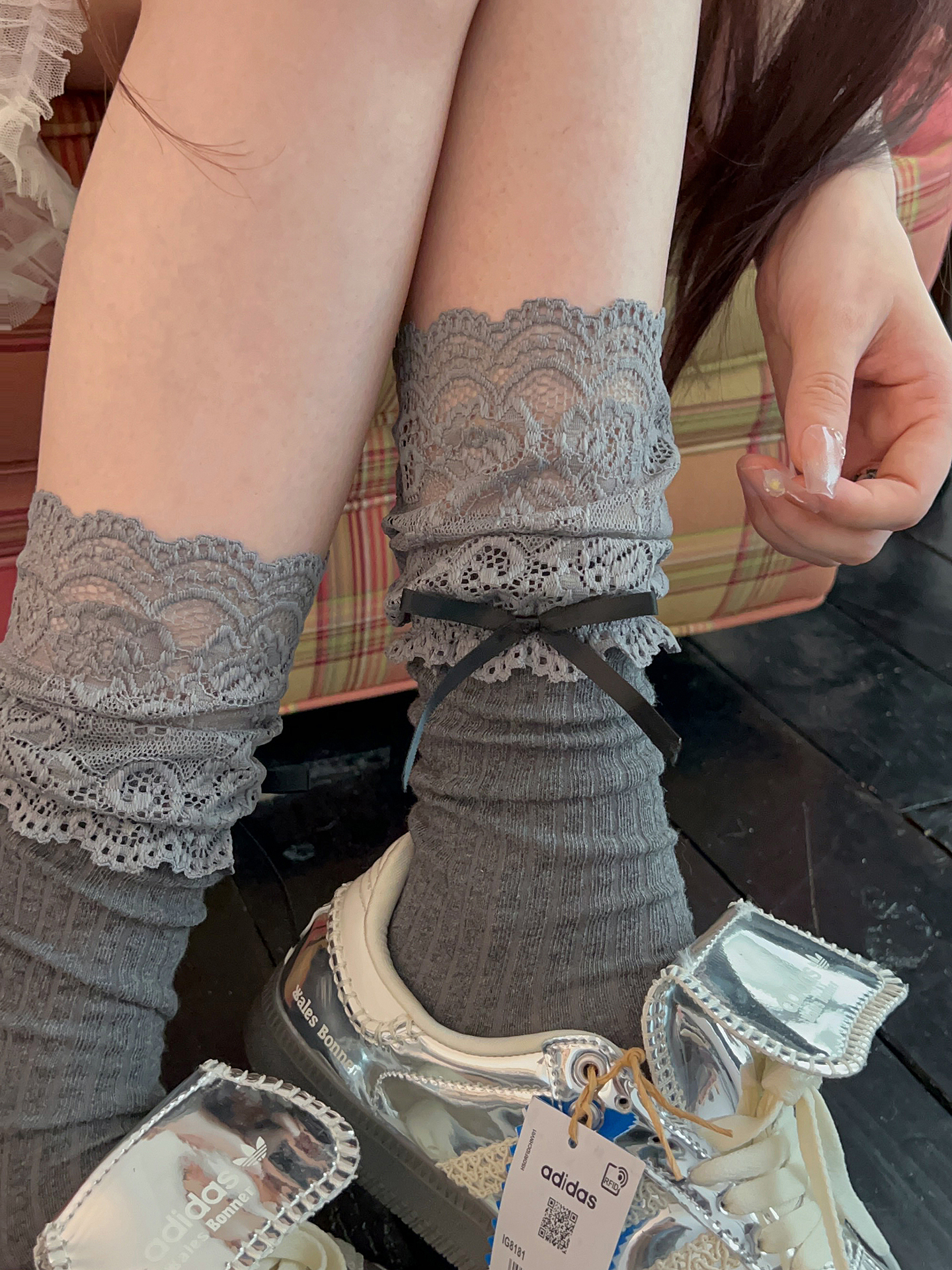 Miu Series Lace Socks Women's Mid-Calf Boot Socks Autumn Pure Cotton Gray Calf Socks to Match Long Boots