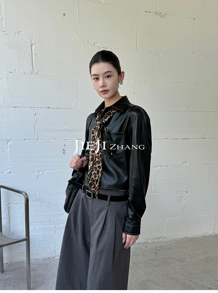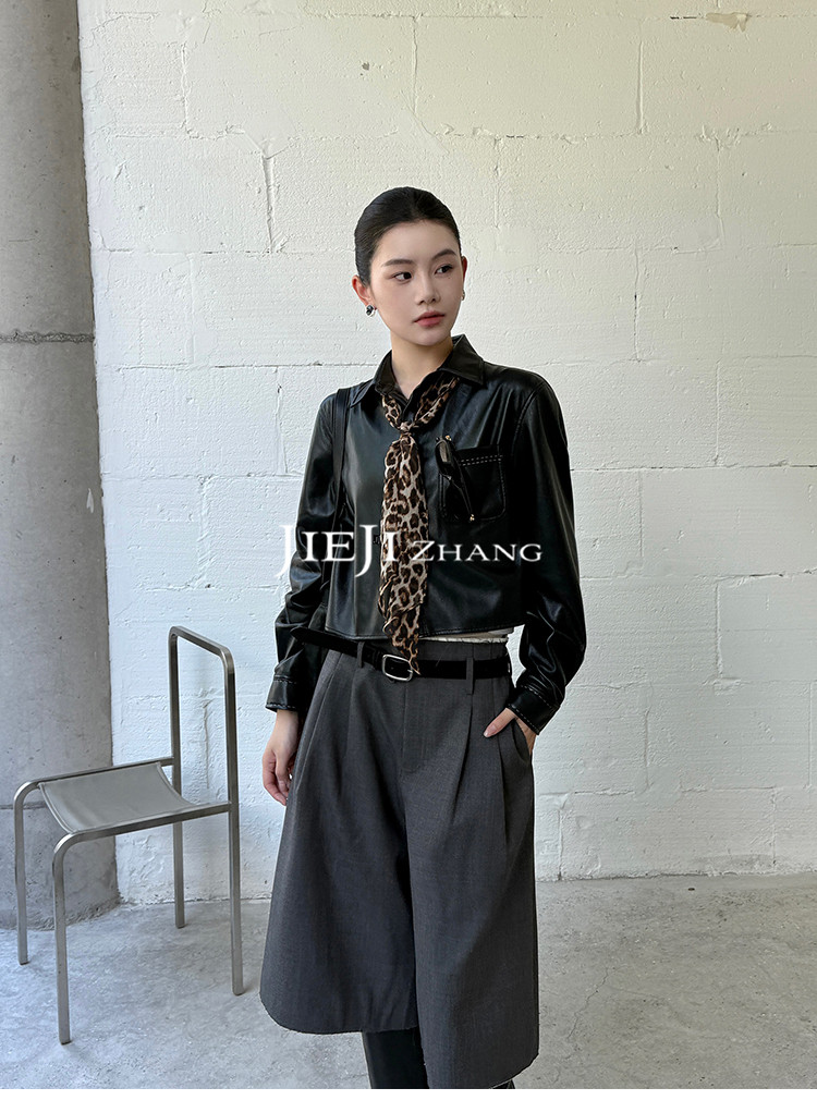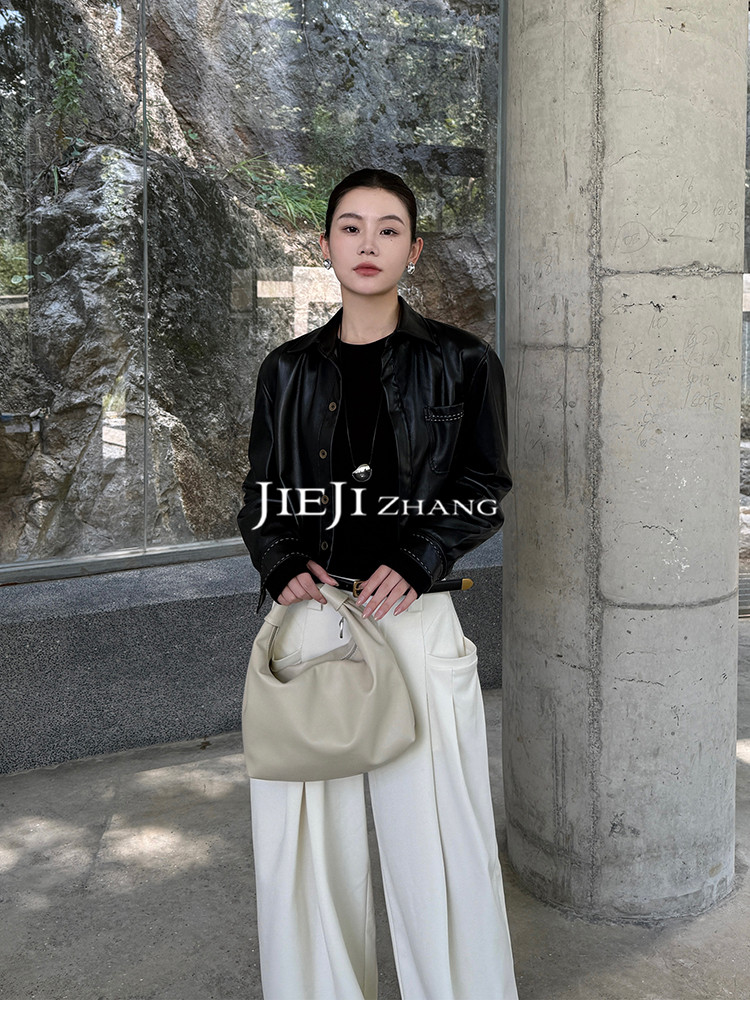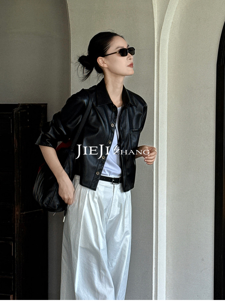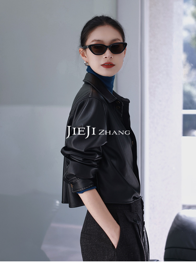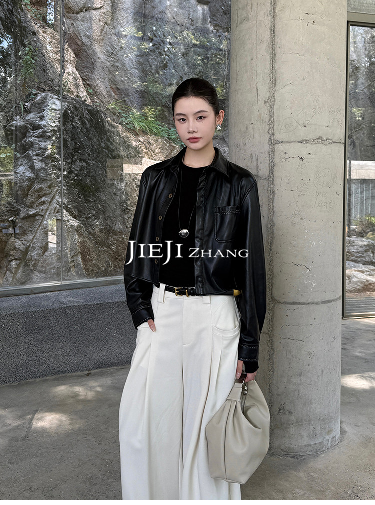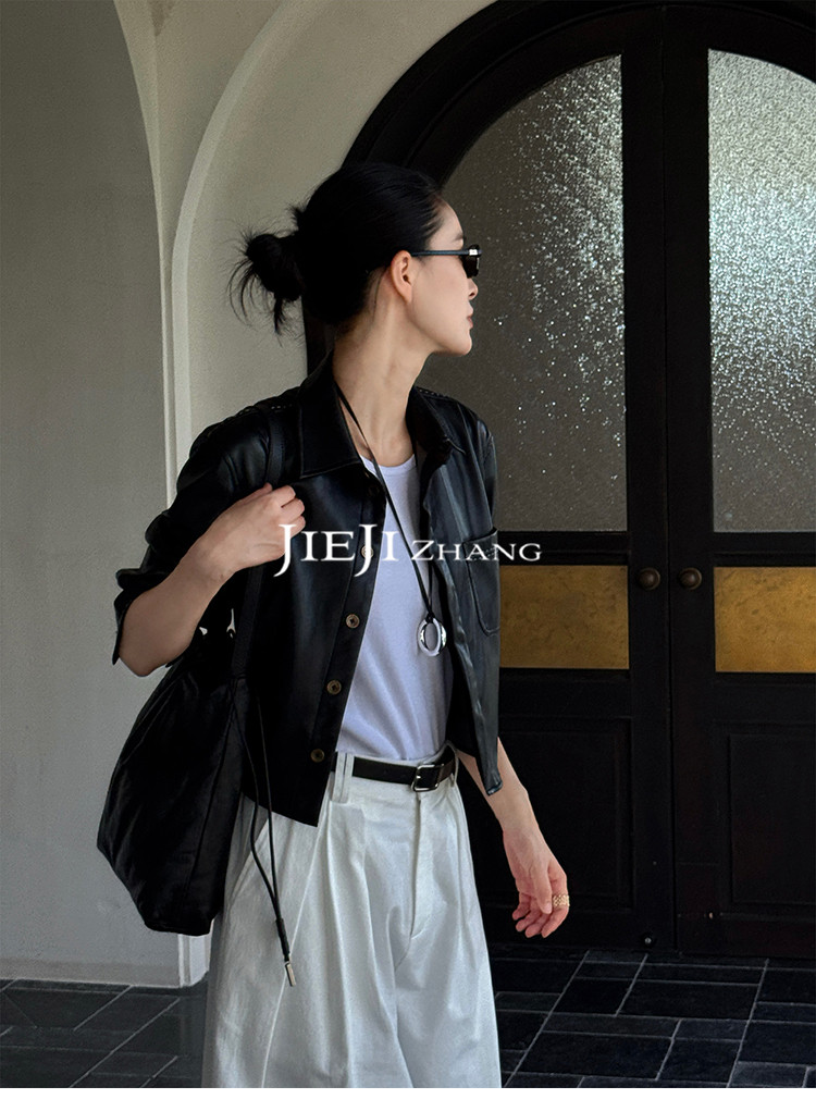 Zhang Qi Jieji Autumn Vintage Motorcycle Jacket Leather Short Coat Slim Fit Leather Shirt Top 350174