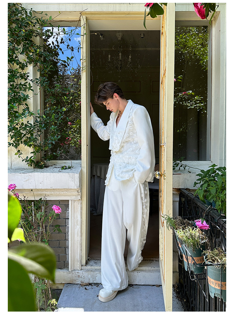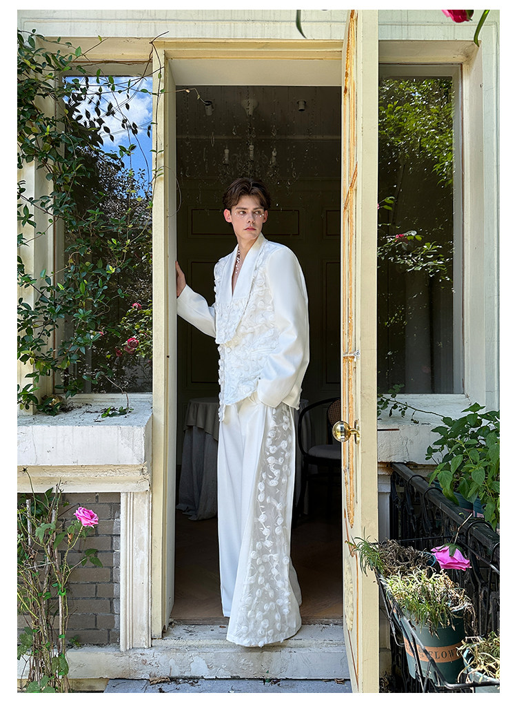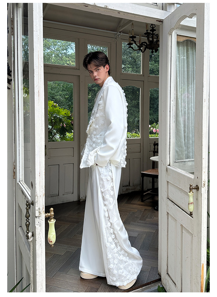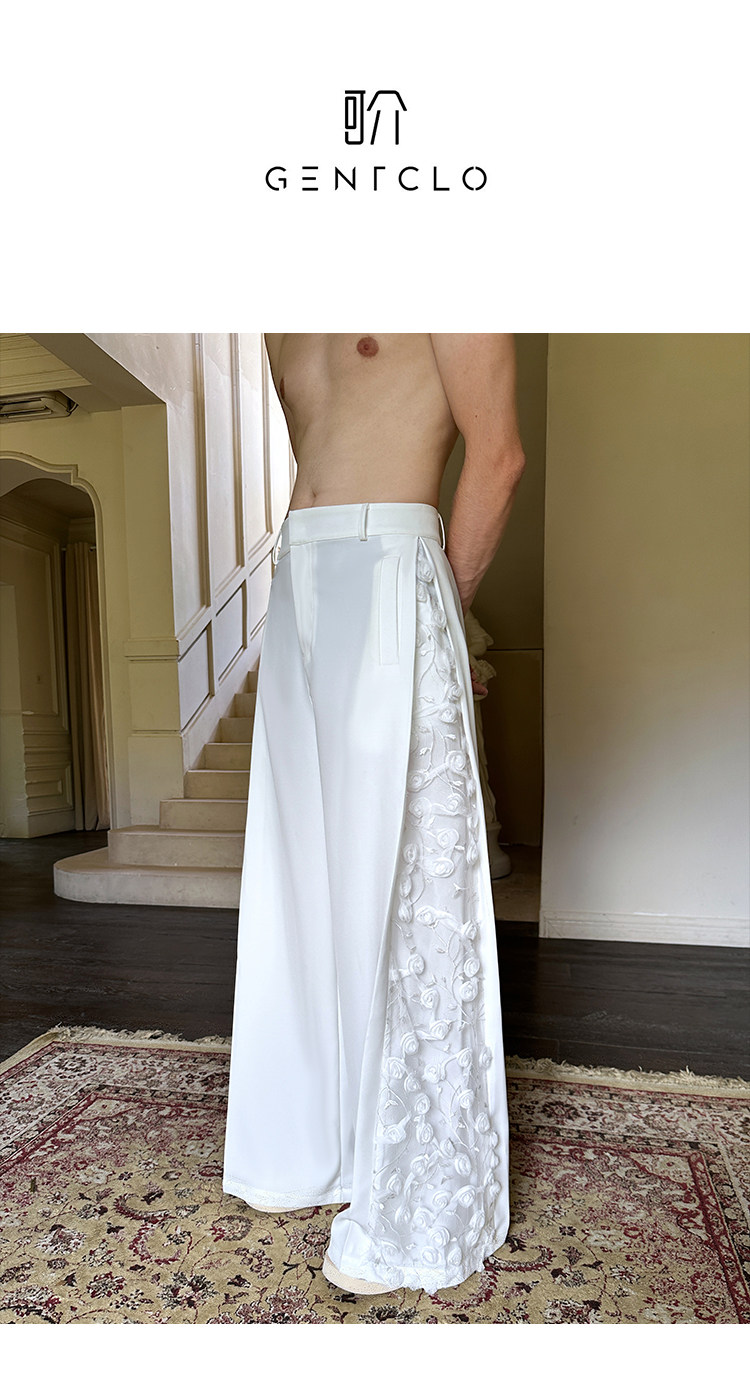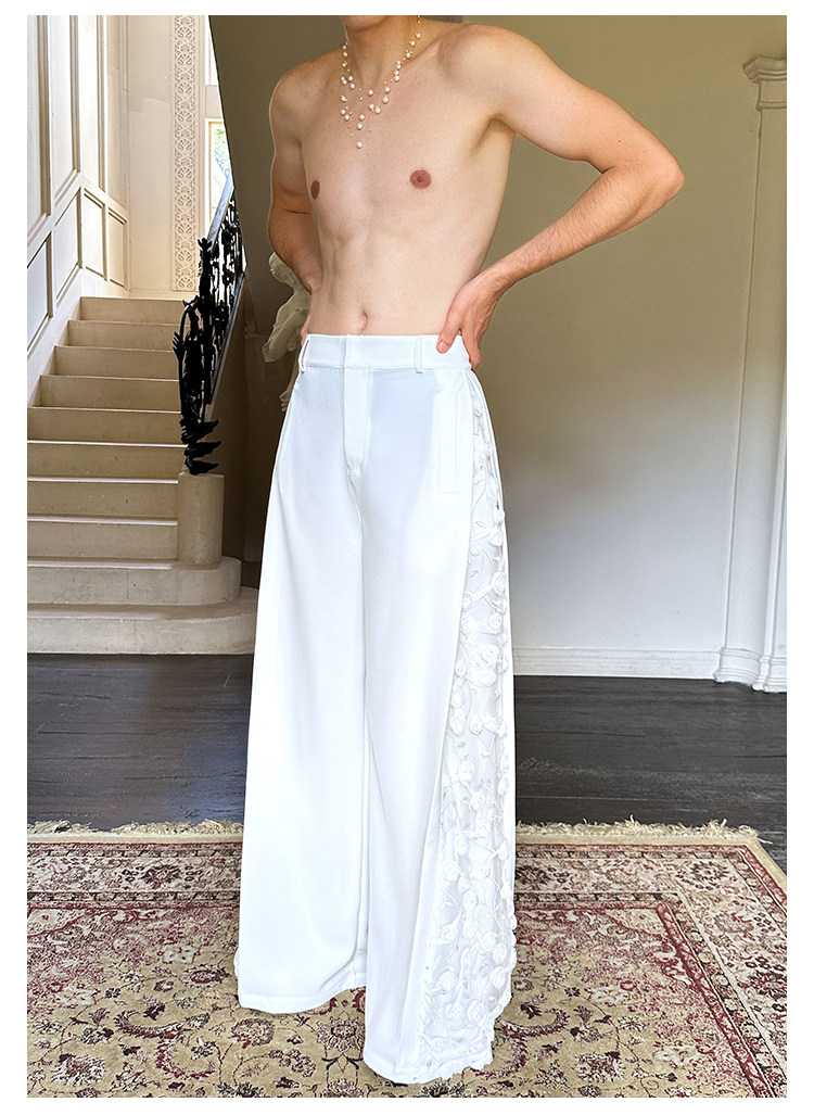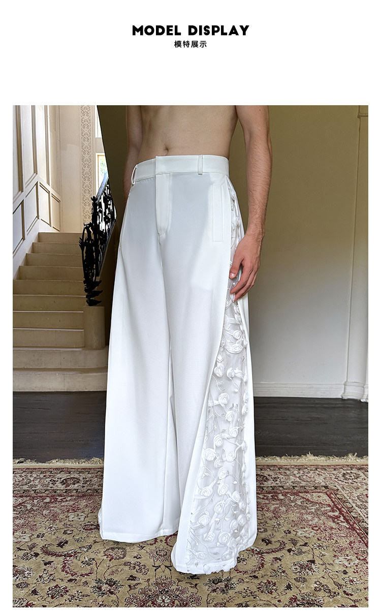 「Jeykoco」Unique Design Lace Floral Patchwork Casual Wide-Leg Pants for Men, Layered Suit Pants Skirt
