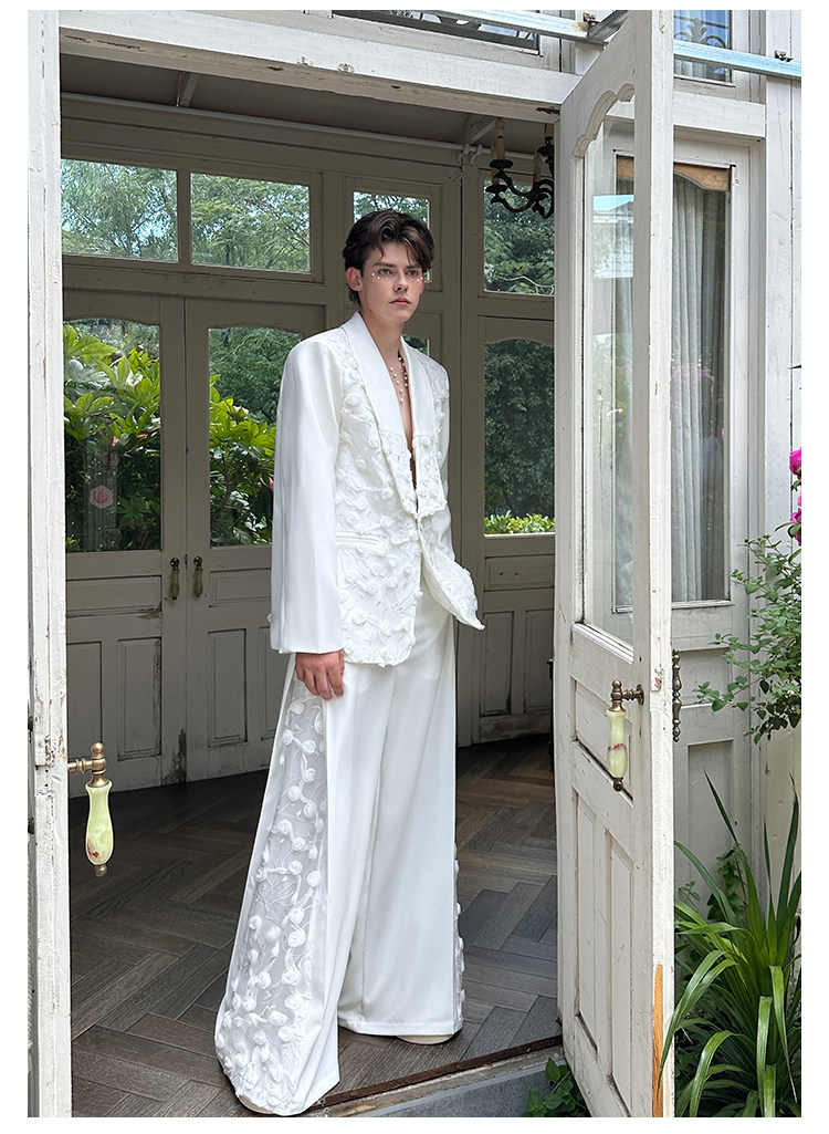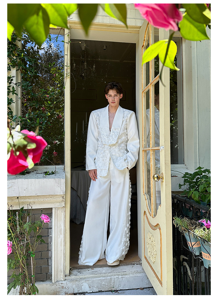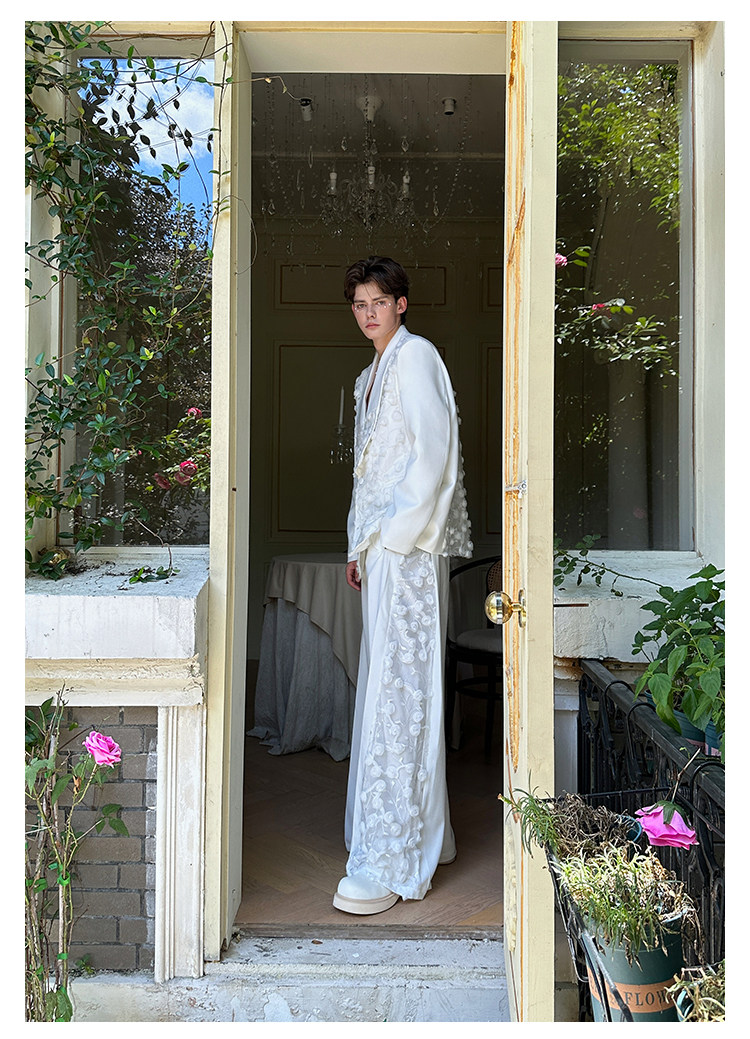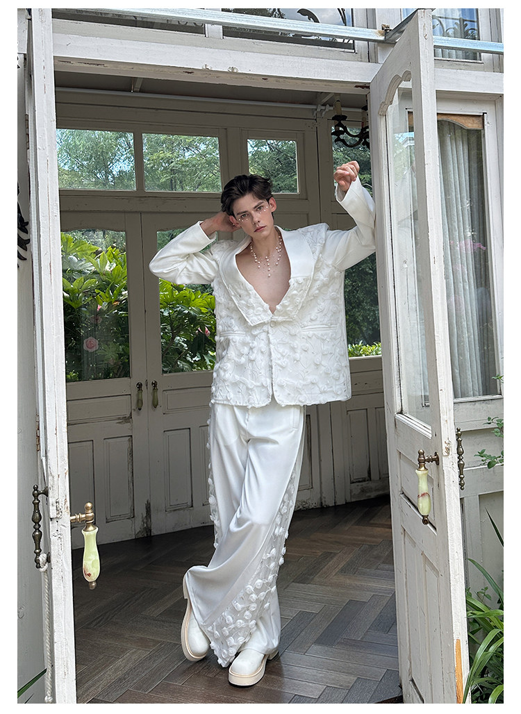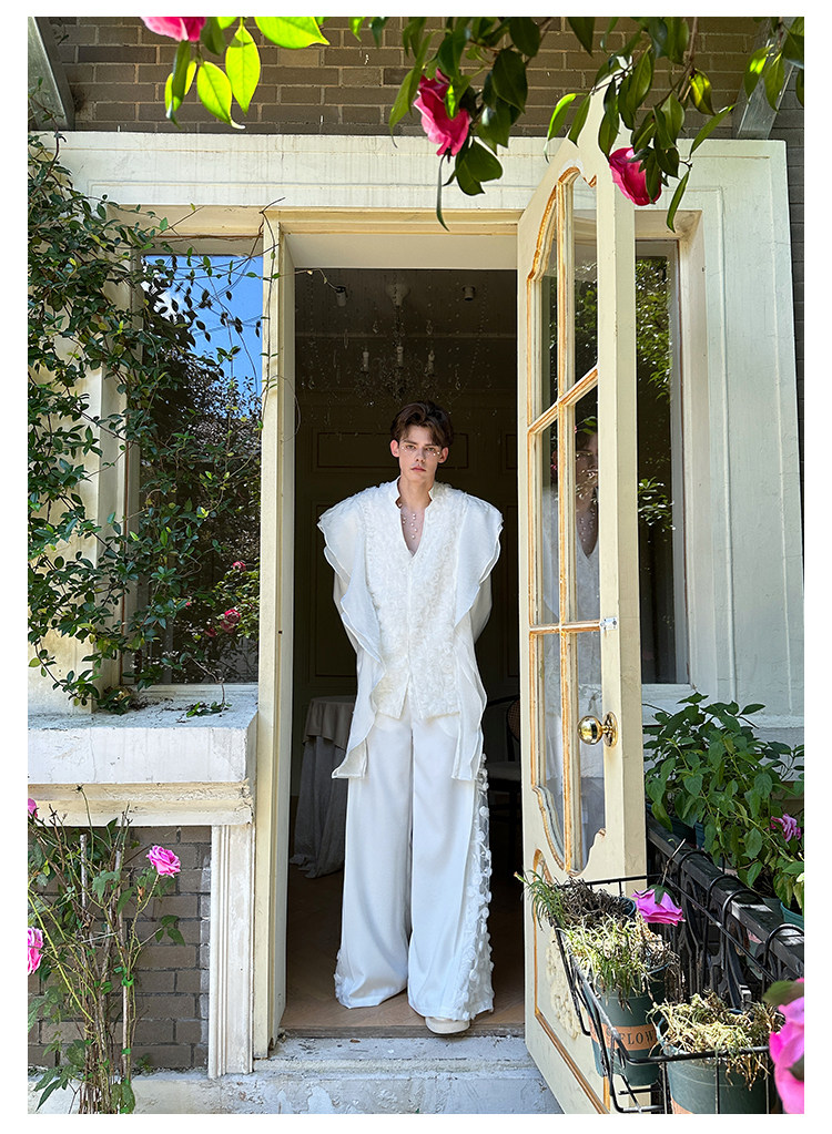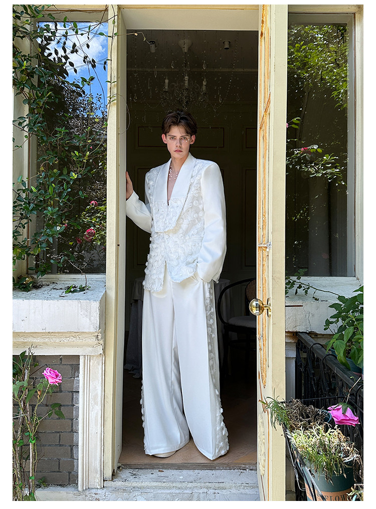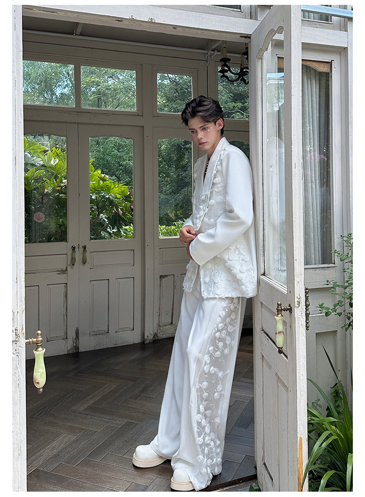 「Jeykoco」Unique Design Lace Floral Patchwork Casual Wide-Leg Pants for Men, Layered Suit Pants Skirt