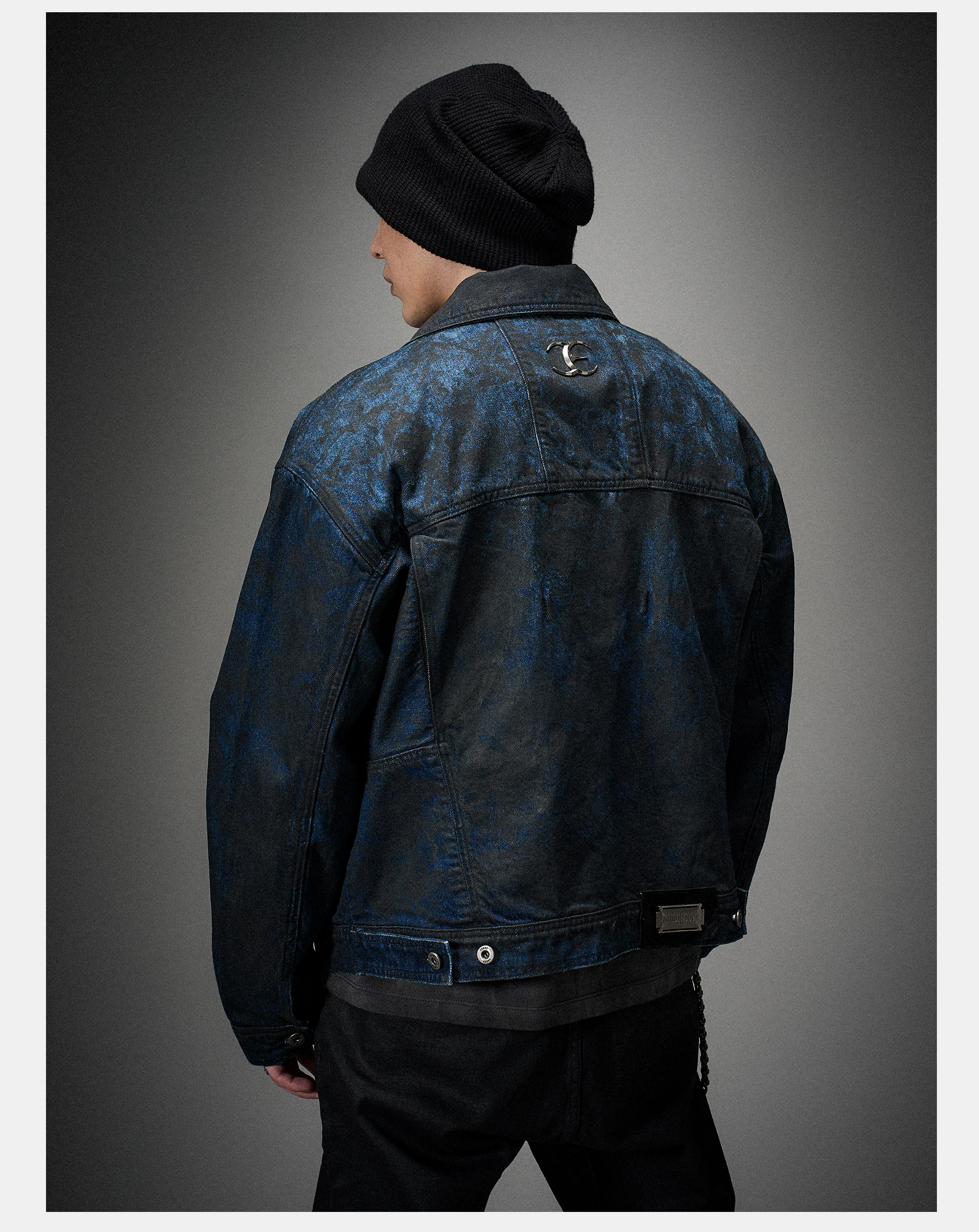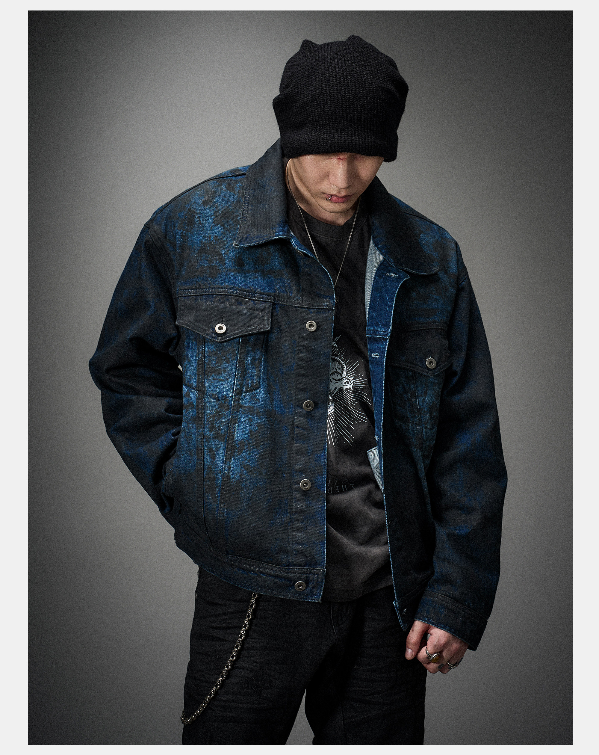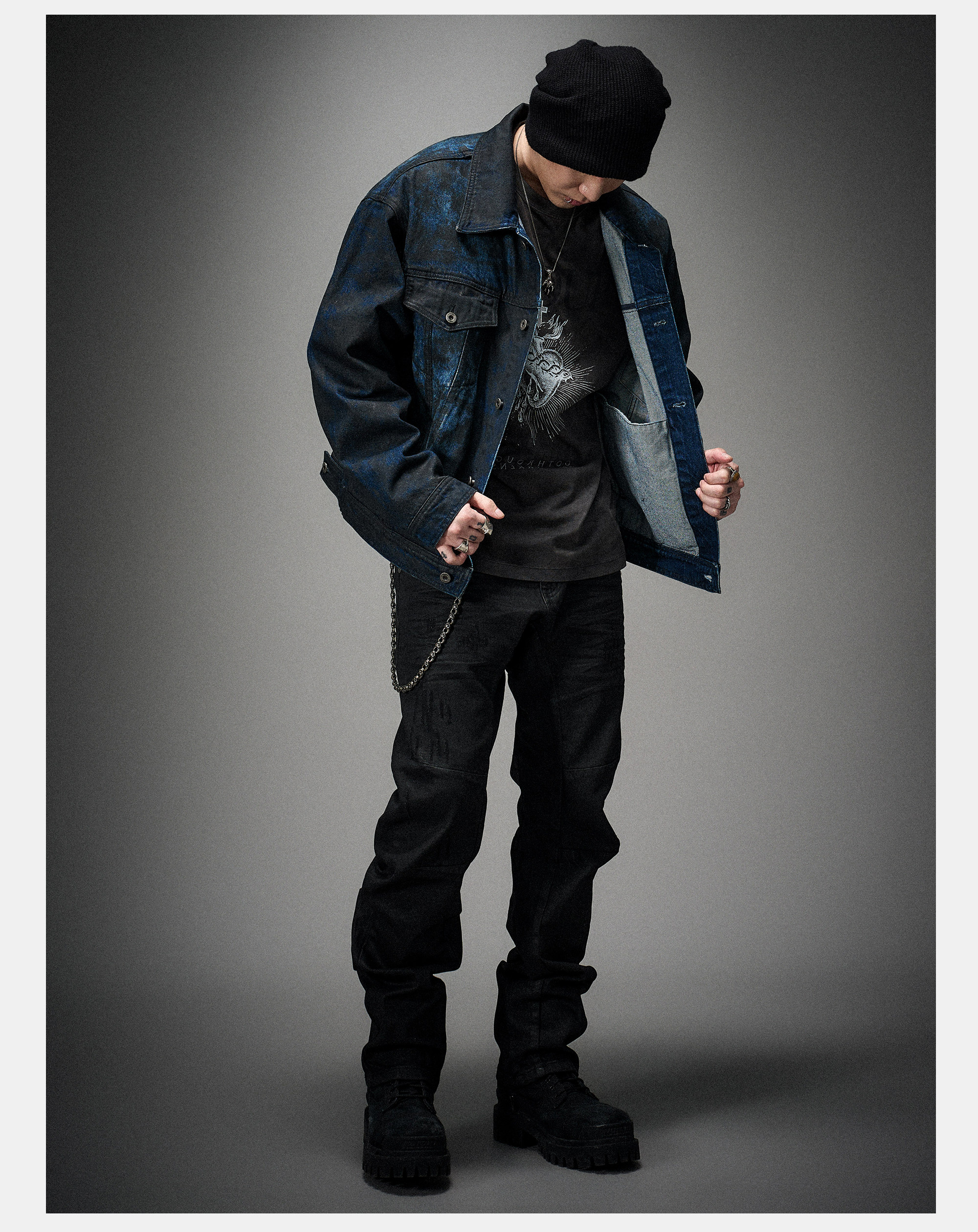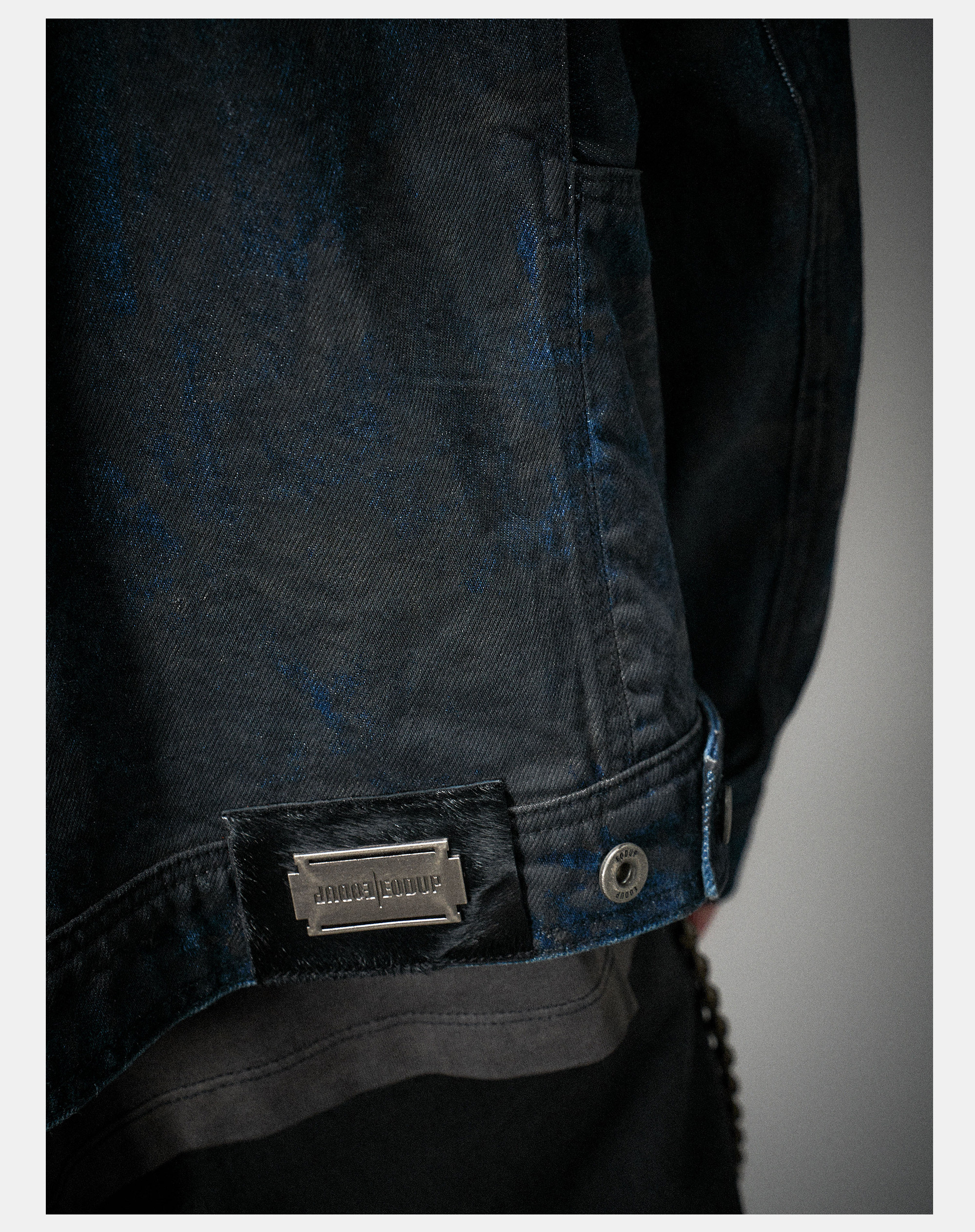 Eodup'Extreme Night' Mottled Ice Blue Gradient Dark Avant-Garde Heavy Industry Distressed Color Block Deconstructed Denim Jacket