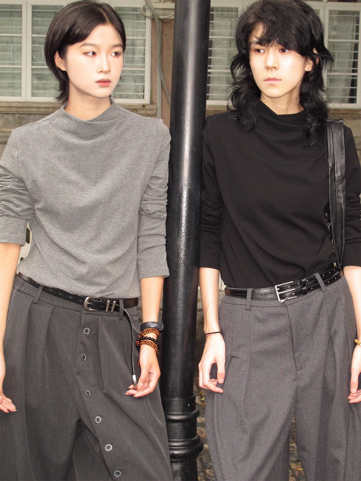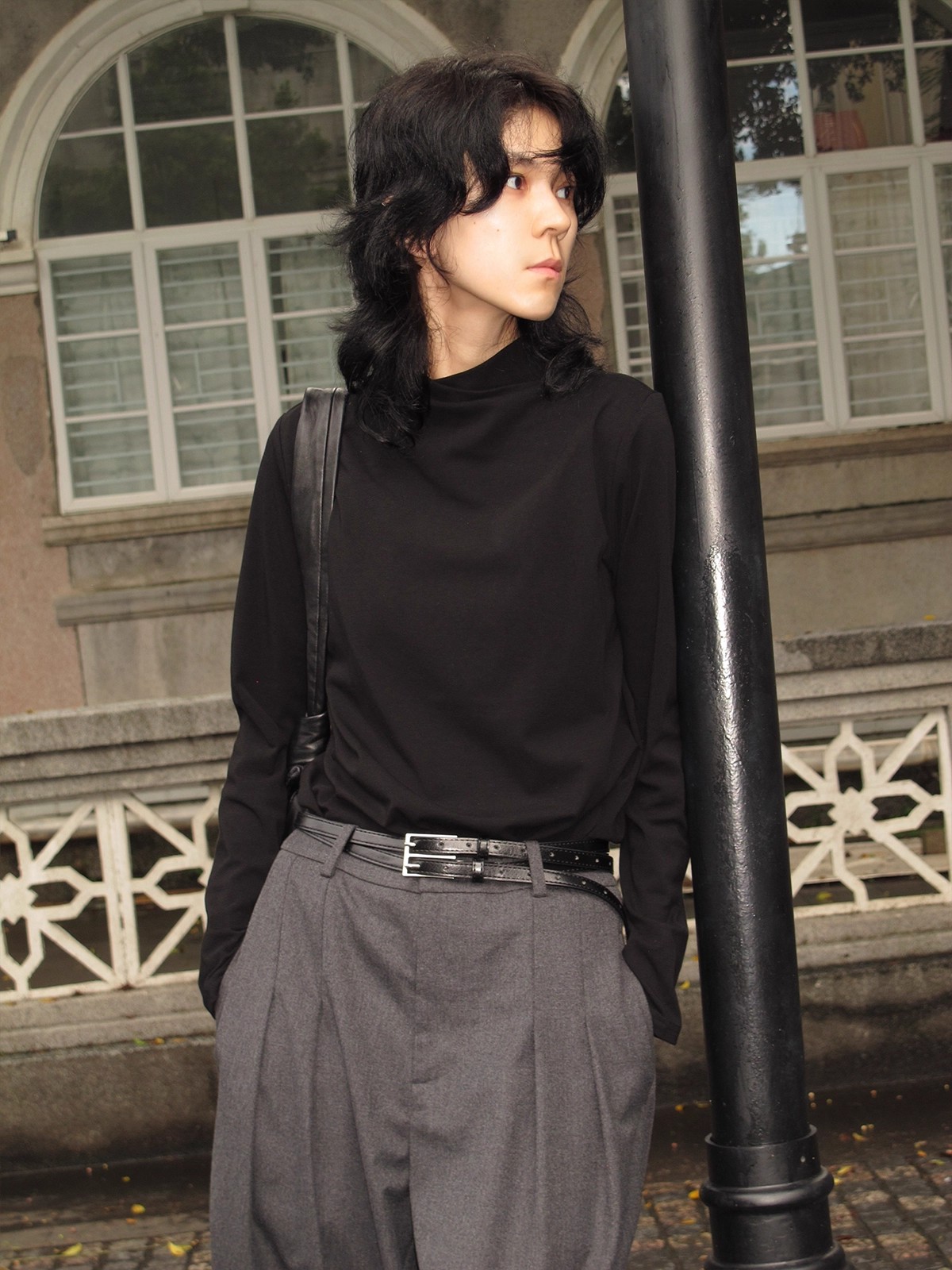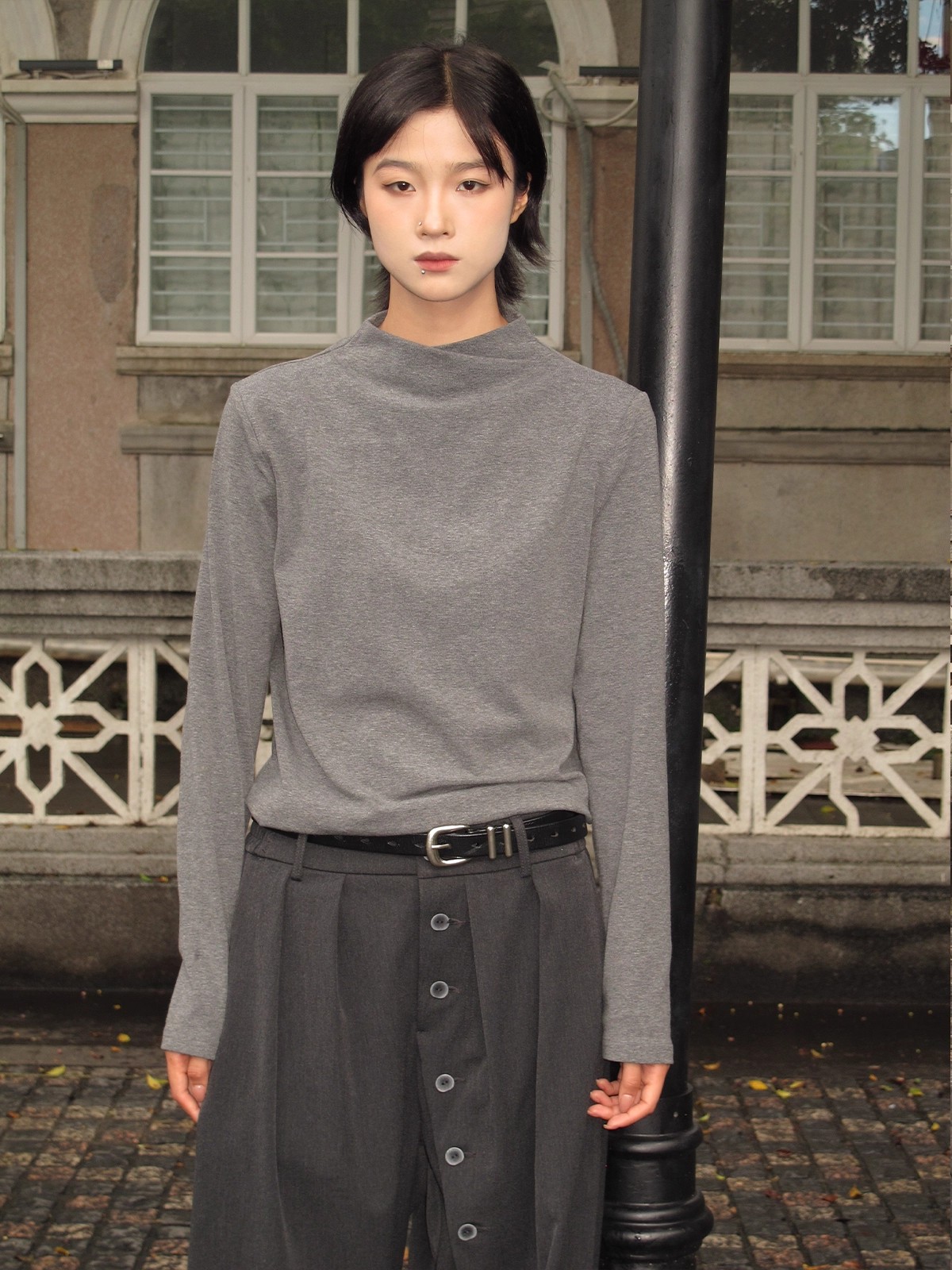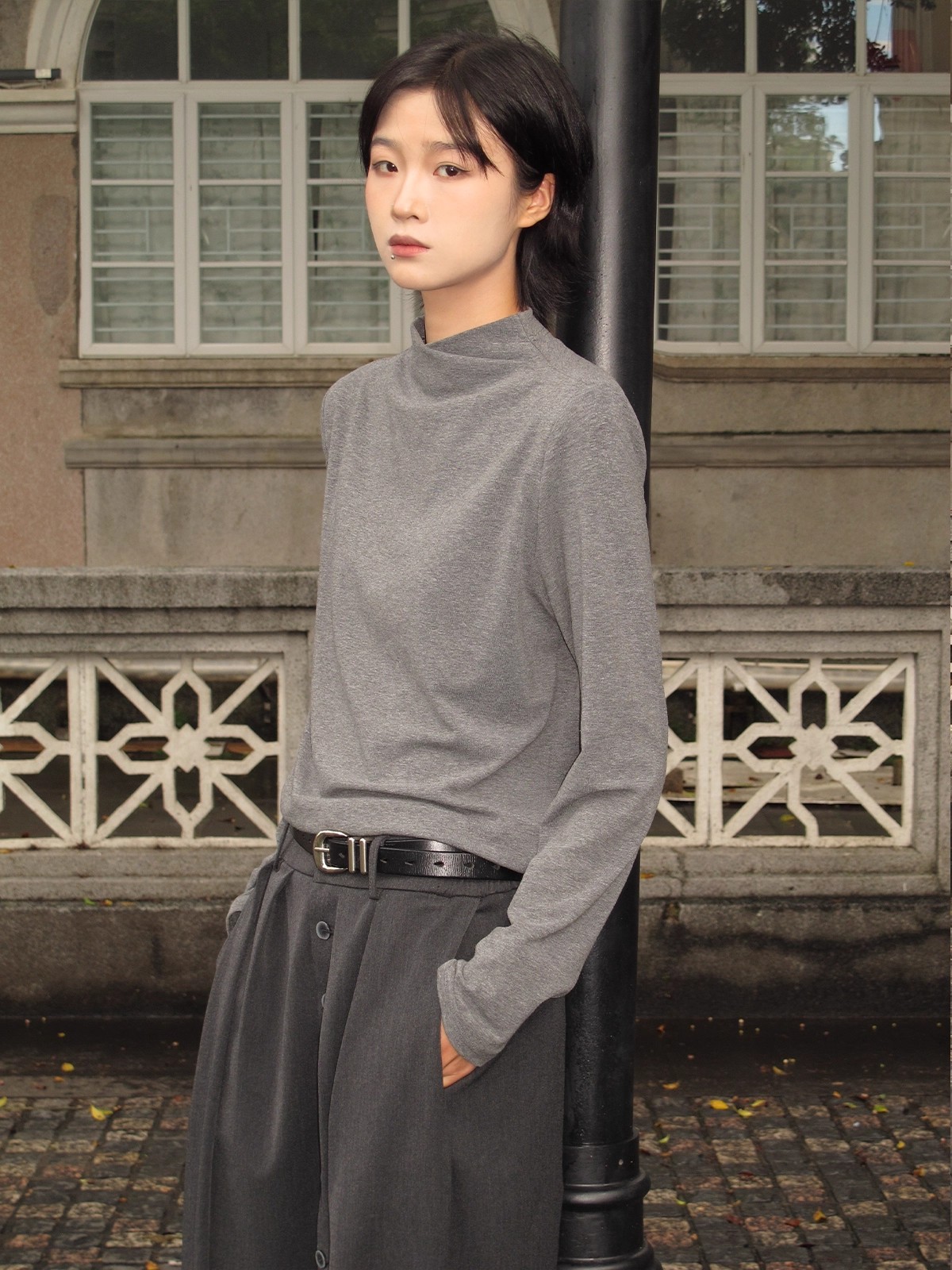 Sameuoo Free-Spirited Culture Cross Chimney Collar Straight Shoulder Long-Sleeve T-Shirt Autumn Unisex Basic Slim-Fit Top for Women