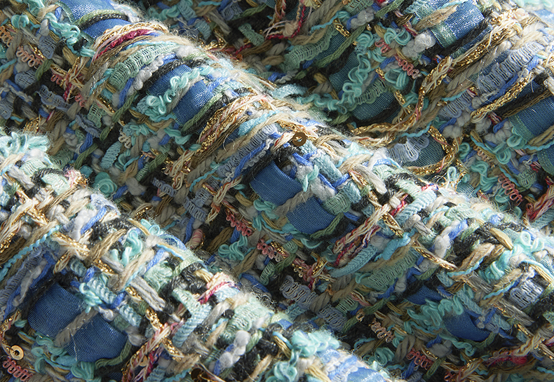 面料由金丝珠片和各种不同材质的蓝色纱交织而成