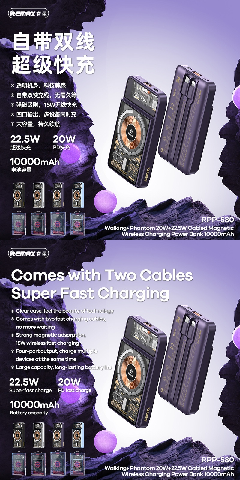 Remax Phantom 20W+22.5W Comes with a Magnetic Wireless Charger with a Transparent Punk Industrial Style Mobile Power Supply