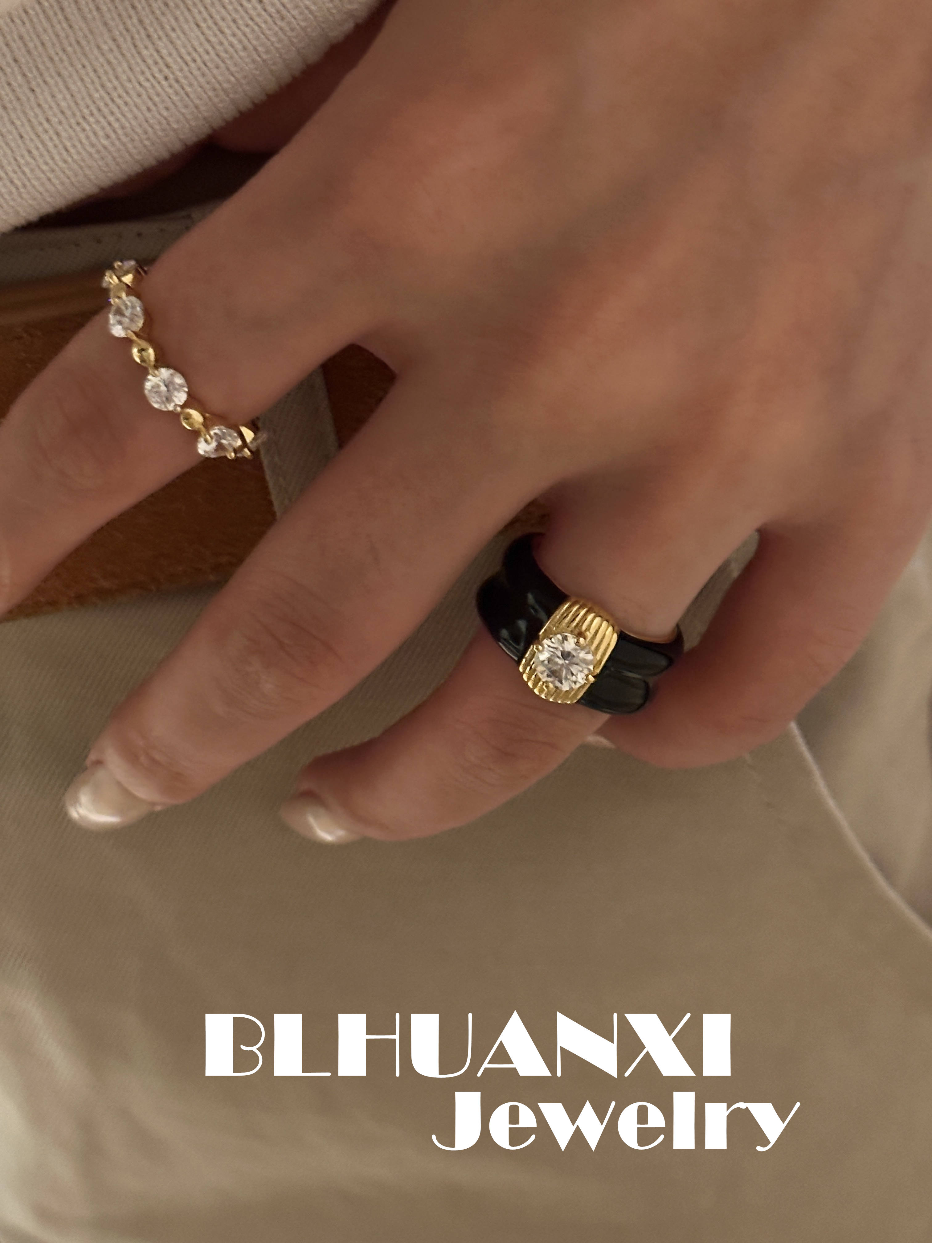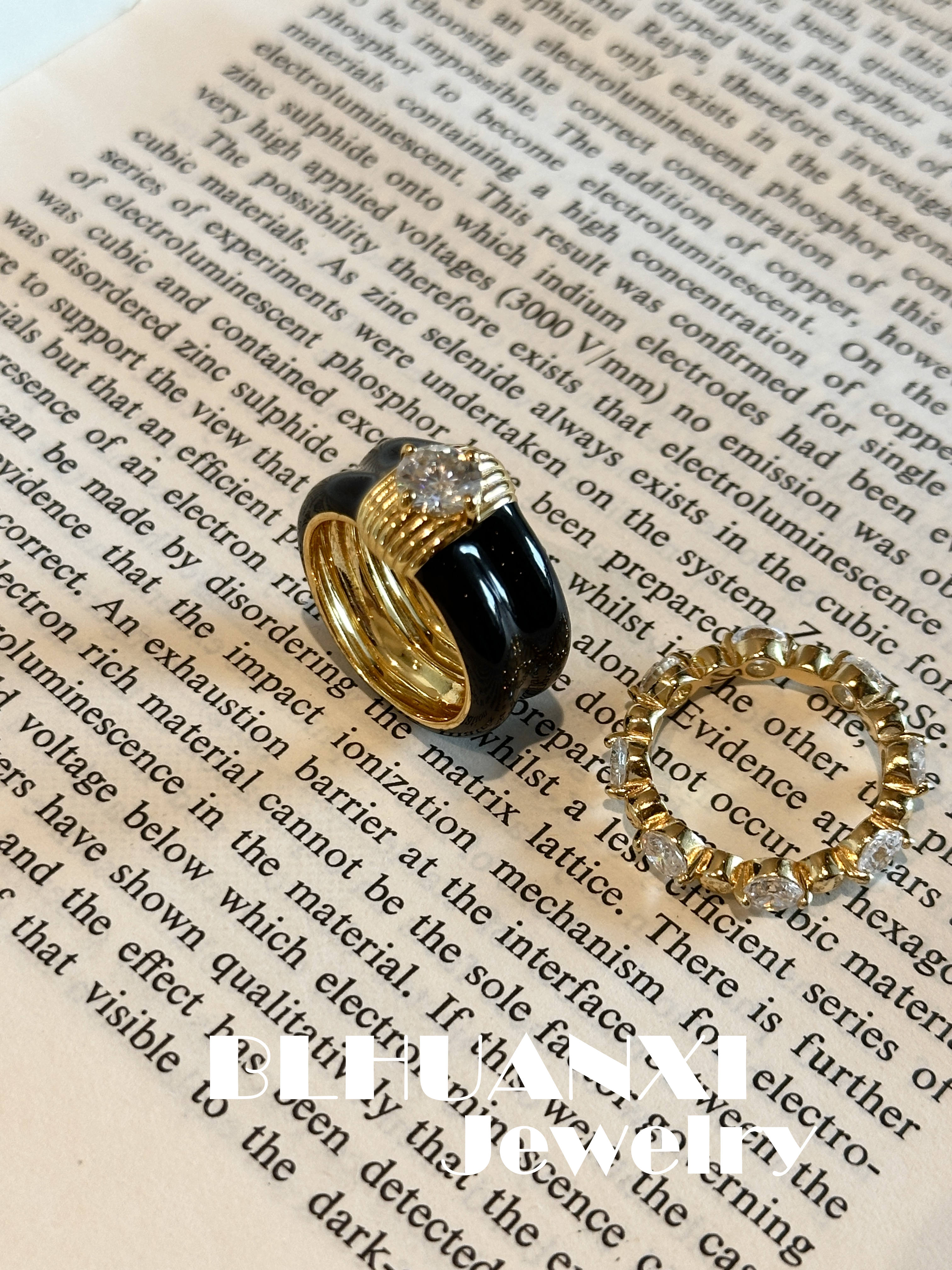 [Recognition and Joy] 925 Silver Gold-plated 925 Silver Gold-plated Mosan Diamond Black Gold Handmade Enamel Old Money Wind Ring